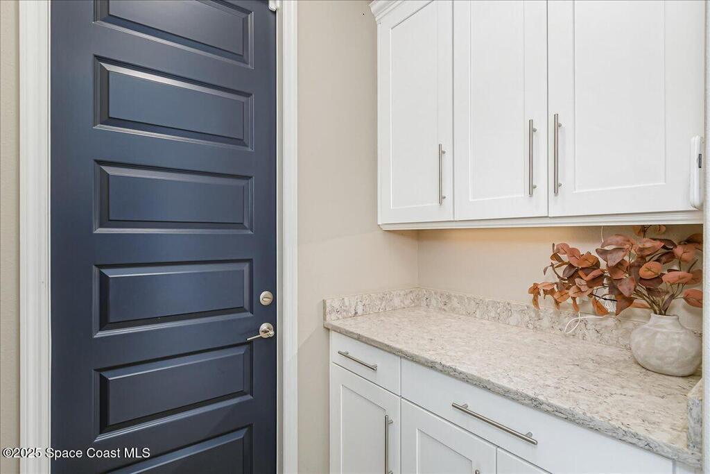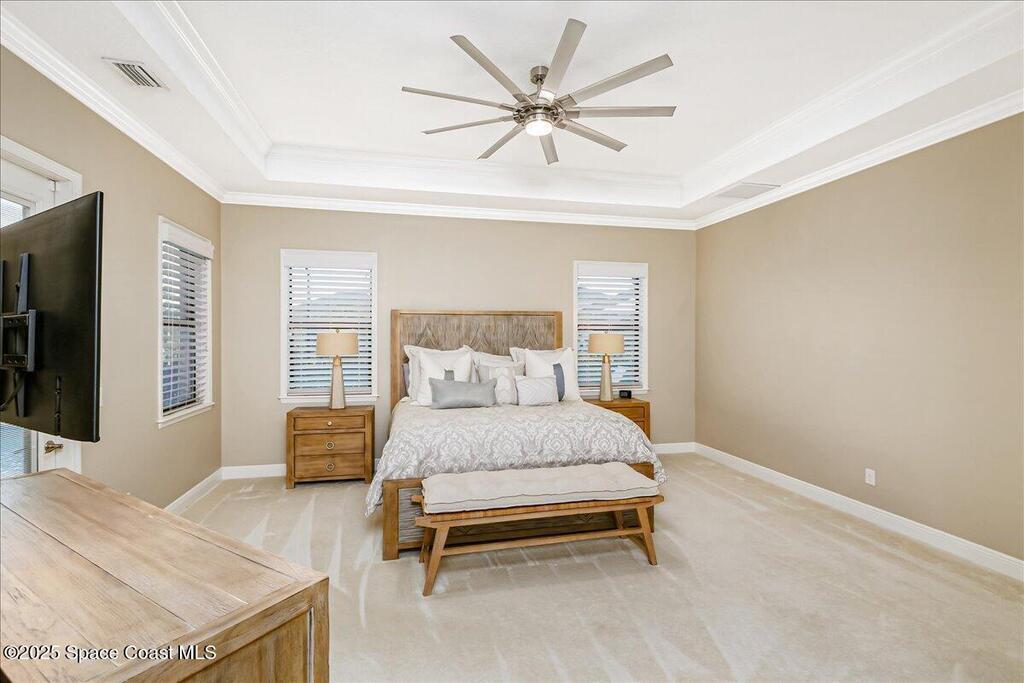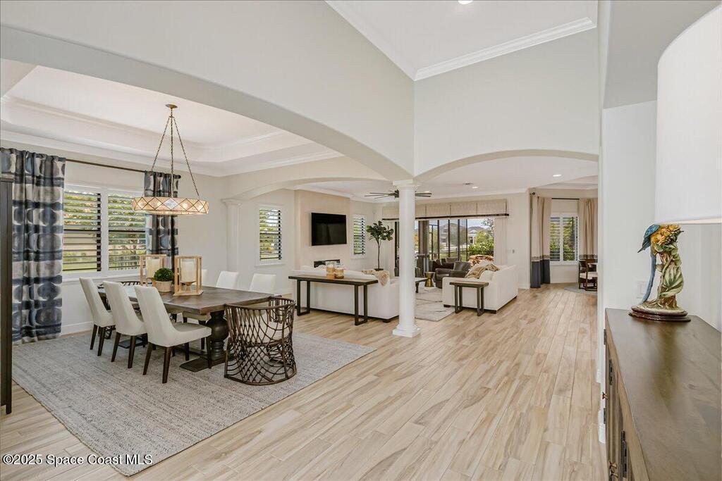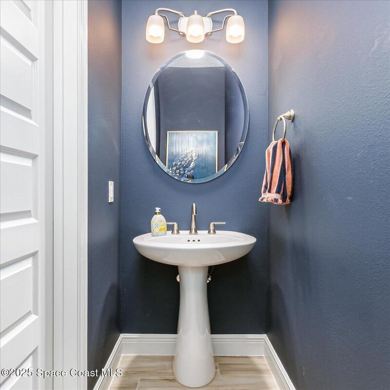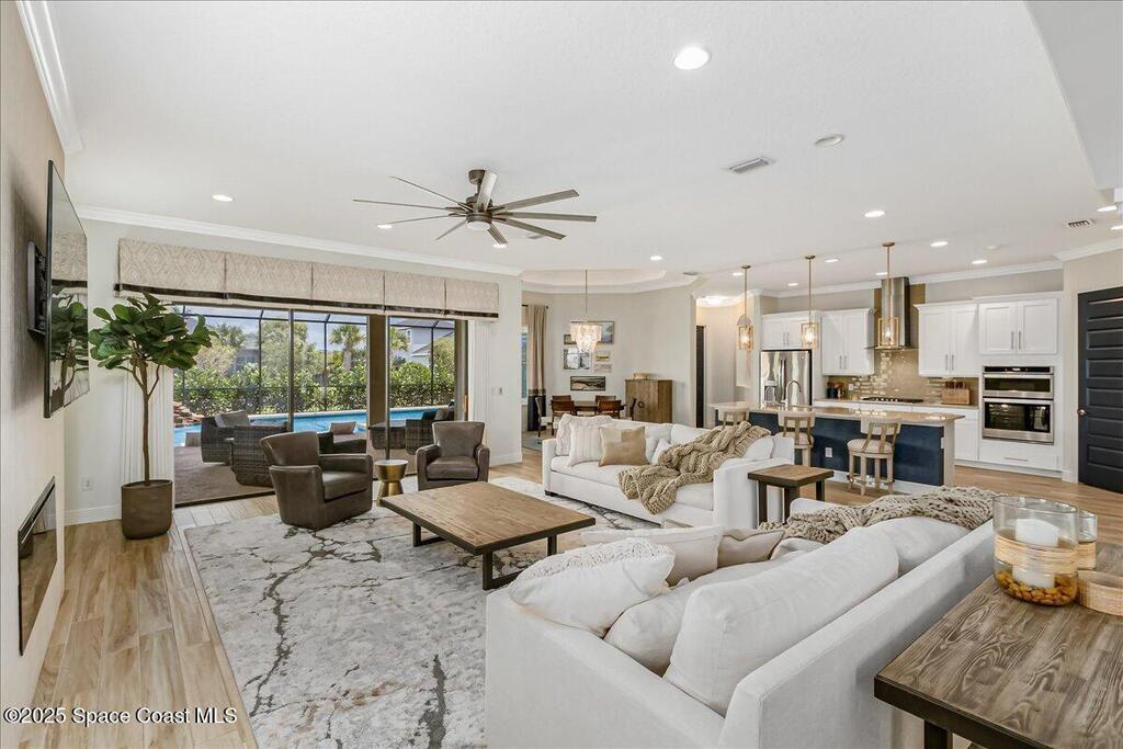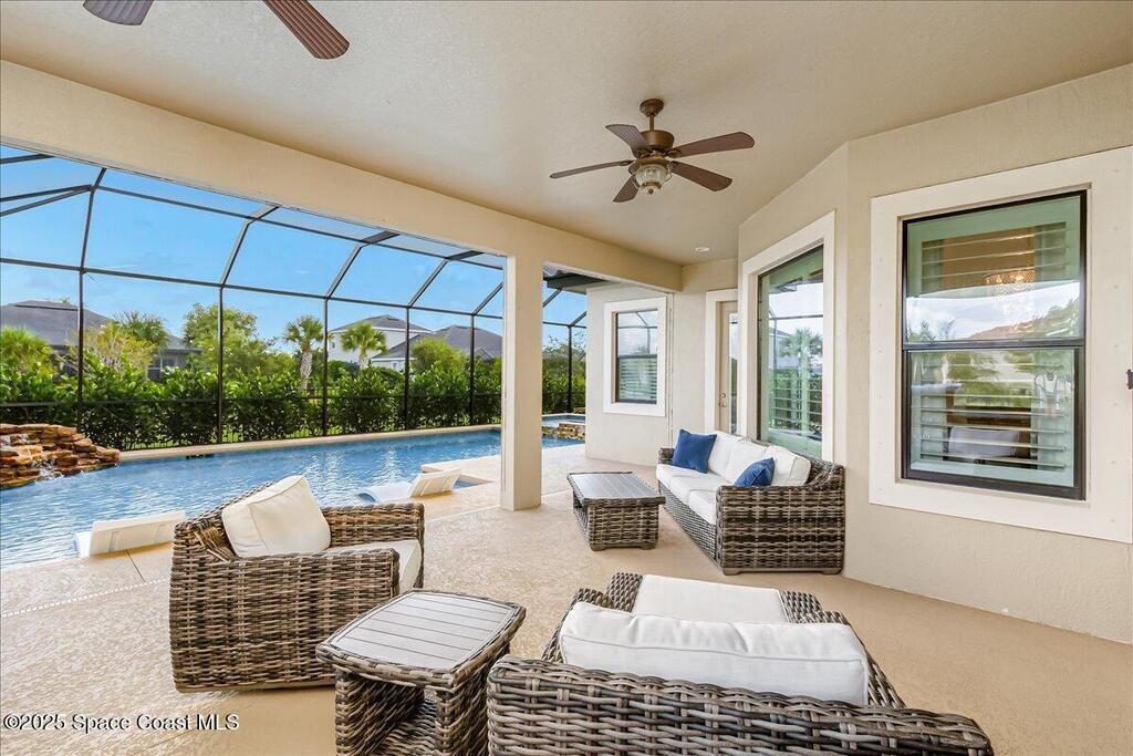 Luxurious executive pool home with sleek design finishes! Situates in one of Viera's premier gated communities, Kerrrington. Corner lot just shy of one third acre. Mature landscaping creates your own tropical paradise with heated pool and spa, 2 waterfalls, pool beach area, outdoor kitchen, high pitched screen enclosure. The interior of the home is designed in a calming neutral plate giving you a relaxed feeling all day long. This cook's kitchen has stainless steel appliances, quartz countertops, 42'' uppers, soft close cabinetry, large walk-in pantry with custom built all wood shelving and wine rack, and the seller's favorite a built in 'sonic ice' machine. Other features include barrel tile roof, 13' and 10' ceilings, 8' doors, tray ceilings, crown molding, plantation shutters, reverse osmosis water system, water softener, paver driveway and extra paver side-yard. Garage has extra side room for personal home gym or golf cart, 220v plug for an EV charger, NewAge storage system.