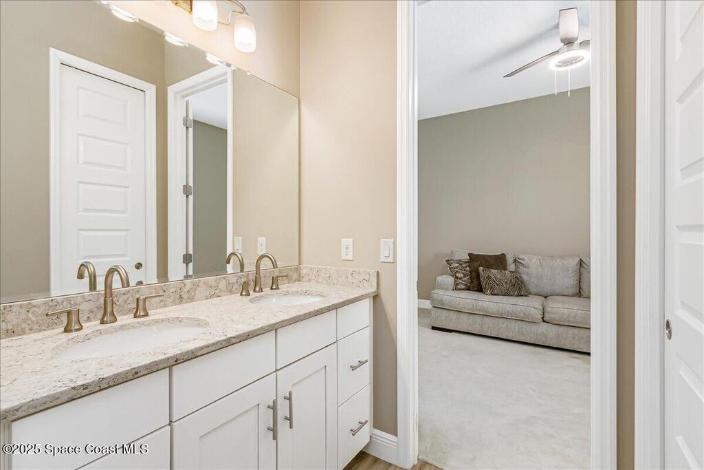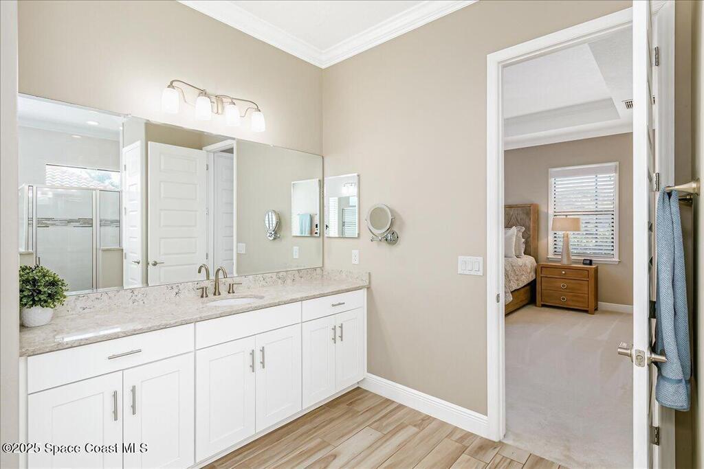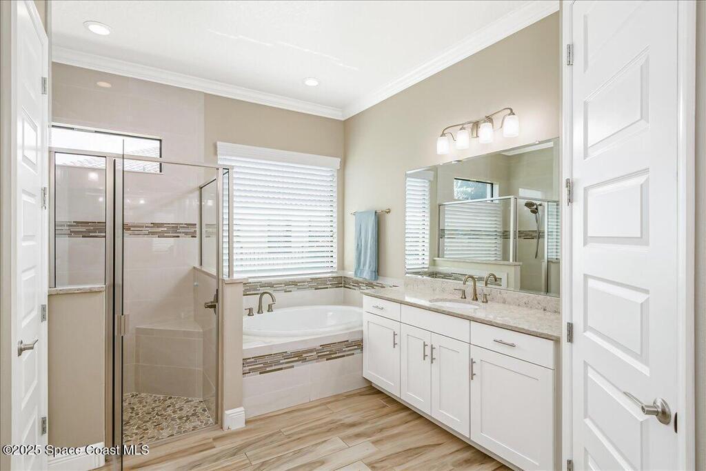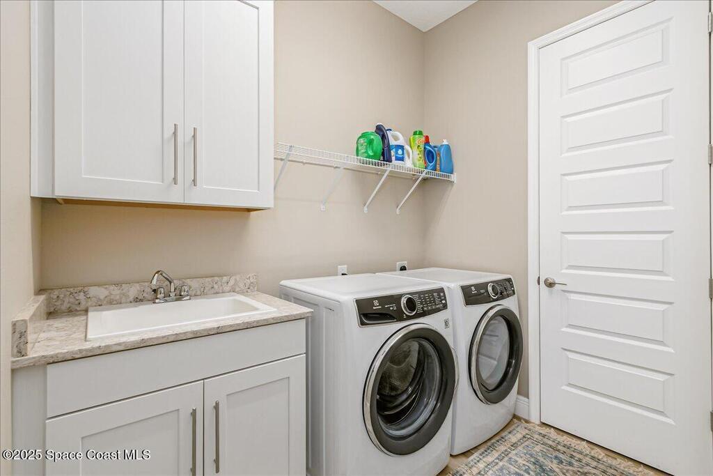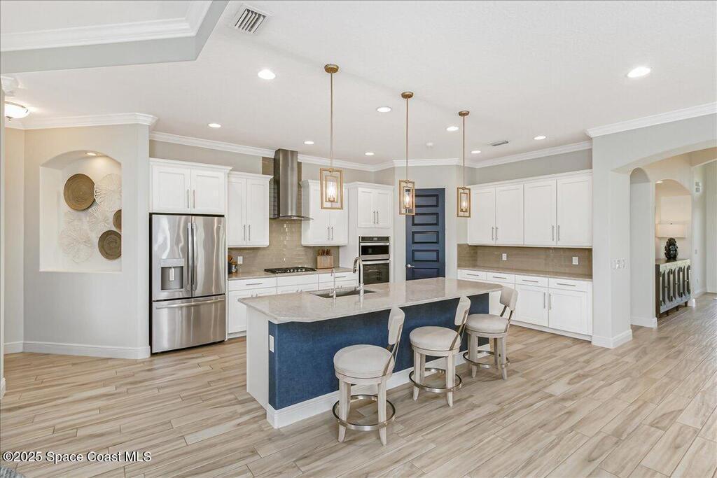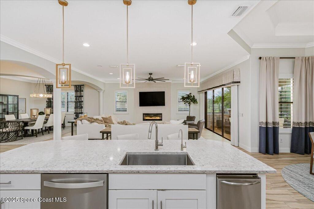 Luxurious executive pool home with sleek design finishes! Situates in one of Viera's premier gated communities, Kerrrington. Corner lot just shy of one third acre. Mature landscaping creates your own tropical paradise with heated pool and spa, 2 waterfalls, pool beach area, outdoor kitchen, high pitched screen enclosure. The interior of the home is designed in a calming neutral plate giving you a relaxed feeling all day long. This cook's kitchen has stainless steel appliances, quartz countertops, 42'' uppers, soft close cabinetry, large walk-in pantry with custom built all wood shelving and wine rack, and the seller's favorite a built in 'sonic ice' machine. Other features include barrel tile roof, 13' and 10' ceilings, 8' doors, tray ceilings, crown molding, plantation shutters, reverse osmosis water system, water softener, paver driveway and extra paver side-yard. Garage has extra side room for personal home gym or golf cart, 220v plug for an EV charger, NewAge storage system.