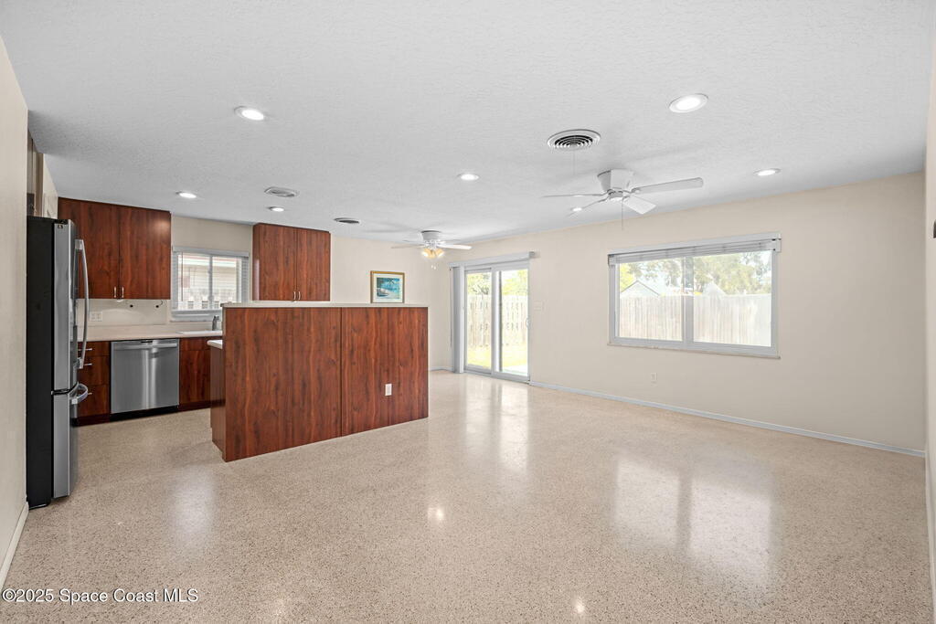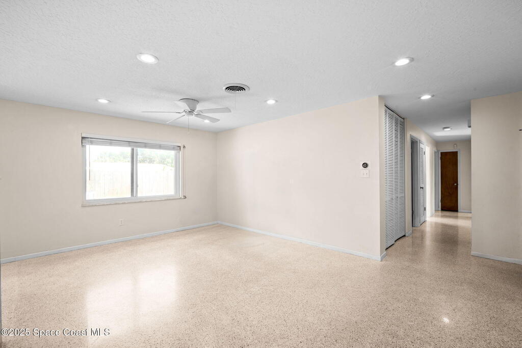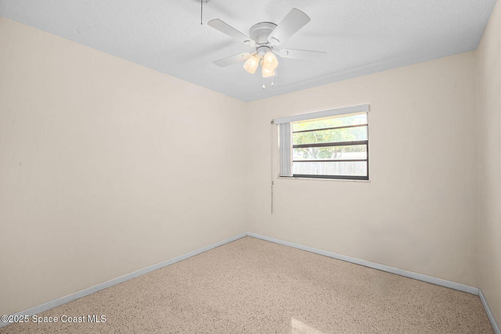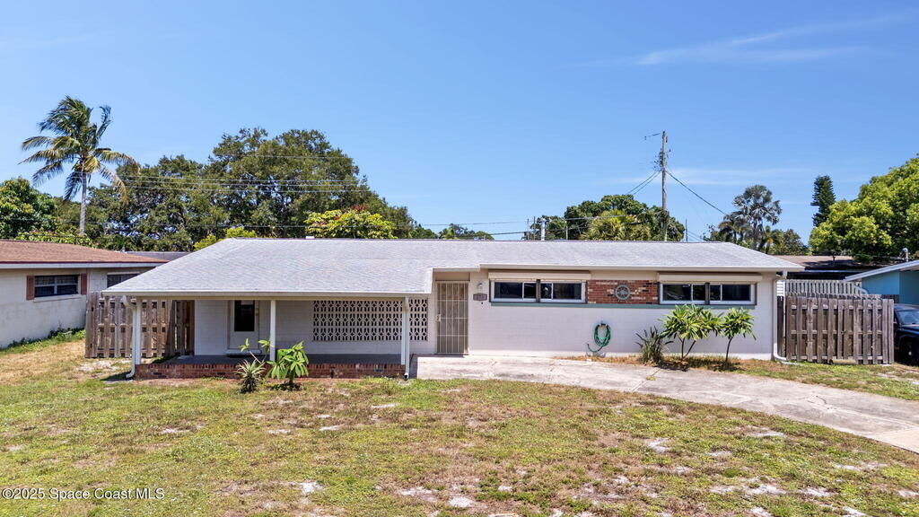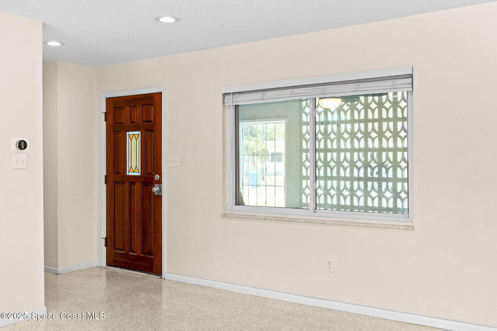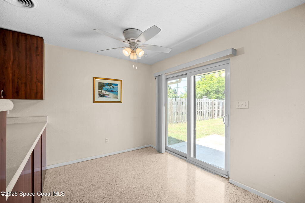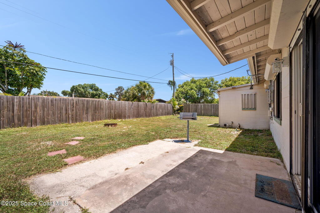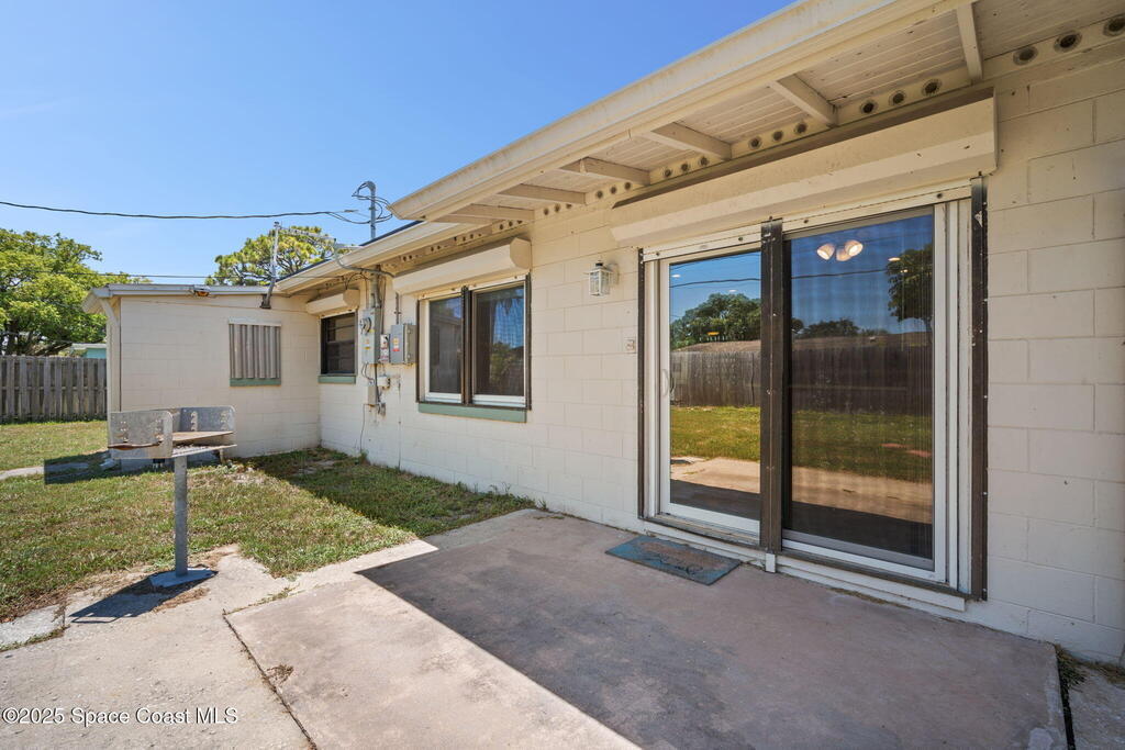 Welcome to this beautifully updated 4-bedroom, 2-bath home in the desirable Bel Aire subdivision of Merritt Island! Step inside to find pristine terrazzo floors and LED recessed lighting throughout. The kitchen shines with newer energy-efficient stainless steel appliances. Custom cabinetry in kitchen, laundry room, and bathrooms with soft close drawers and adjustable shelving. A smart thermostat adds modern convenience and energy savings. Both bathrooms have been tastefully renovated, and the indoor laundry offers added ease. Enjoy peace of mind with a 200-amp panel featuring a generator hookup, a mix of roll-down and accordion shutters, and solar panels to help offset utility costs. The spacious, fully fenced backyard offers a shed, a shallow well for irrigation, and plenty of room to add a pool. This move-in ready gem blends comfort, efficiency, and practicality--schedule your tour today! Roof - 2020, AC - 2022, Amp to 200 - 2016, Tankless WH - 2016, Windows - 2010, Solar - 2024
