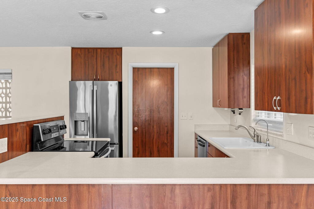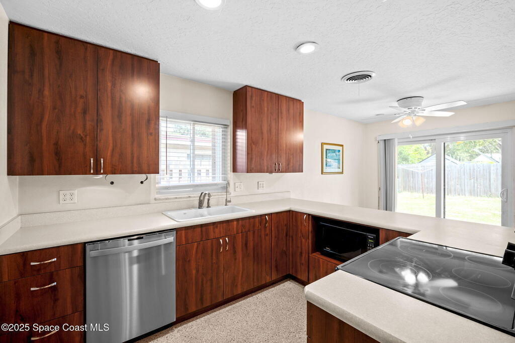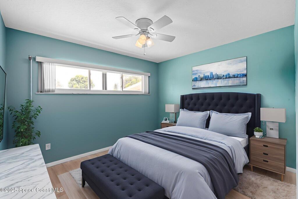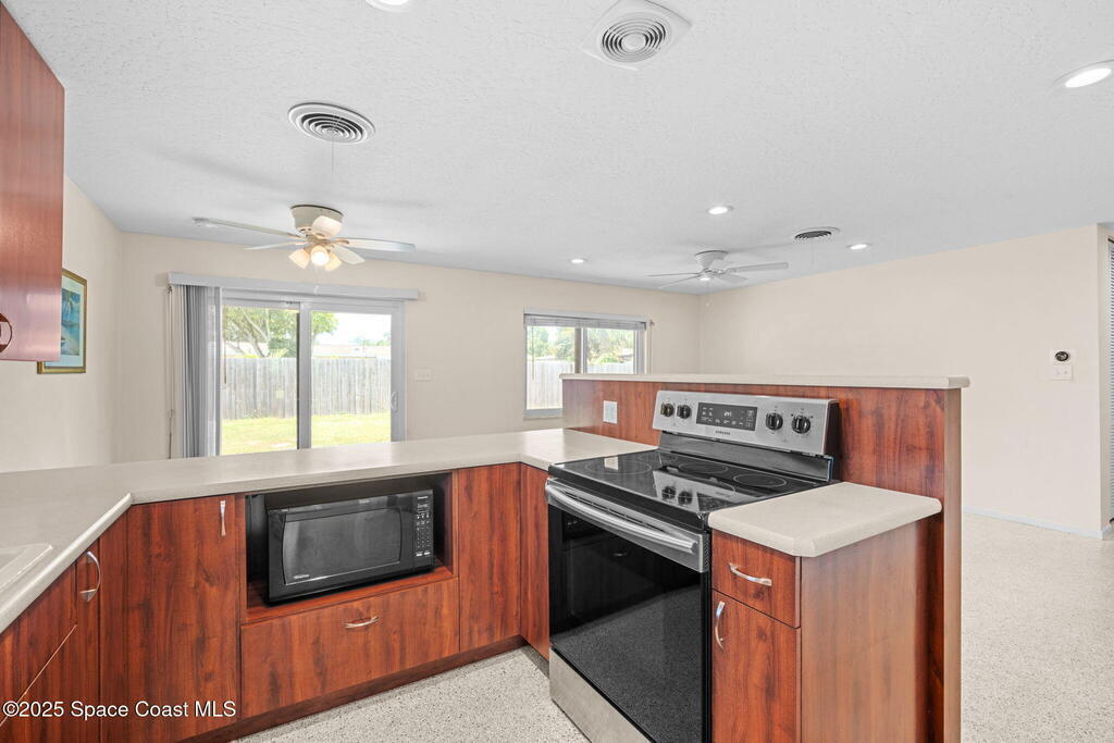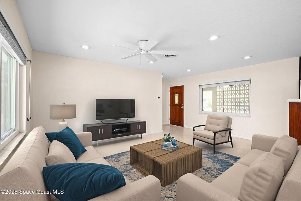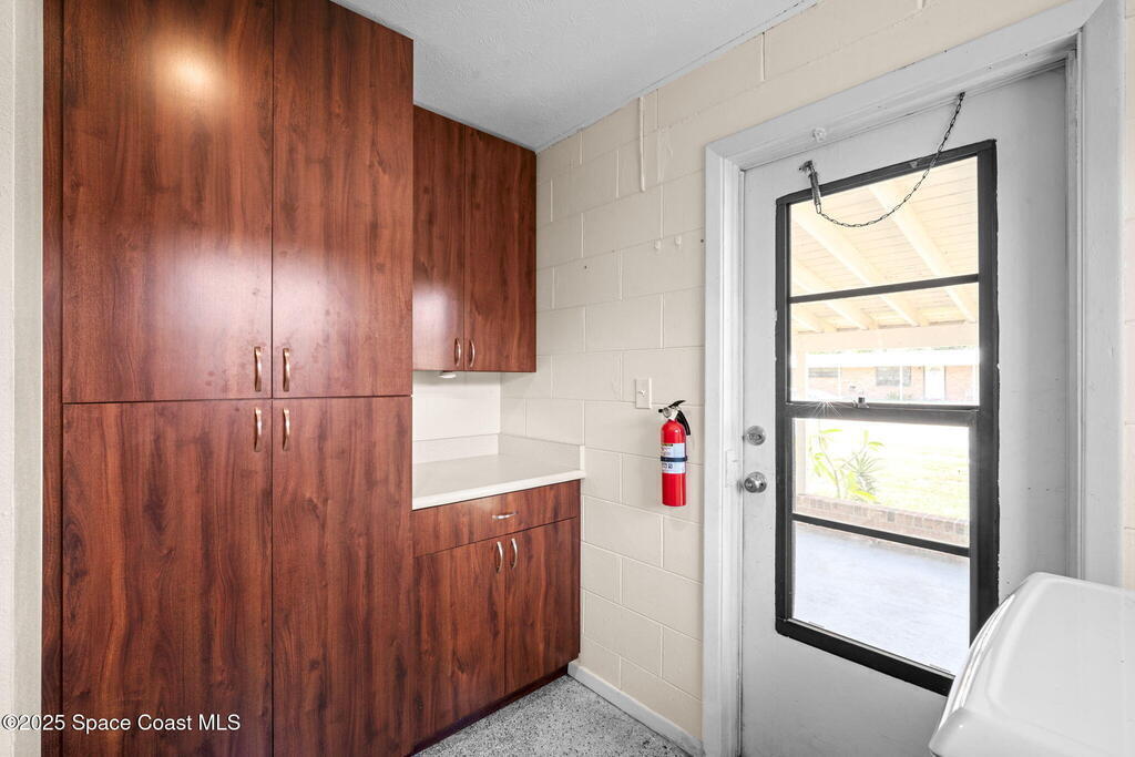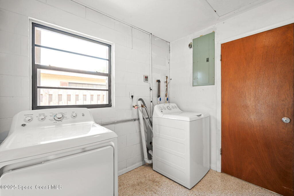 Welcome to this beautifully updated 4-bedroom, 2-bath home in the desirable Bel Aire subdivision of Merritt Island! Step inside to find pristine terrazzo floors and LED recessed lighting throughout. The kitchen shines with newer energy-efficient stainless steel appliances. Custom cabinetry in kitchen, laundry room, and bathrooms with soft close drawers and adjustable shelving. A smart thermostat adds modern convenience and energy savings. Both bathrooms have been tastefully renovated, and the indoor laundry offers added ease. Enjoy peace of mind with a 200-amp panel featuring a generator hookup, a mix of roll-down and accordion shutters, and solar panels to help offset utility costs. The spacious, fully fenced backyard offers a shed, a shallow well for irrigation, and plenty of room to add a pool. This move-in ready gem blends comfort, efficiency, and practicality--schedule your tour today! Roof - 2020, AC - 2022, Amp to 200 - 2016, Tankless WH - 2016, Windows - 2010, Solar - 2024