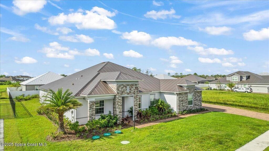 Still time to close before Christmas! The Enclave at Lake Washington, a hidden gem just minutes from town and centrally located on the Space Coast. This gated community is perfect for walking, running, biking. Like New, move in ready. Stone-accented single story home with metal roof, hurricane impact windows, and 3-car garage on.34 acre lot. Open floor plan can easily accomodate your lifestyle, be it multi-generational living, large family, or working from home. Gourmet kitchen with double oven, cooktop, quartz countertops and large island seating.Tile floor throughout. Primary suite features oversized shower, garden tub, separate vanities, walk in closets. Two bedrooms w/ full bath border game/formal dining room including wet bar, beverage cooler & ample cabinets. Create your backyard oasis. Trussed 40x10 porch & pool bath is ready for you to add pool. EZ access to I-95 & US 1 for commuting to SpaceX, Blue Origin, Patrick SFS, L3Harris and others. Short drive to Beaches, River, EGAD.