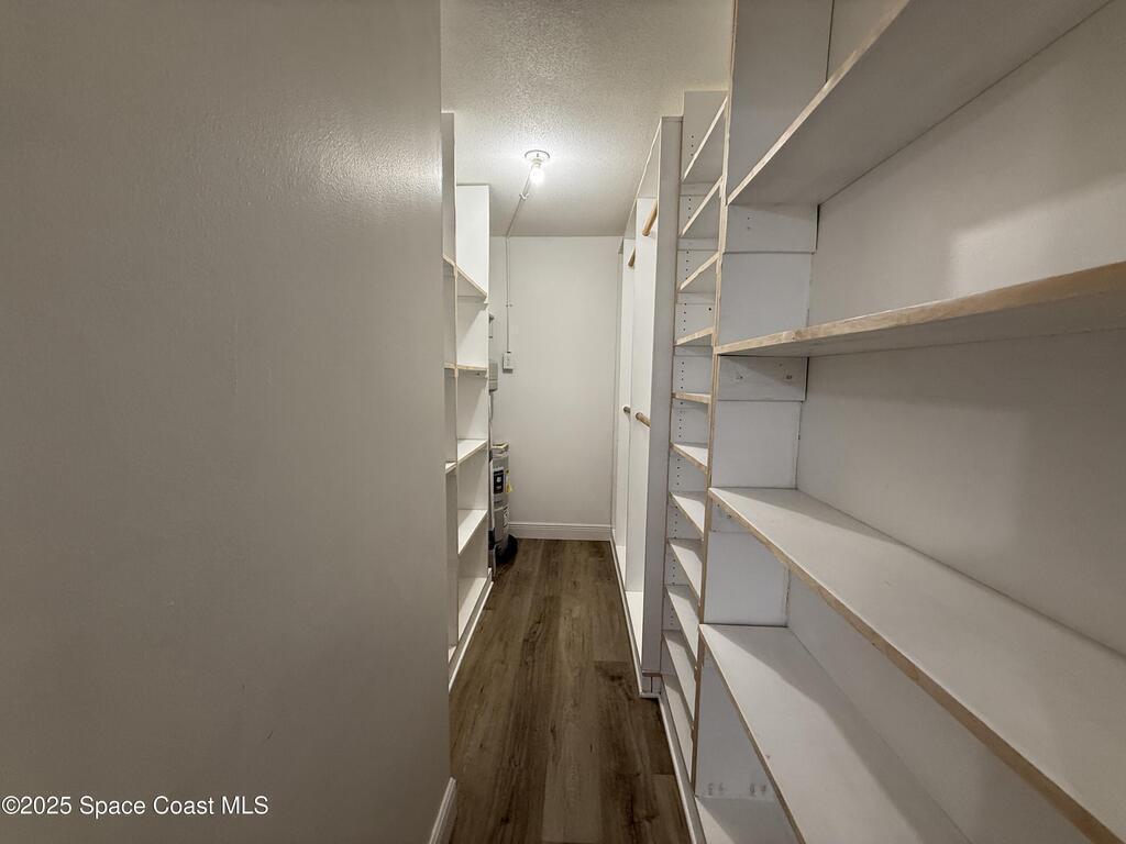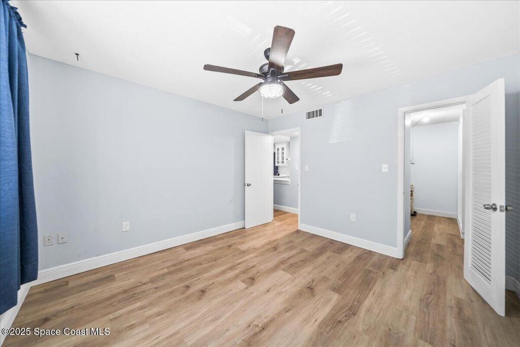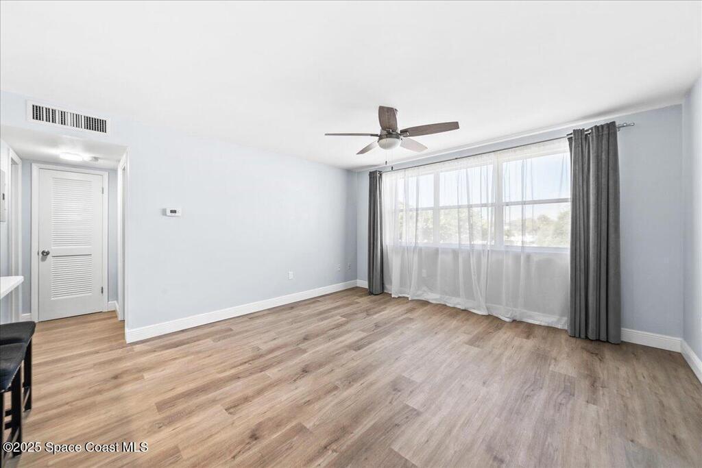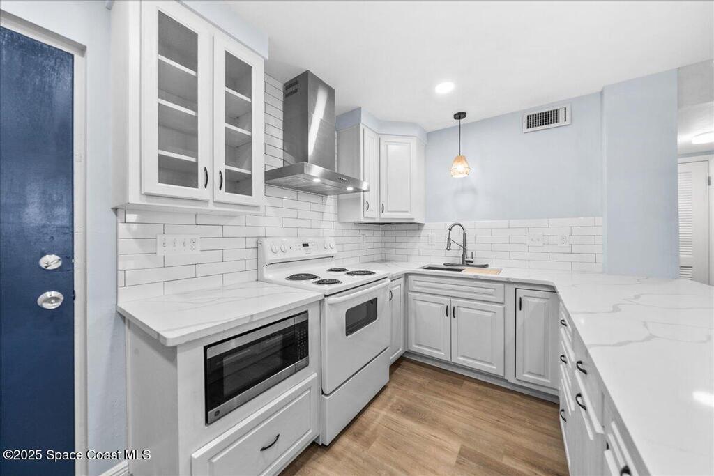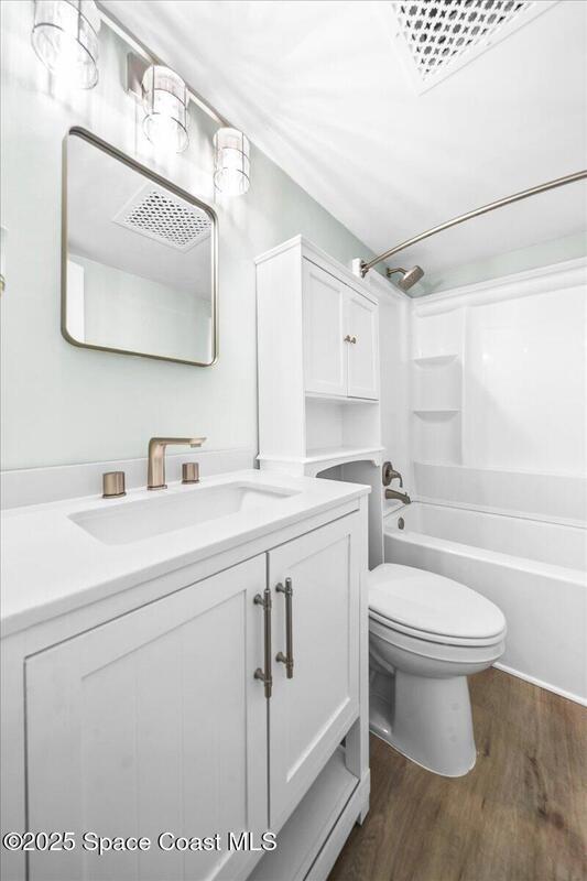 Beautifully remodeled condo just minutes from the beach and major highways! Featuring waterproof luxury vinyl plank flooring and 6'' baseboards throughout, this home blends style and function. The kitchen and bath were professionally renovated in 2022 with all-wood cabinets, quartz countertops, breakfast bar, pull-out pantry, coffee bar, and more. Appliances include a GE 3-in-1 microwave (air fryer/convection/broiler), the Z-Line 500 CFM range hood with turbo setting. Stove, HVAC and a refrigerator are maintained by the condo association. Hug walk in custom closet. The 30-gallon water heater (2022) is programmable and includes an expansion tank. Thoughtfully upgraded with 12'' drawers, lazy Susan, pull-out trash bin, and hanging pot cabinet. This move-in ready unit offers low-maintenance living and is close to beaches, shopping, dining, and all the Space Coast has to offer! Cash only. Buyer must submit Co-Op application, credit check and board approval.