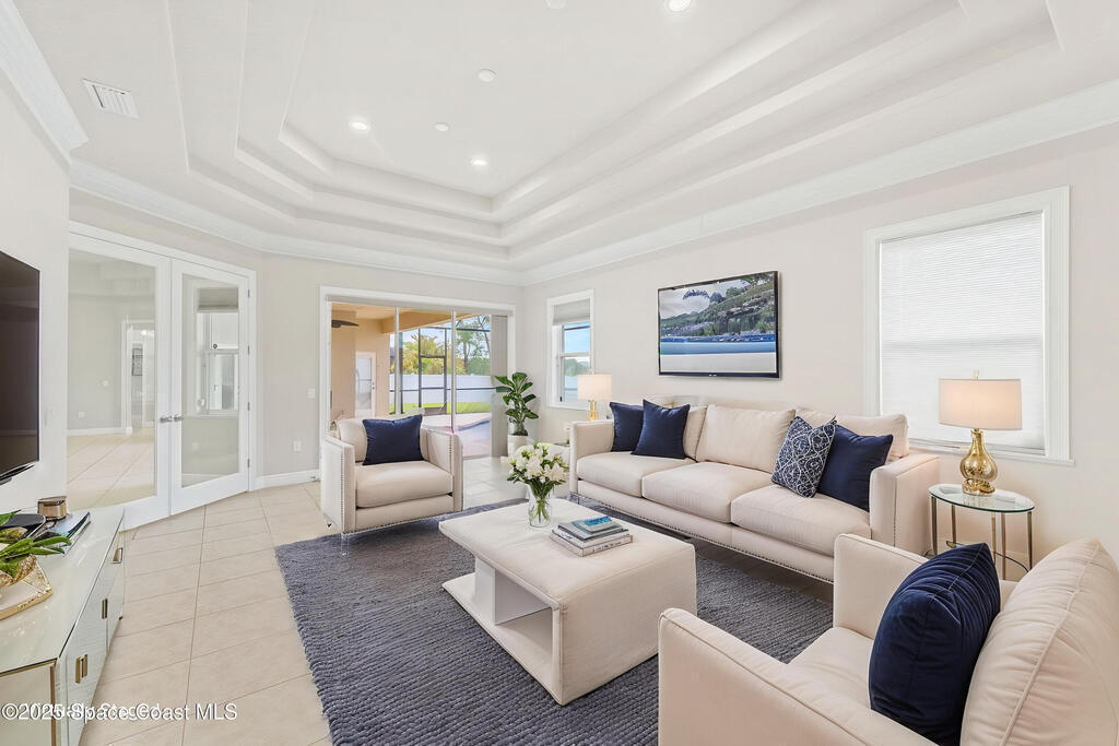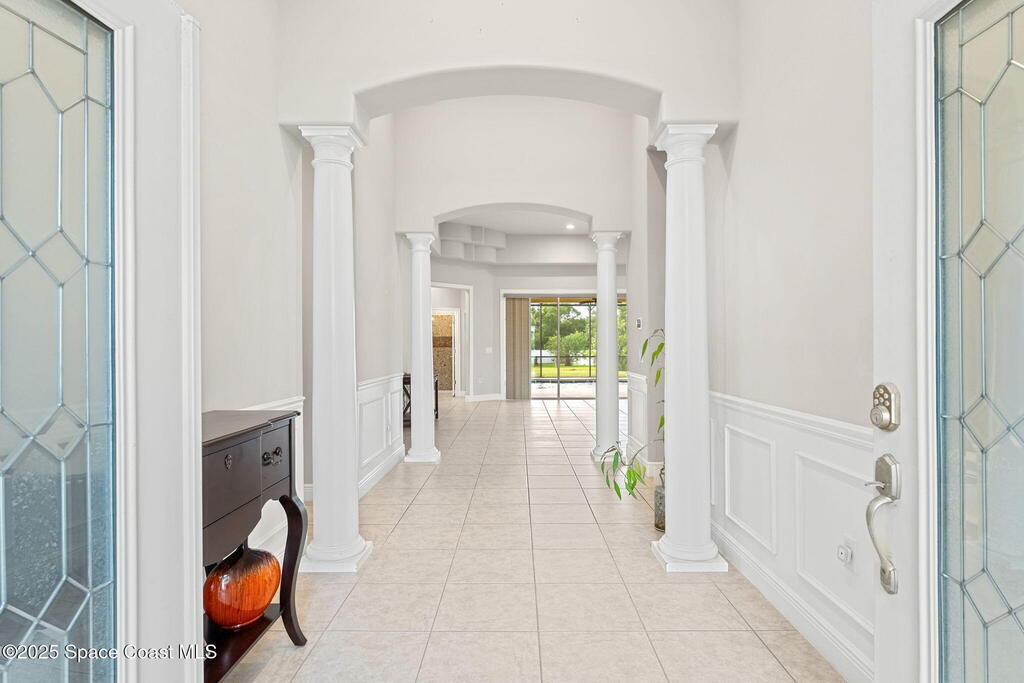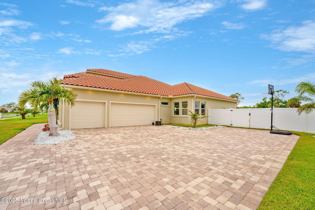 Stunning newer construction 4BR/4BA pool home in gated Woodshire Preserve! Set on a 0.68-acre lot, this 3,193 sq ft home impresses with soaring 12'-14' ceilings, an open split-bedroom layout, and custom saltwater pool featuring beach (zero) entry and decorative fountain. The gourmet ''Kosher'' kitchen includes a butler's pantry with prep sink, perfect for entertaining. The spacious primary suite offers a luxurious ensuite with soaking tub, walk-in shower, and dual vanities. Generous secondary bedrooms, oversized laundry room with utility sink, and tile flooring throughout main areas adds comfort and functionality. A/C has 8 years remaining on 10-year warranty. Located near top-rated Brevard County schools and just minutes from shopping, dining, golf, and medical in the heart of Viera. This home blends space, elegance and convenience--inside and out.