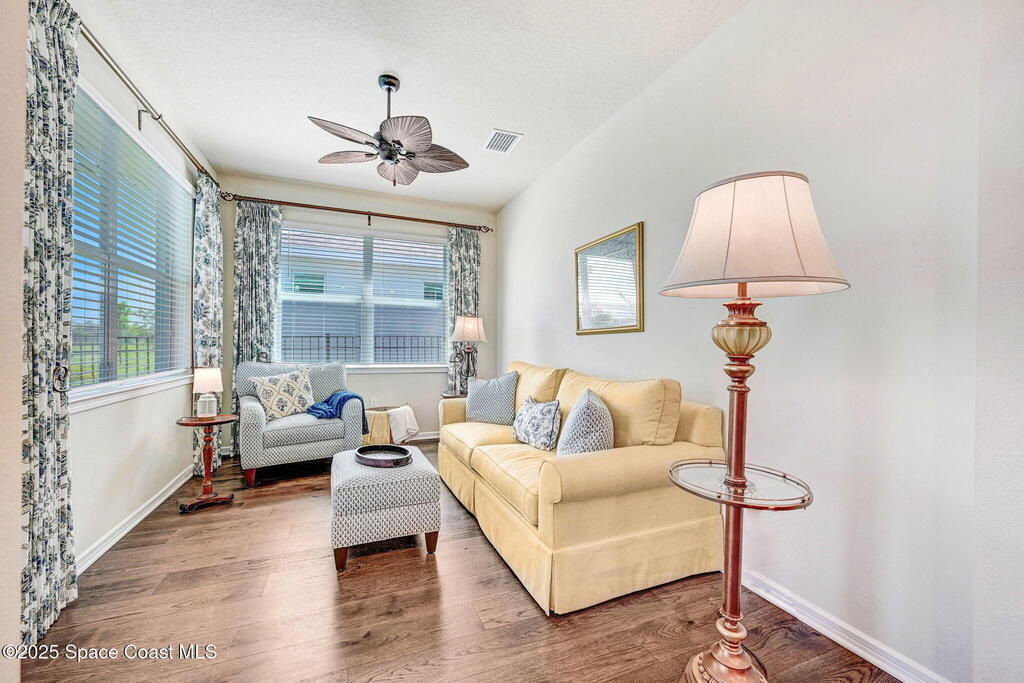 Motivated Sellers!! Welcome to your dream home in the highly sought-after Del Webb at Viera community a! This stunning single-family home boasts 2 bedrooms, a den and a Sunroom, 2 bathrooms, and a spacious 2-car garage. The open floor plan is perfect for entertaining guests, with beautiful wood flooring throughout adding a touch of elegance. The kitchen features modern appliances and plenty of counter space for meal preparation. Relax and unwind in the sunroom, perfect for enjoying your morning coffee or reading a good book. The office space provides a quiet retreat for working from home or pursuing your hobbies.Step outside to the extended screened in patio and fenced yard. The impact windows provide peace of mind while also allowing natural light to flood the home. Del Webb at Viera offers a vibrant lifestyle with amenities such as a clubhouse. with tavern, community pool (opening soon) fitness center, pickleball, tennis courts, walking trail and Gold golf membership to Duran.