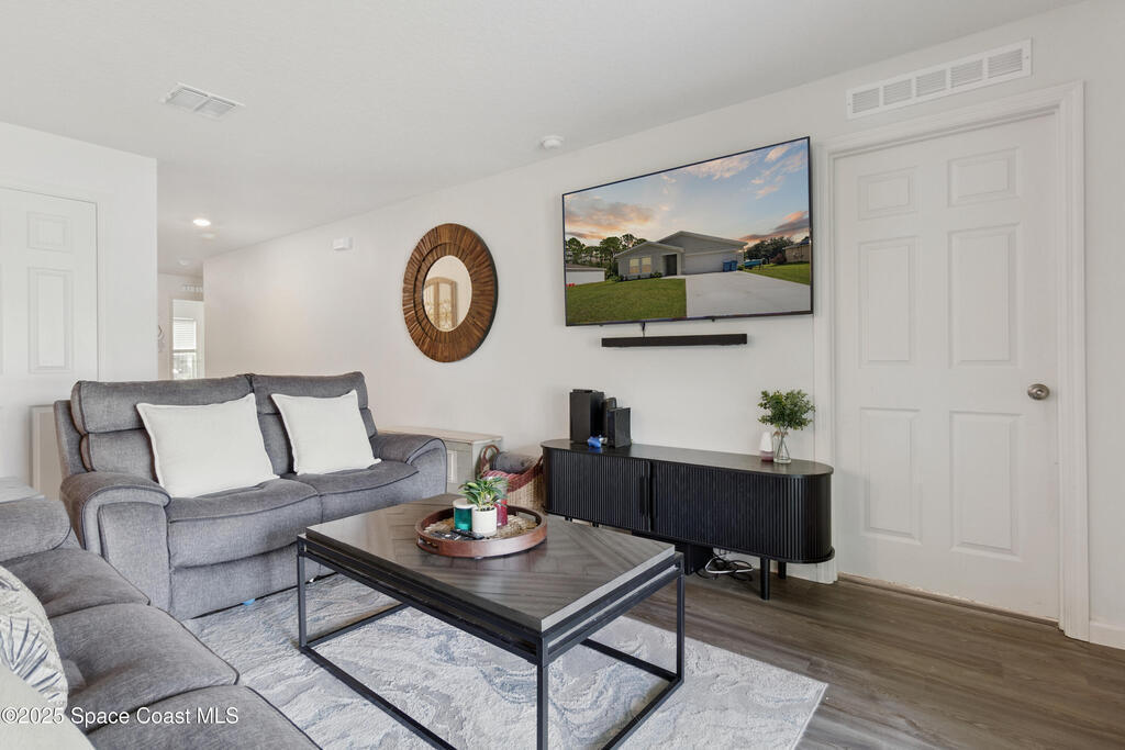 Welcome to a stunning practically new construction home in Palm Bay. No HOA, Water softener with newly installed fence. You don't want to miss this! This single-story residence boasts a modern design, perfect for comfortable living. The Prescott floor plan features an expansive open-concept layout, seamlessly integrating the living, dining, and kitchen areas, ideal for entertainment and daily life. The kitchen stands out with sleek granite countertops, exquisite cabinetry with LED lighting, and stainless steel appliances, including a range with microwave hood, dishwasher and washer & dryer that convey with the home. The private primary suite offers a spacious walk-in closet and a luxurious en-suite bathroom with dual vanity sinks. With three bedrooms and two full bathrooms, this home provides ample space for families, guests, or a home office setup. 10 year structural Warranty available. Don't miss the opportunity to own