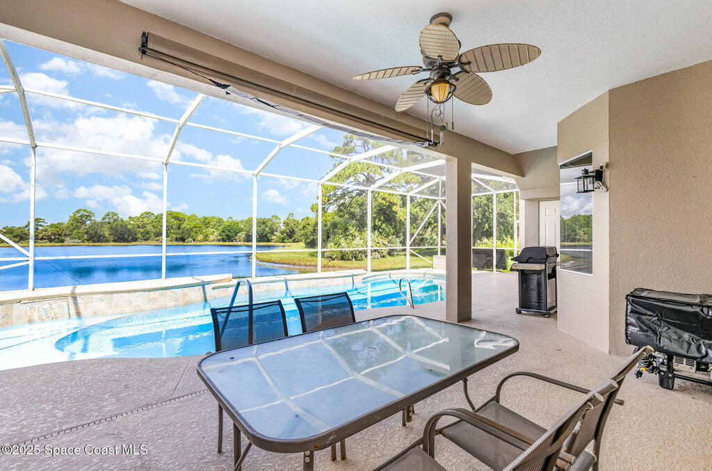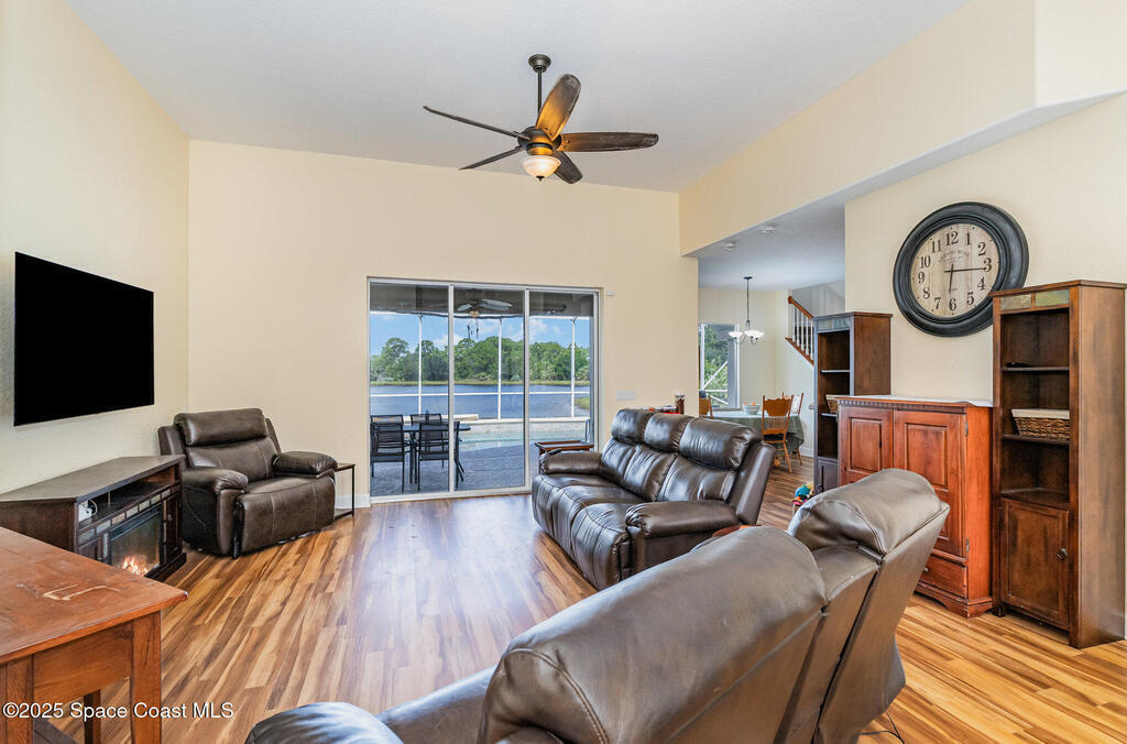 Beautifully updated 4-bedroom + office + bonus room home with 3 full baths and stunning lake views. As you enter, the remodeled living room immediately showcases breathtaking water views. The spacious kitchen features stainless steel appliances, a breakfast bar, and overlooks the pool and lake. The primary suite offers a walk-in closet, double vanities, garden tub, separate shower, and peaceful water views. Upstairs includes a private living area with bedroom and full bath--ideal for guests or multi-generational living.Enjoy the screened lanai with sparkling pool and serene lake backdrop--perfect for relaxing or entertaining. Major updates include 2 new AC units (2023), new flooring throughout (2023), sealed garage floor (2023), new pool heater (2023), and exterior paint (2024). Conveniently located near shopping, A-rated schools, and just 15 minutes to the beach.