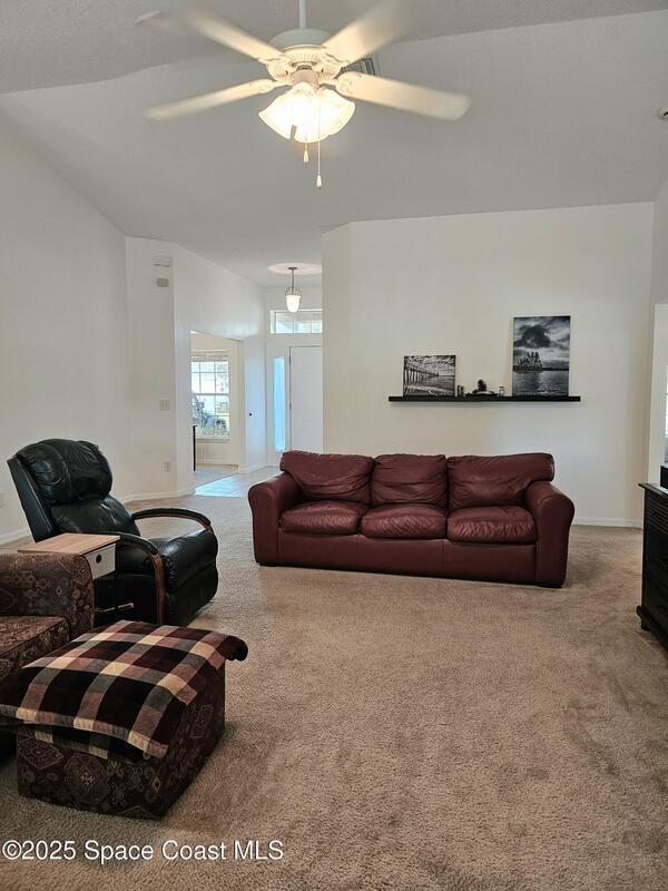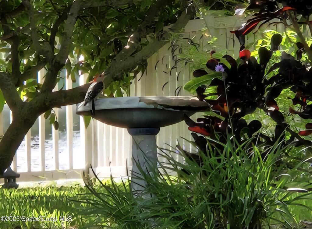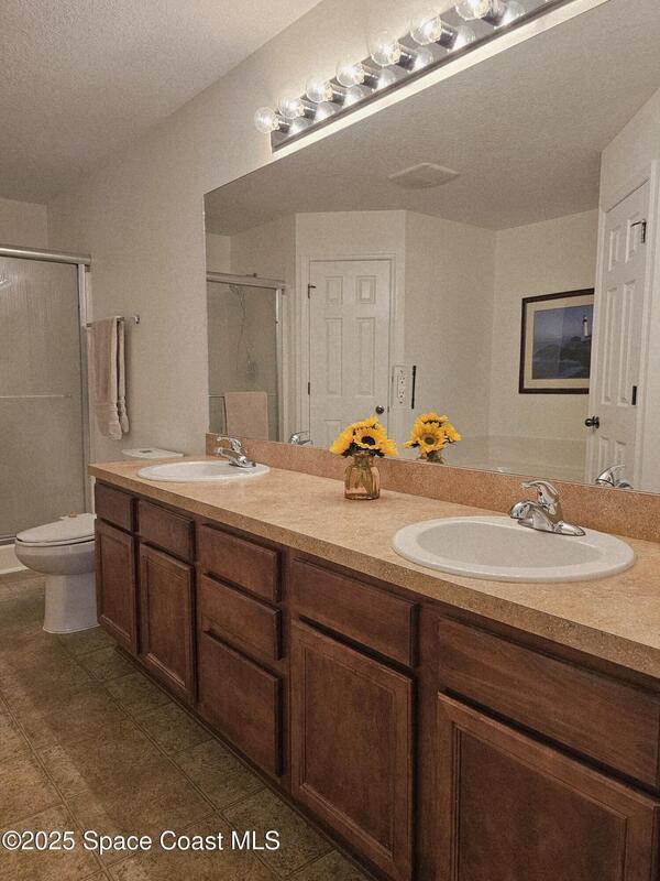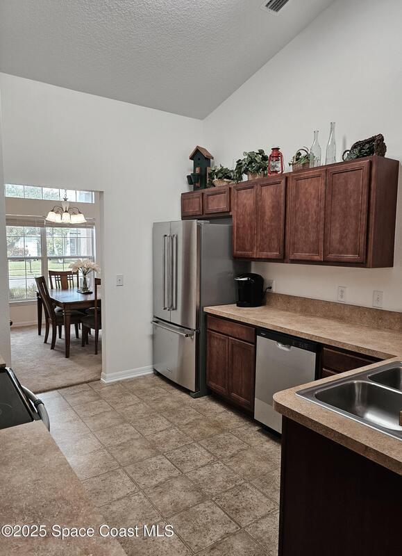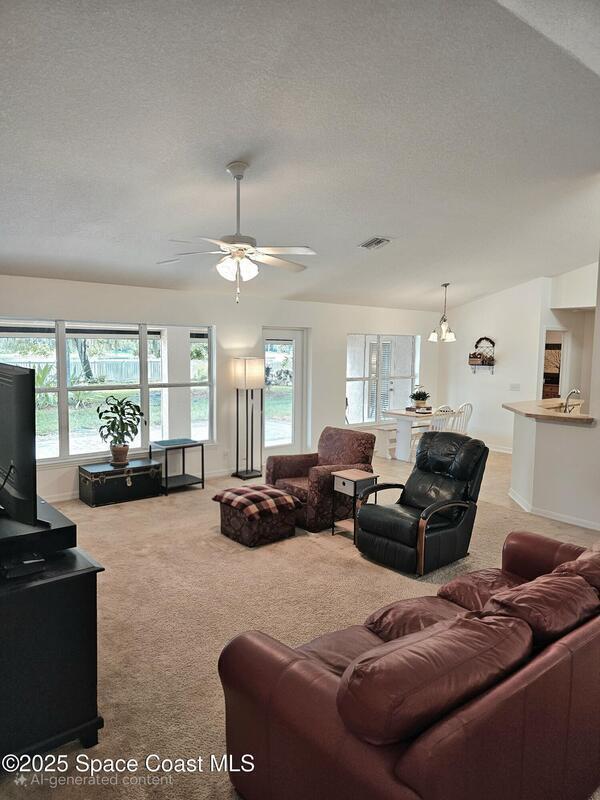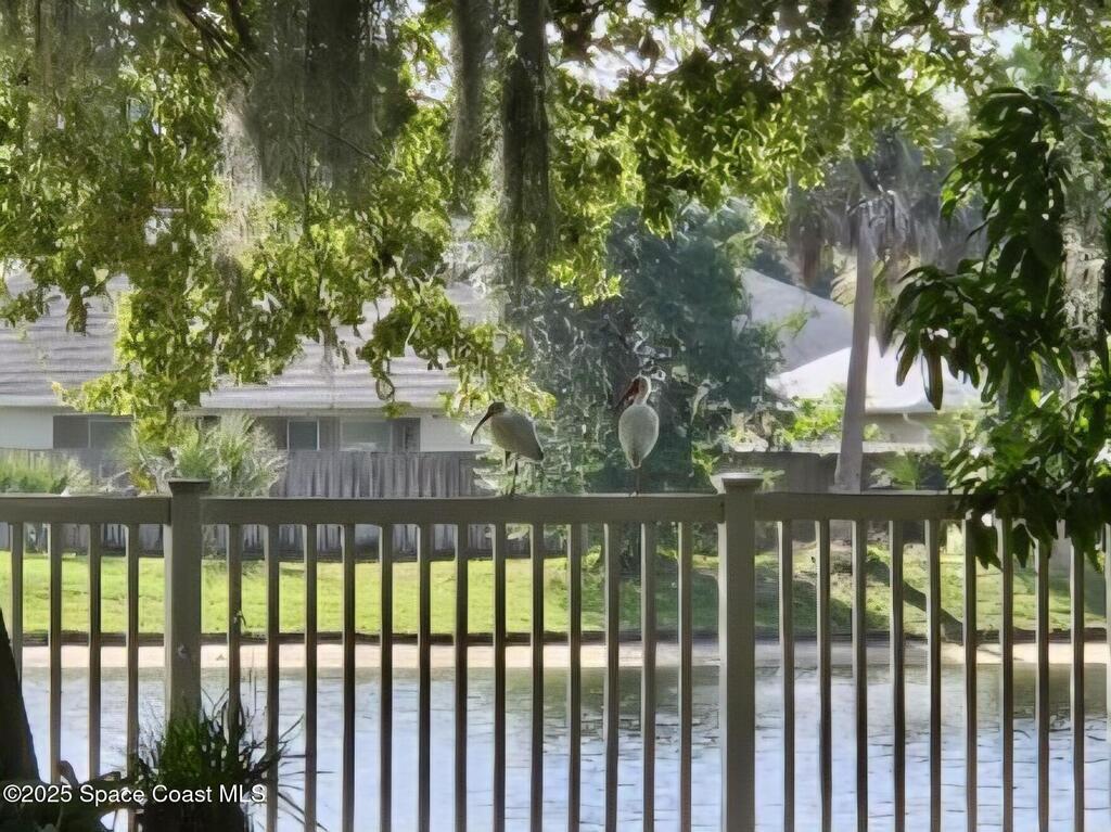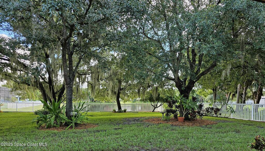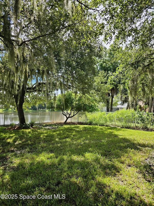 Oversized lot with amazing view of the pond and next to preserve area for additional privacy. Fenced backyard is a tropical paradise with large oaks for shade & mango tree. Community is tucked away at end of road but close to all that West Melbourne has to offer. Very well-maintained home offers large family room open to the kitchen & breakfast nook. Vaulted ceilings in main area. Front flex/den & formal dining room add more flexibility. Split bedroom plan with four bedrooms & two bathrooms. Primary suite has door to the lanai area, two walk-in closets, double sinks, soaking tub & separate shower. Back guest bedroom has door to lanai area & makes a great space for office or sunroom. Fresh interior paint throughout, brand new dishwasher & refrigerator. Accordion hurricane shutters & pulled down screens on lanai add peace of mind. Roof 2023, A/C 2023, HWH 2020