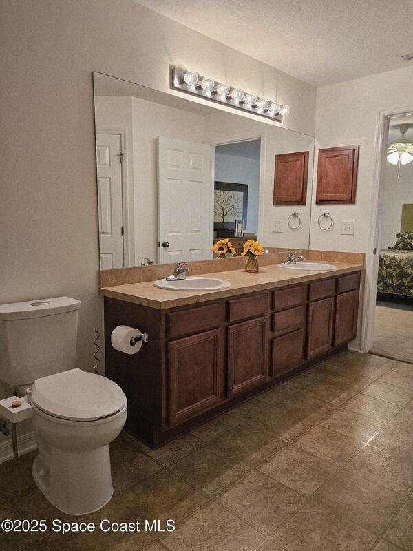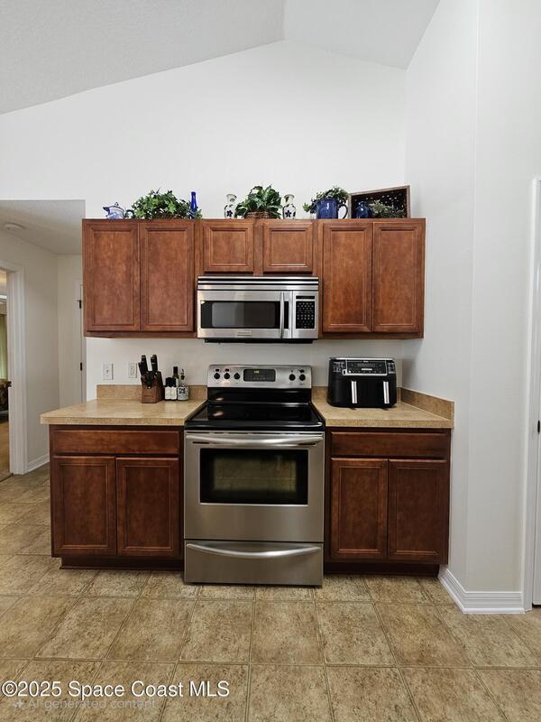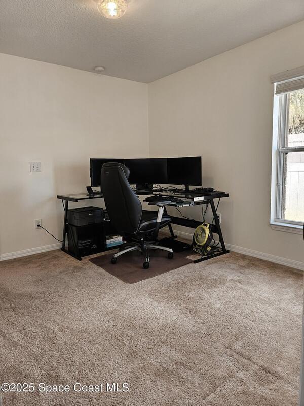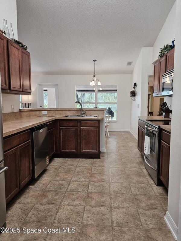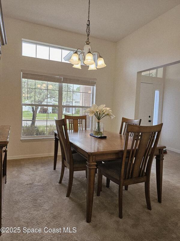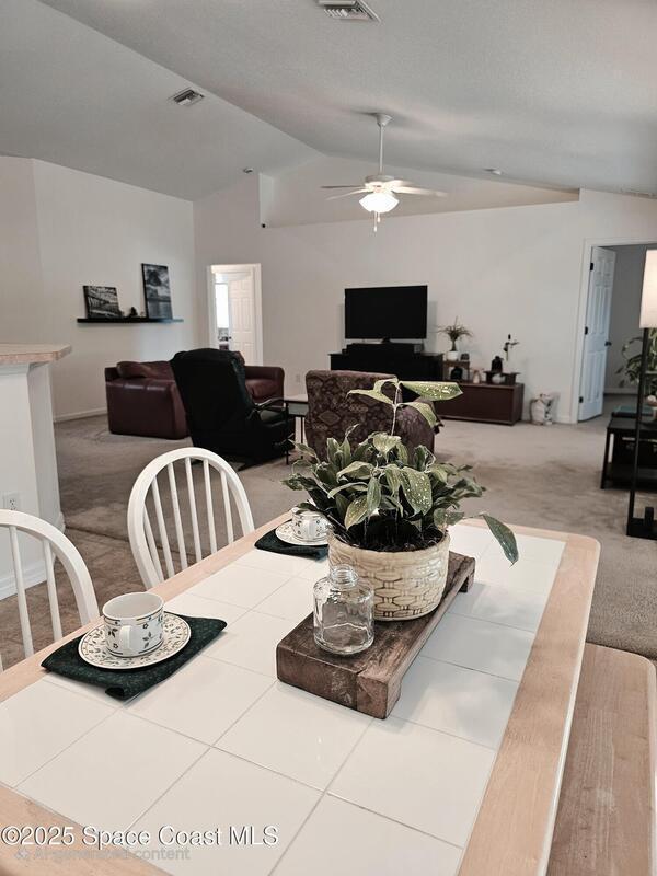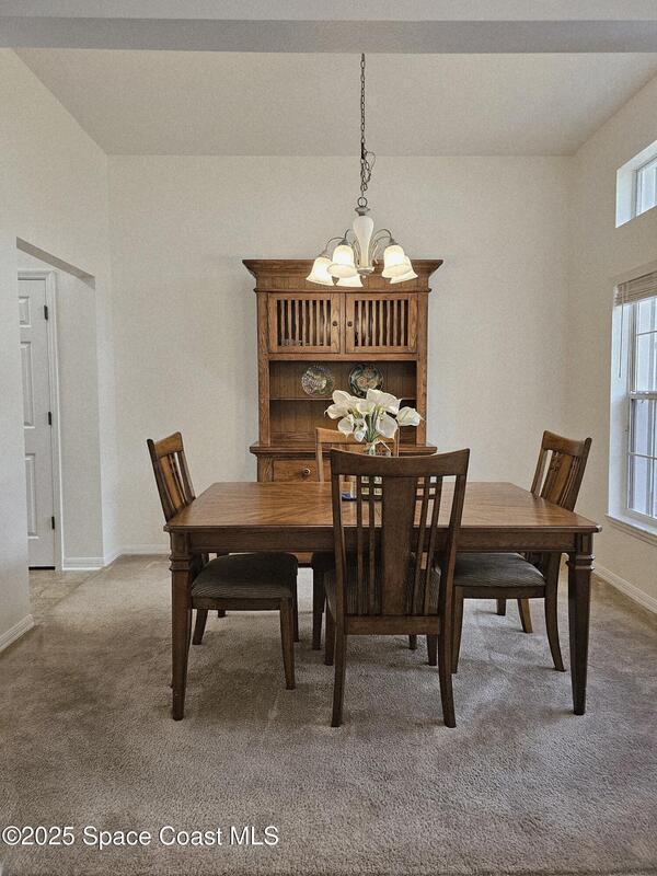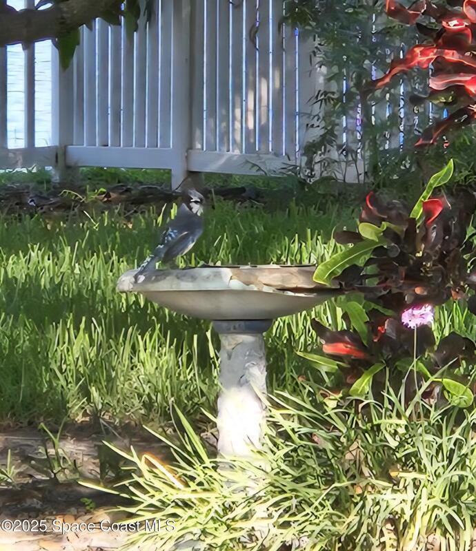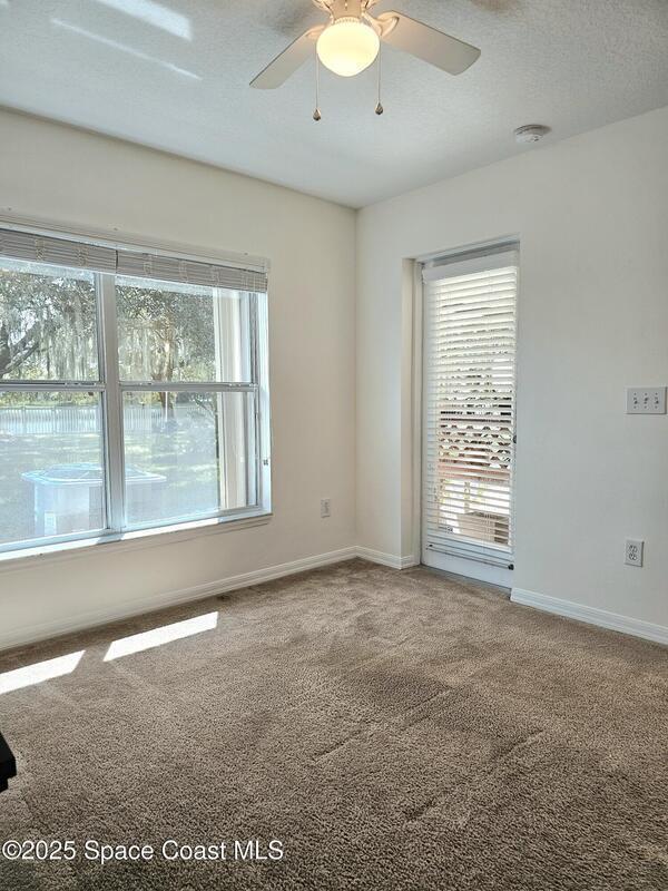 Oversized lot with amazing view of the pond and next to preserve area for additional privacy. Fenced backyard is a tropical paradise with large oaks for shade & mango tree. Community is tucked away at end of road but close to all that West Melbourne has to offer. Very well-maintained home offers large family room open to the kitchen & breakfast nook. Vaulted ceilings in main area. Front flex/den & formal dining room add more flexibility. Split bedroom plan with four bedrooms & two bathrooms. Primary suite has door to the lanai area, two walk-in closets, double sinks, soaking tub & separate shower. Back guest bedroom has door to lanai area & makes a great space for office or sunroom. Fresh interior paint throughout, brand new dishwasher & refrigerator. Accordion hurricane shutters & pulled down screens on lanai add peace of mind. Roof 2023, A/C 2023, HWH 2020