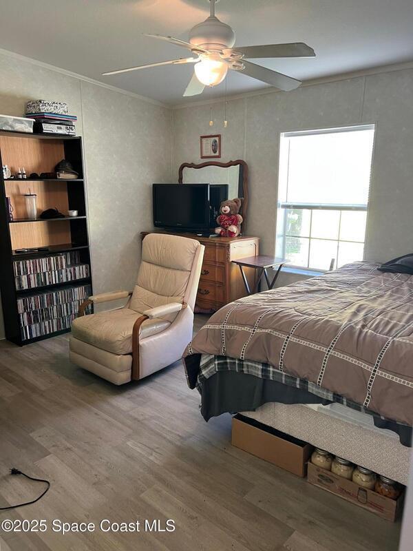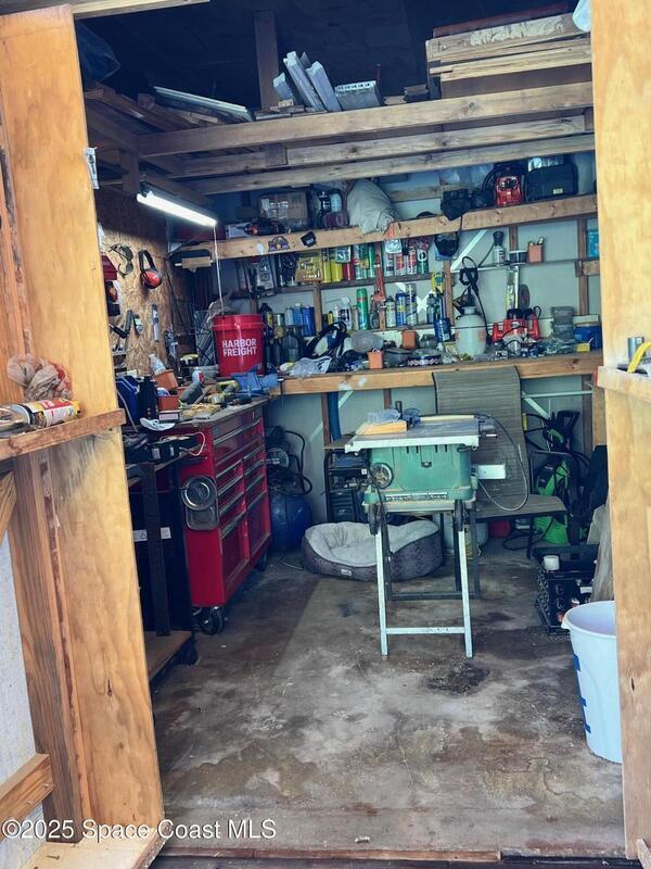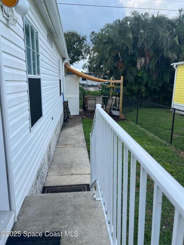 This large 3-bedroom 2-bathroom home features a double carport and driveway. Enter through the climate controlled 4 seasons room into the breakfast nook and kitchen. The split floor plan provides space for family living. Open kitchen, dining room and living room. Vaulted ceilings. Tile and laminate flooring through-out. Owners' suite features 2 walk in closets, double sinks vanity, and a step-in shower. 2 X 6 construction. Partial fenced in yard for furry friends. Workshop equipped with electricity and whole home generator hook-up. Washer/dryer in unit. New metal roof installed August 2025. WH is 5 years old. Barefoot Bay is a vibrant golf-cart friendly community that feels like a cross between a small town and a year-round resort. Golf course, 3 pools, fishing pier, private beach access and much more. There is something for everyone or relax in your 4 seasons room and watch the sunset. You own the land.