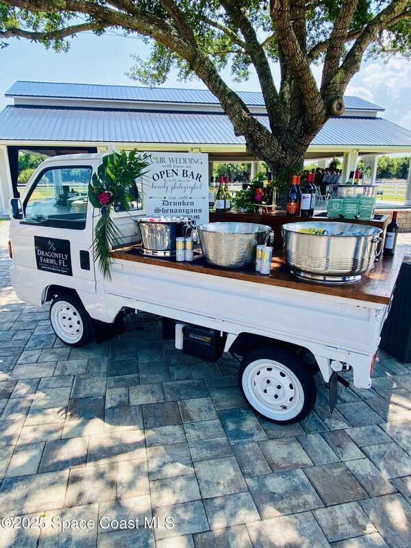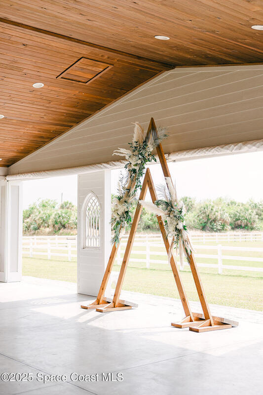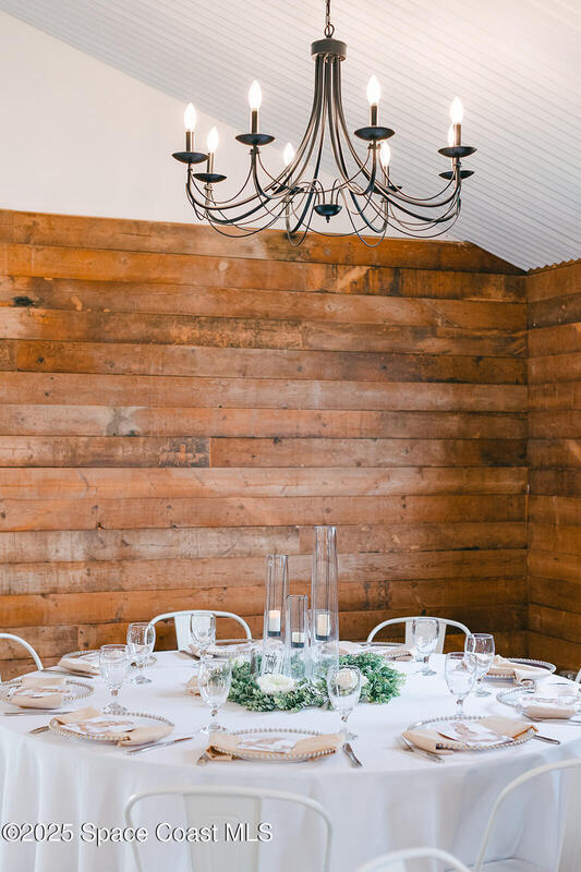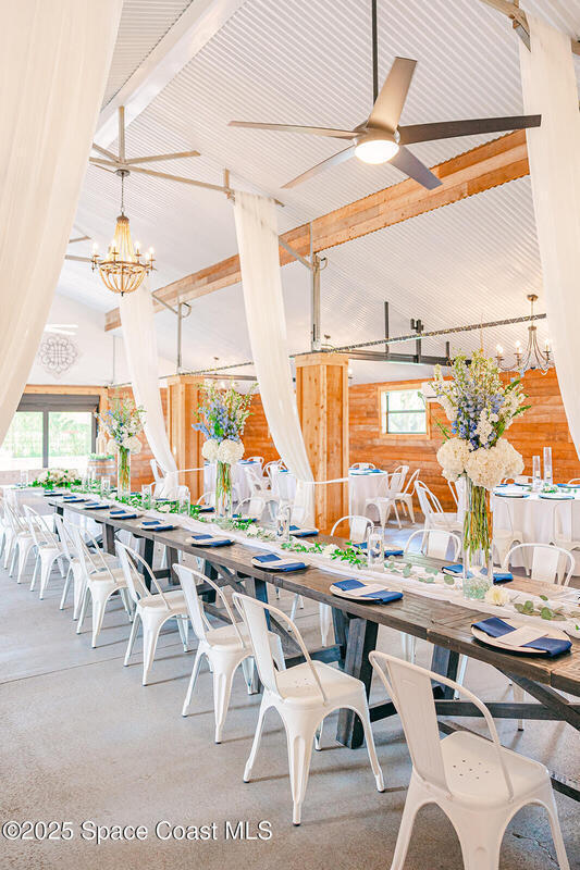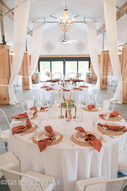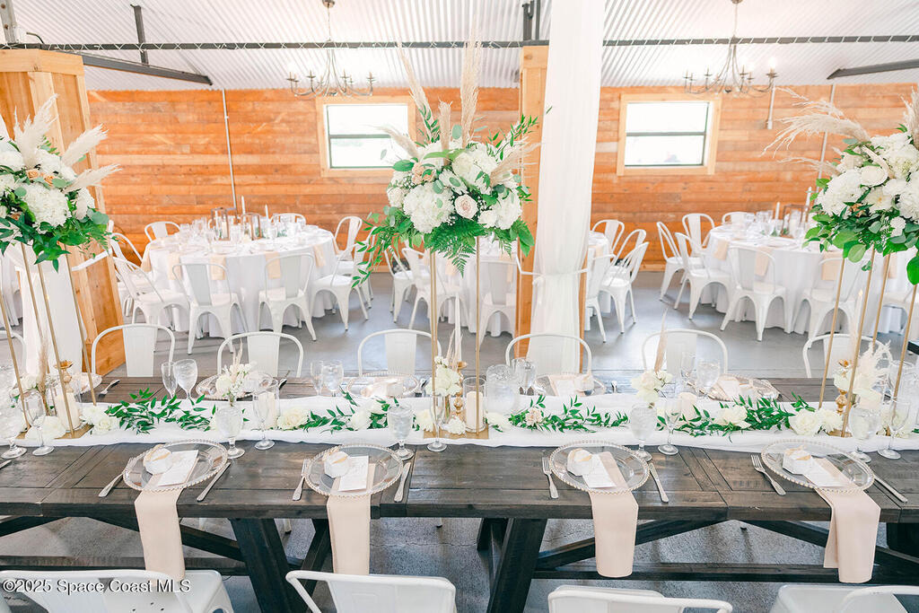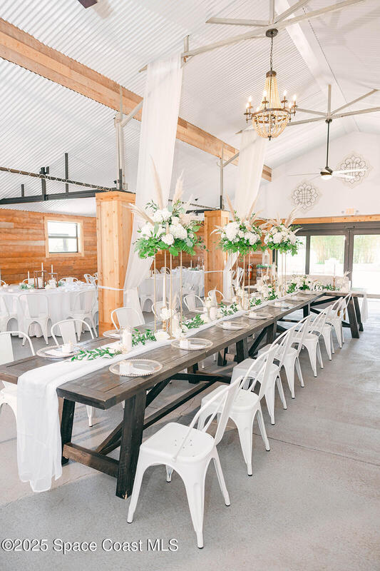 Discover the ultimate lifestyle property in Palm Bay--two adjoining parcels offered together for a combined 11+/- acres of opportunity. This rare combination of a turnkey event venue and a stunning single-family home creates the perfect work-life balance. The 4-bedroom, 3-bath, 2,793 sq ft residence features an open-concept split floor plan with soaring ceilings and two master suites. At its heart is a gourmet kitchen with custom cabinetry, abundant storage, and quality finishes. Additional highlights include two guest bedrooms, an office/den, and a screened, heated pool and spa for year-round enjoyment. Next door is where happily-ever-afters begin--your turnkey wedding and event venue, brimming with potential. This fully operational business boasts confirmed bookings through 2027 and a beautifully renovated 5,000+ sq ft barn with Bride & Groom suites, office, pavilion, terrace, and both developed and cleared acreage for expansion.