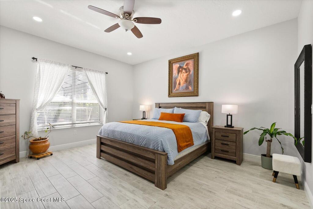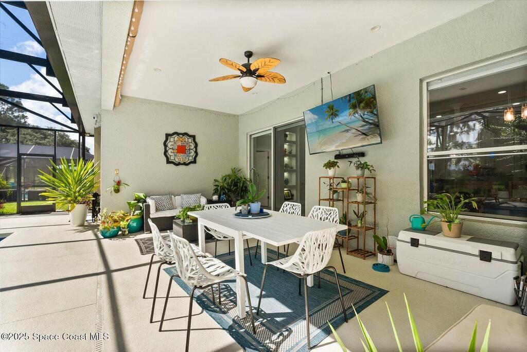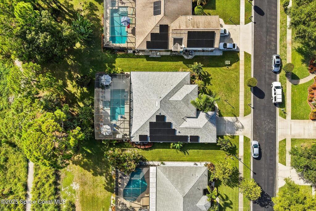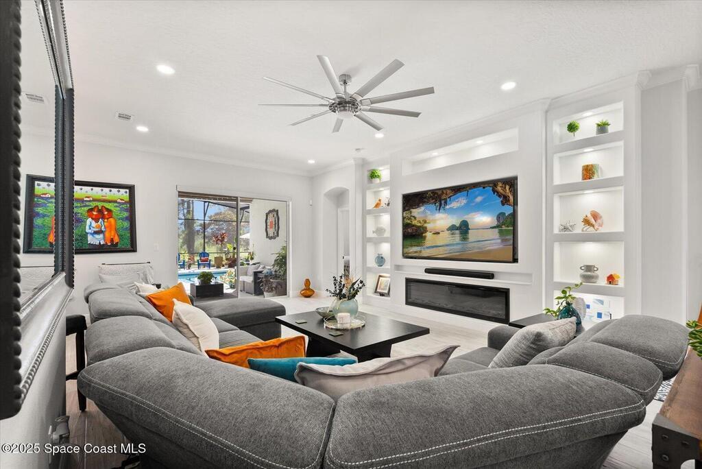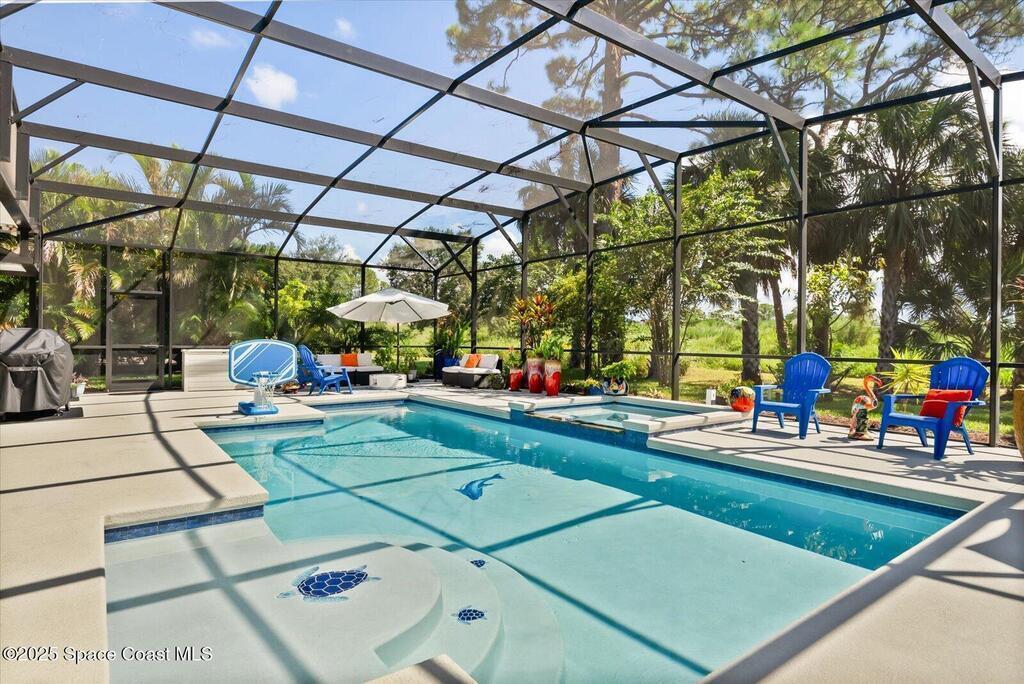 Experience the best of Florida living in this beautifully upgraded pool home on a tranquil 0.26-acre lot in the gated Summerfield neighborhood of Bayside Lakes. With no rear neighbors, enjoy serene views from your private backyard oasis, featuring a new saltwater pool, spa, and expansive screened lanai (2024), plus a covered patio perfect for morning coffee or sunset swims. Inside, modern updates shine with a remodeled kitchen (2020), new ceramic tile floors (2025), fresh paint, updated lighting, and a built-in entertainment center with electric fireplace (2025). The split floor plan includes a spacious primary suite with two walk-in closets, a spa-like bath (2025), and every bedroom features custom built-in closets for smart storage. A new roof (2022), solar panels (2024), AC (2023), shutters, and Ring security add peace of mind. Zoned for top-rated schools and close to beaches, shopping, and major aerospace employers, this home blends style, function, and location.