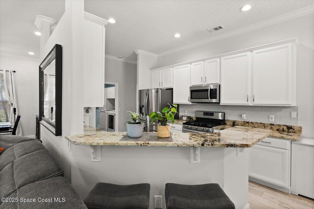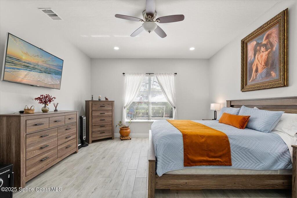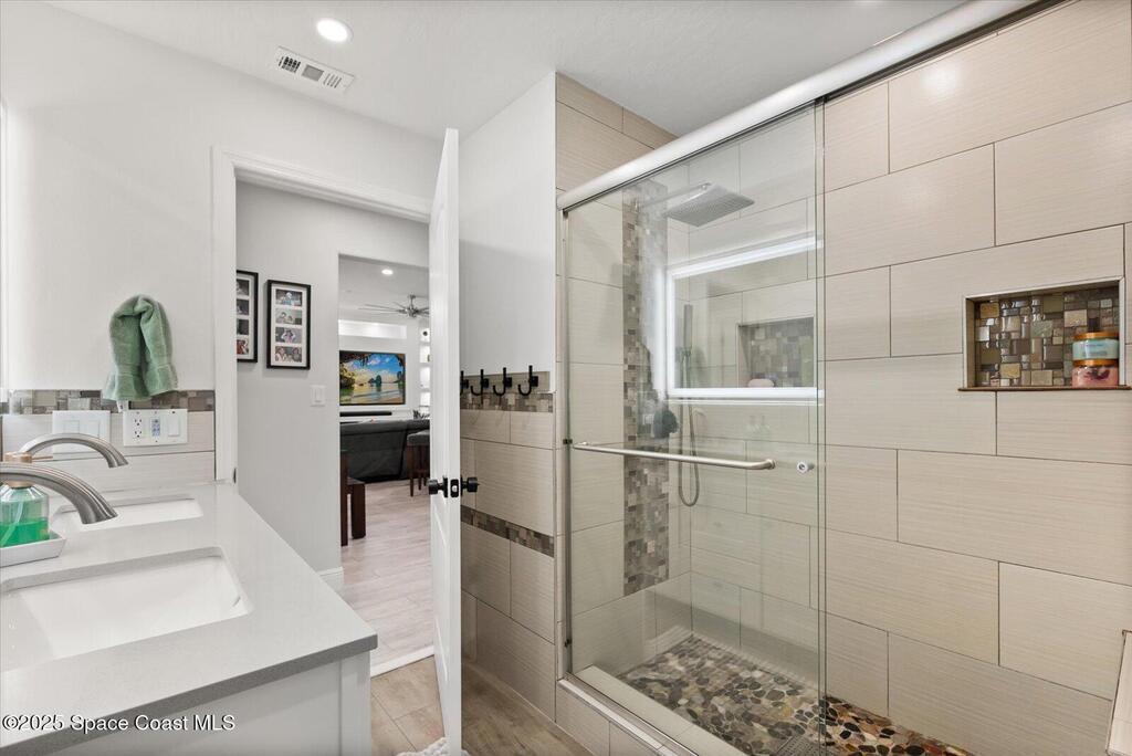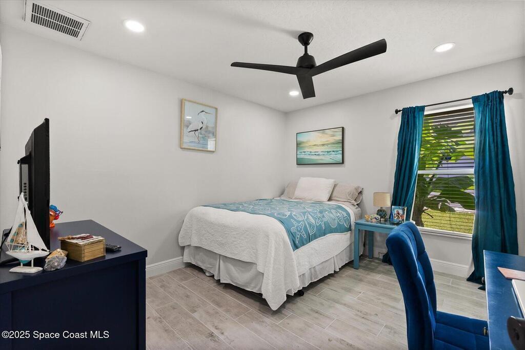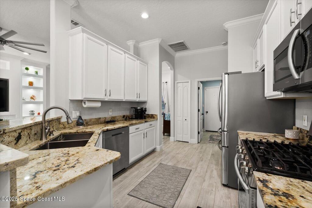 Experience the best of Florida living in this beautifully upgraded pool home on a tranquil 0.26-acre lot in the gated Summerfield neighborhood of Bayside Lakes. With no rear neighbors, enjoy serene views from your private backyard oasis, featuring a new saltwater pool, spa, and expansive screened lanai (2024), plus a covered patio perfect for morning coffee or sunset swims. Inside, modern updates shine with a remodeled kitchen (2020), new ceramic tile floors (2025), fresh paint, updated lighting, and a built-in entertainment center with electric fireplace (2025). The split floor plan includes a spacious primary suite with two walk-in closets, a spa-like bath (2025), and every bedroom features custom built-in closets for smart storage. A new roof (2022), solar panels (2024), AC (2023), shutters, and Ring security add peace of mind. Zoned for top-rated schools and close to beaches, shopping, and major aerospace employers, this home blends style, function, and location.
