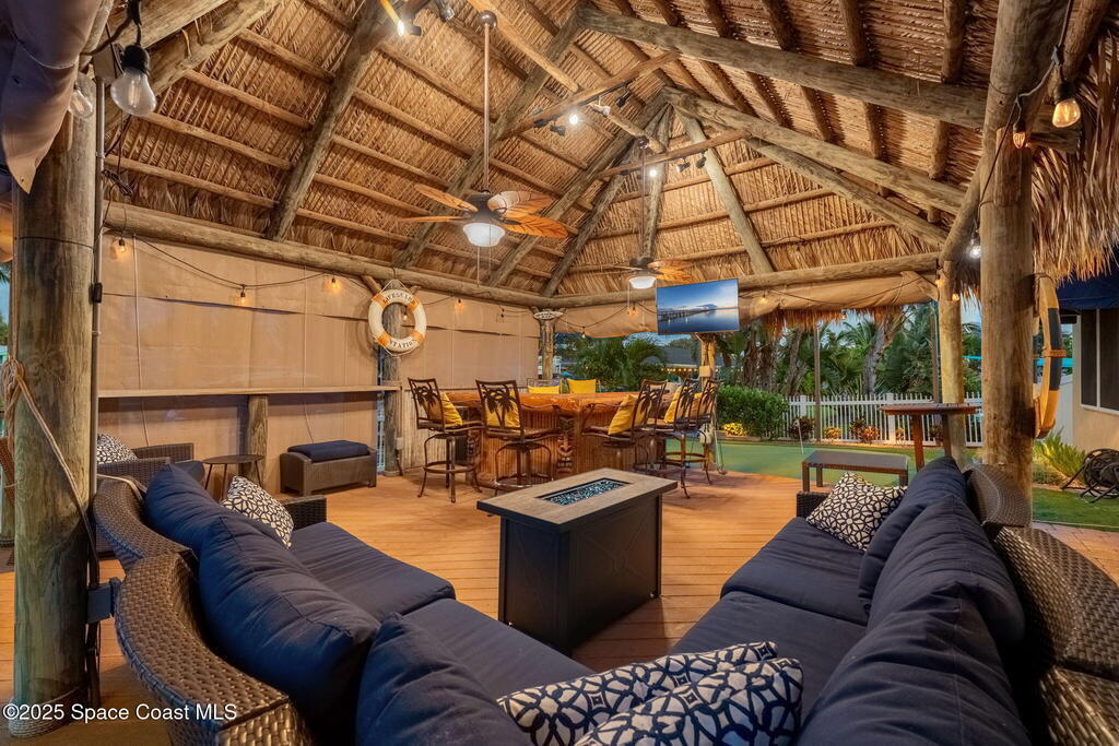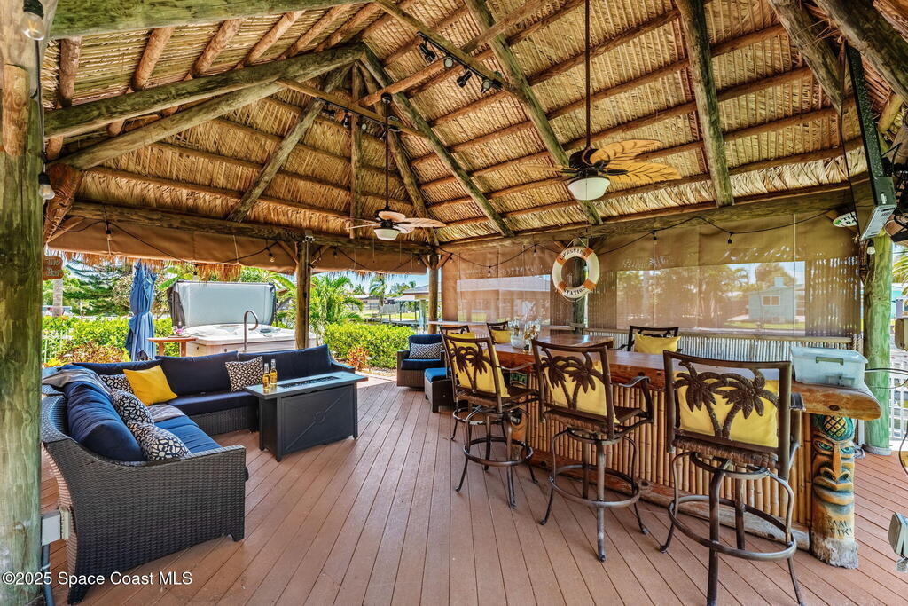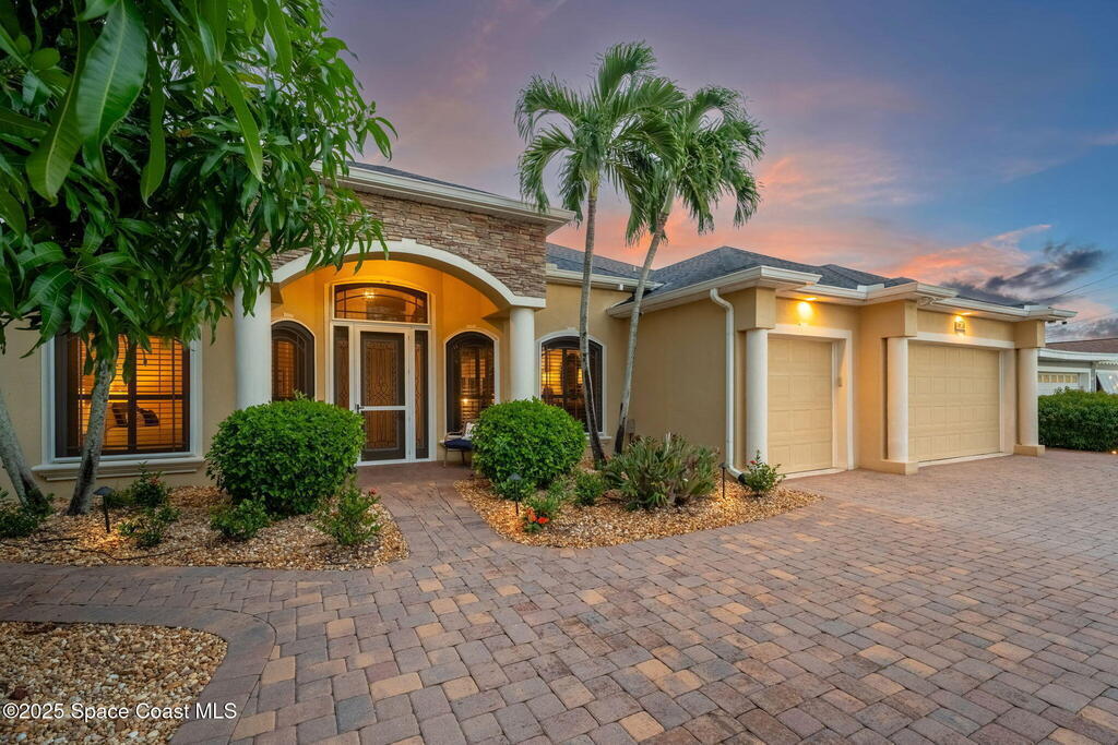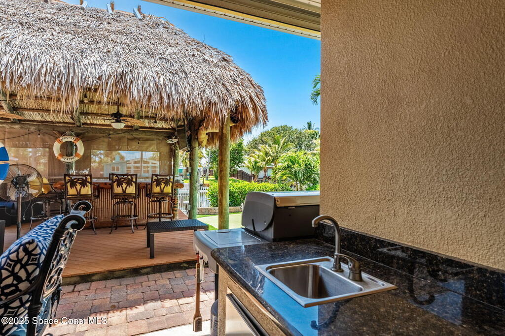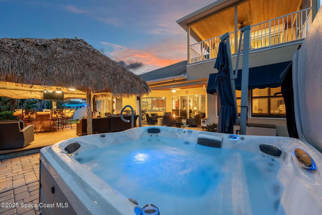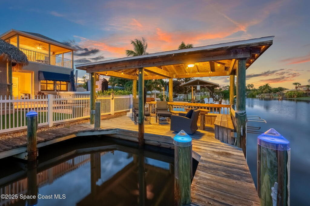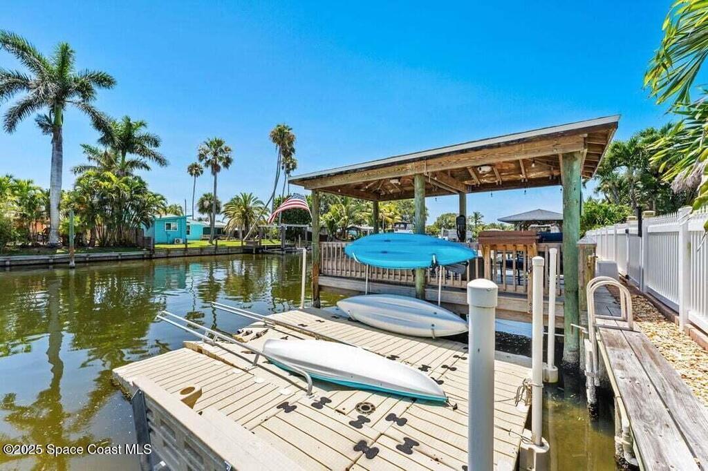 Welcome to this beautifully upgraded 5-bedroom Cocoa Beach home, complete with a versatile flex room that can serve as a 6th guest-room or office. The first-floor primary suite is a private retreat with a spacious layout, modern finishes, and a spa-like ensuite bathroom. A 3-car garage, fully under air and finished with epoxy flooring, provides abundant storage for vehicles, toys, and hobbies. The home features open-concept living and dining areas that flow seamlessly to expansive outdoor spaces. Built in 2006, this waterfront residence offers a custom tiki bar, hot tub, and putting green creating the ultimate backyard oasis for gatherings with family and friends. On the water, enjoy a deep-water canal with a 2021 dual-engine boat lift (approx. 16,000 lbs), floating dock with ramp, and racks for kayaks and paddleboards--perfect for boaters. Recent updates include a 2017 roof, 2021 A/C and water heater, storm protection, tiki hut hurricane shutters (2022), and a home security system.