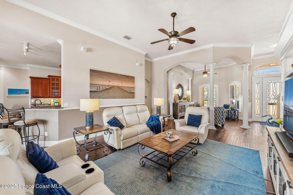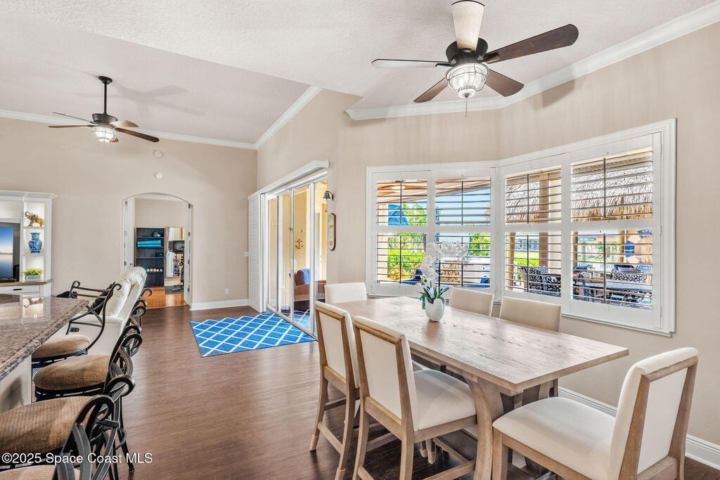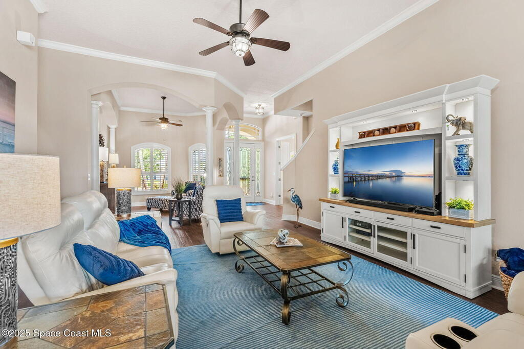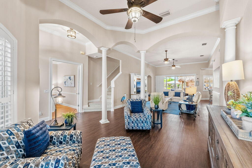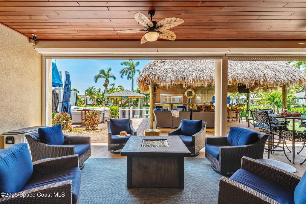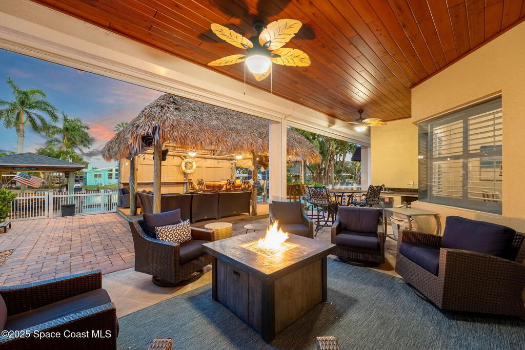 Welcome to this beautifully upgraded 5-bedroom Cocoa Beach home, complete with a versatile flex room that can serve as a 6th guest-room or office. The first-floor primary suite is a private retreat with a spacious layout, modern finishes, and a spa-like ensuite bathroom. A 3-car garage, fully under air and finished with epoxy flooring, provides abundant storage for vehicles, toys, and hobbies. The home features open-concept living and dining areas that flow seamlessly to expansive outdoor spaces. Built in 2006, this waterfront residence offers a custom tiki bar, hot tub, and putting green creating the ultimate backyard oasis for gatherings with family and friends. On the water, enjoy a deep-water canal with a 2021 dual-engine boat lift (approx. 16,000 lbs), floating dock with ramp, and racks for kayaks and paddleboards--perfect for boaters. Recent updates include a 2017 roof, 2021 A/C and water heater, storm protection, tiki hut hurricane shutters (2022), and a home security system.