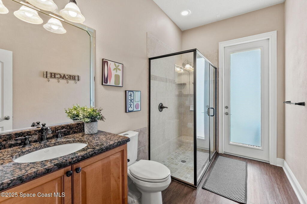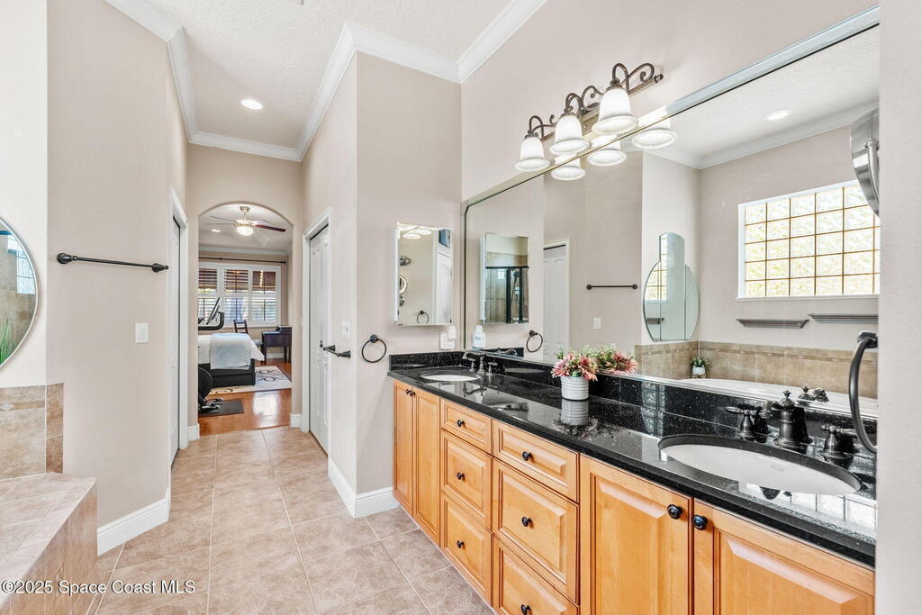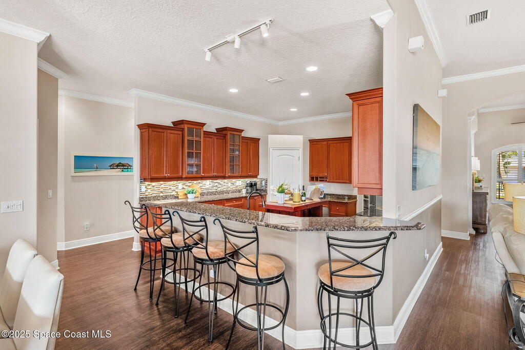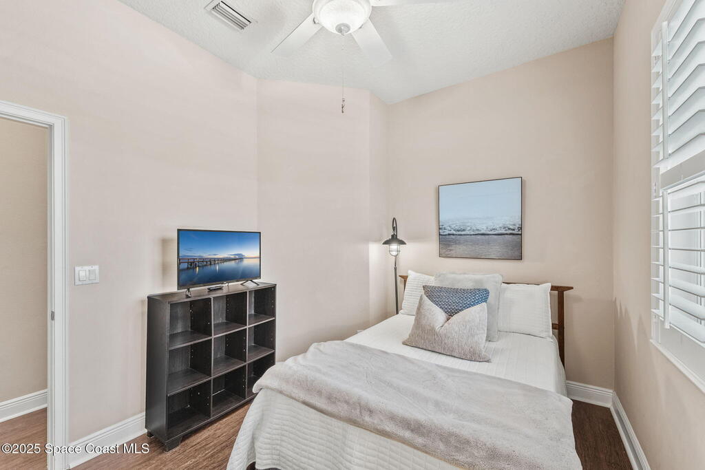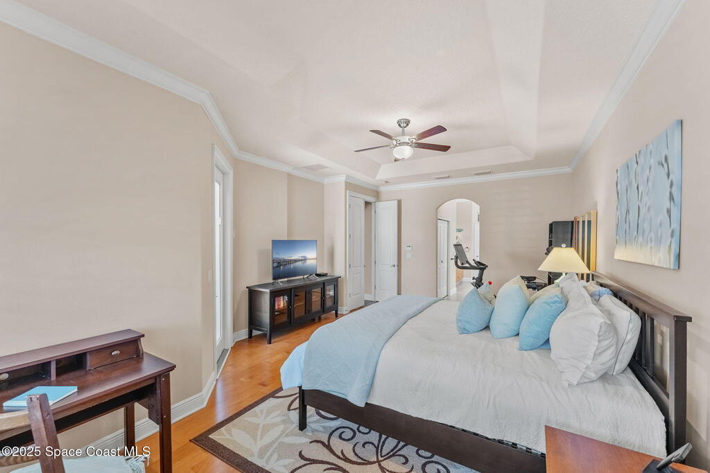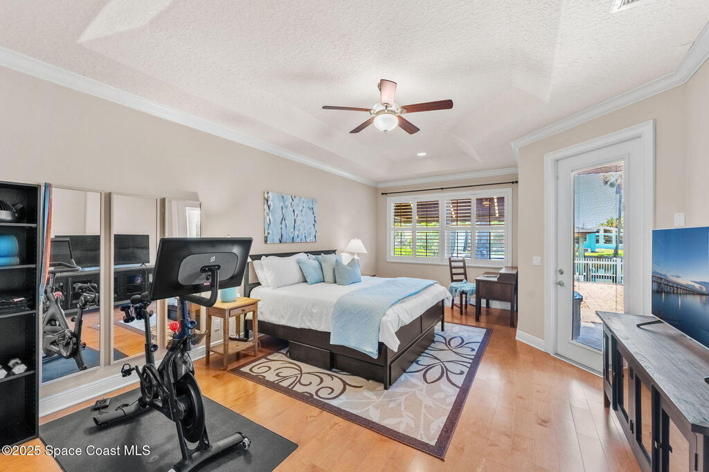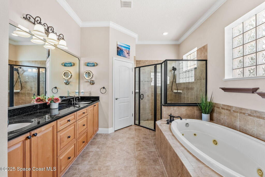 Welcome to this beautifully upgraded 5-bedroom Cocoa Beach home, complete with a versatile flex room that can serve as a 6th guest-room or office. The first-floor primary suite is a private retreat with a spacious layout, modern finishes, and a spa-like ensuite bathroom. A 3-car garage, fully under air and finished with epoxy flooring, provides abundant storage for vehicles, toys, and hobbies. The home features open-concept living and dining areas that flow seamlessly to expansive outdoor spaces. Built in 2006, this waterfront residence offers a custom tiki bar, hot tub, and putting green creating the ultimate backyard oasis for gatherings with family and friends. On the water, enjoy a deep-water canal with a 2021 dual-engine boat lift (approx. 16,000 lbs), floating dock with ramp, and racks for kayaks and paddleboards--perfect for boaters. Recent updates include a 2017 roof, 2021 A/C and water heater, storm protection, tiki hut hurricane shutters (2022), and a home security system.