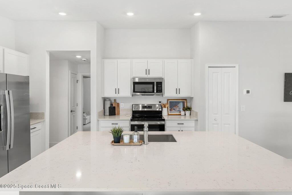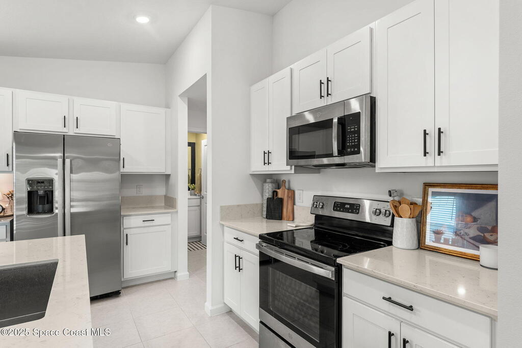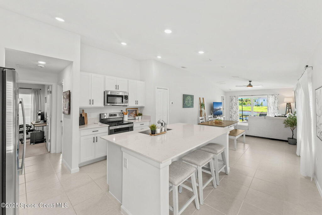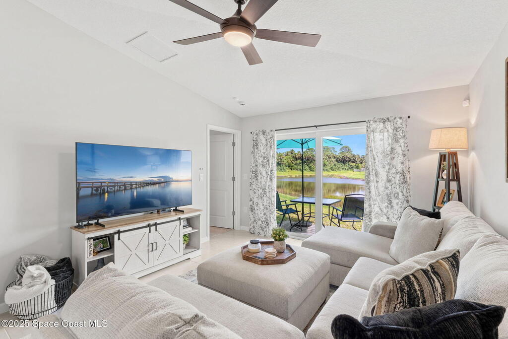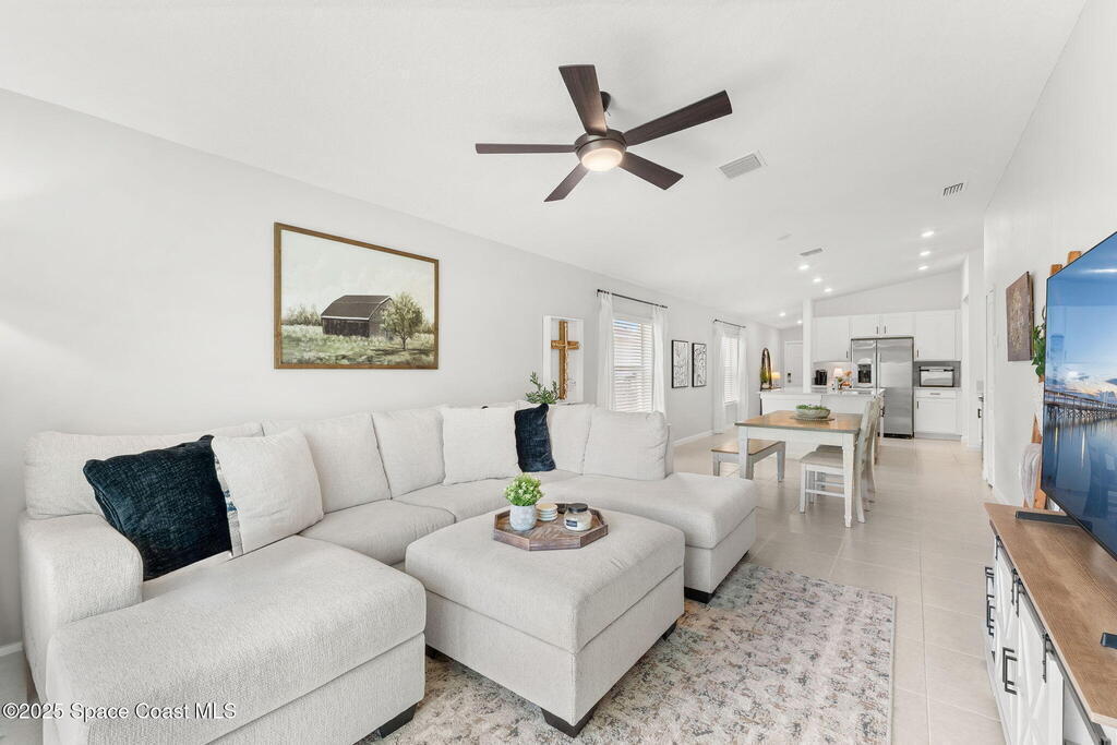 Discover this stunning, like-new home in the desirable gated community of Tillman Lakes in Palm Bay! Built in November 2023, this meticulously maintained 3-bedroom, 2-bath residence blends modern design, comfort, and thoughtful upgrades throughout its 1,451 sq. ft. of living space.Step inside to an open and inviting split floor plan that's perfect for everyday living or entertaining. The chef-inspired kitchen is a true centerpiece, featuring quartz countertops, a large farmhouse sink, stainless steel appliances, and upgraded hardware on the kitchen and bath cabinets.You'll love the hurricane-impact windows for peace of mind and energy efficiency, Venetian blinds throughout, new ceiling fans, and a custom wood wall feature in the primary bedroom adding warmth and style. The living area and bathrooms have freshly painted accents, bringing a bright and modern touch.Additional highlights include stylish tile and plush carpet flooring, a spacious 2-car garage with storage,