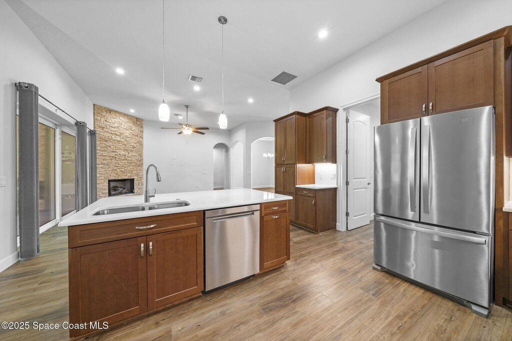 Stunning Custom Home on 1 Acre with In-Law Suite & Preserve View offers a blend of luxury, functionality, and nature. With 4 spacious bedrooms, 3 full baths. An open-concept layout with 12' ceilings in the main living areas. The great room features a gas fireplace. A formal dining room and breakfast nook provide versatile options for entertaining. The kitchen, boasting 36'' solid wood cabinets, quartz countertops and backsplash, stainless steel appliances, a large island with breakfast bar, walk-in pantry, and a buried propane tank that fuels the range, fireplace, and BBQ grill. The primary suite with dual walk-in closets, a walk-in shower with dual rain heads, and double vanities. Circulating hot water switch for immediate warm water in the bathrooms. The spacious in-law suite is perfect for family or guests, featuring a private entrance, kitchenette (cooktop, microwave, sink, fridge hookup), breakfast bar, living area, and full bath with a handicap-accessible recessed shower.