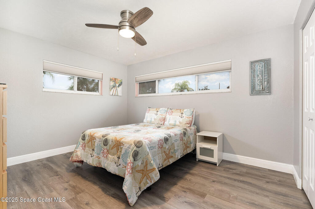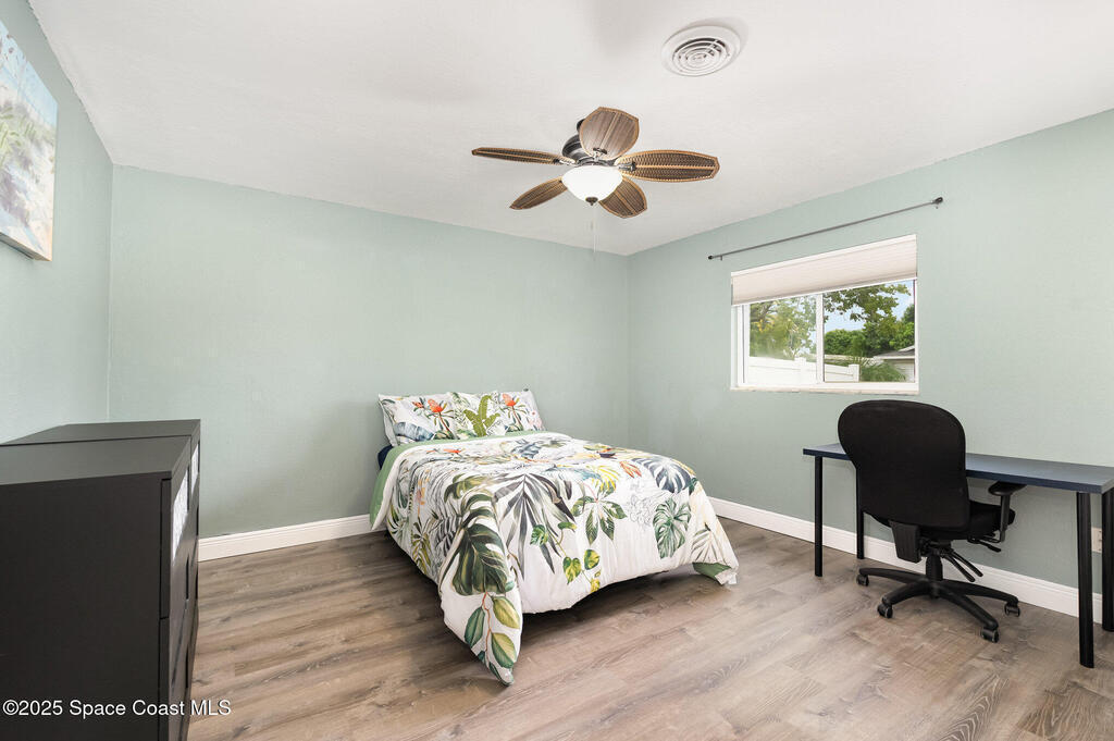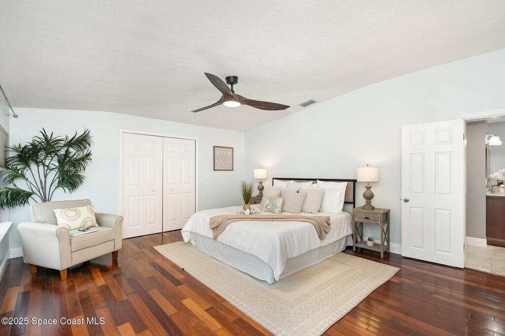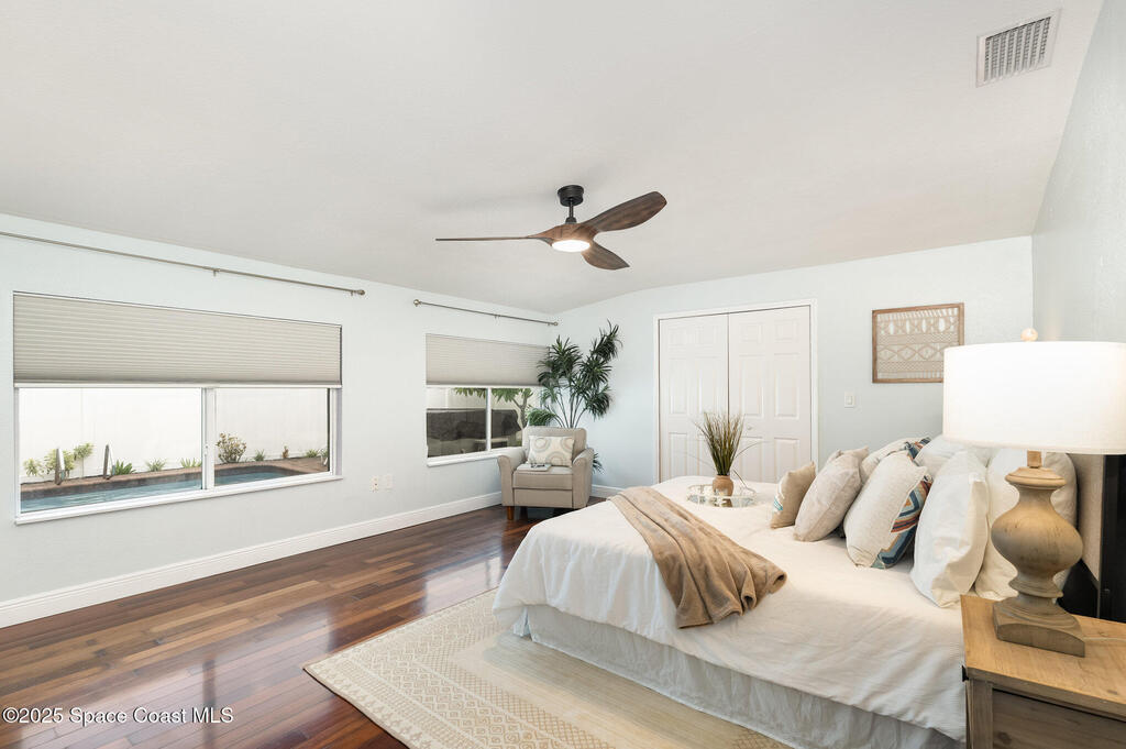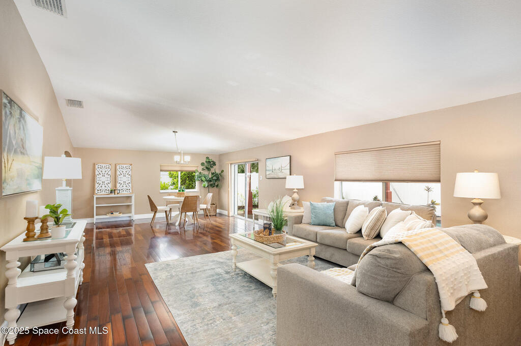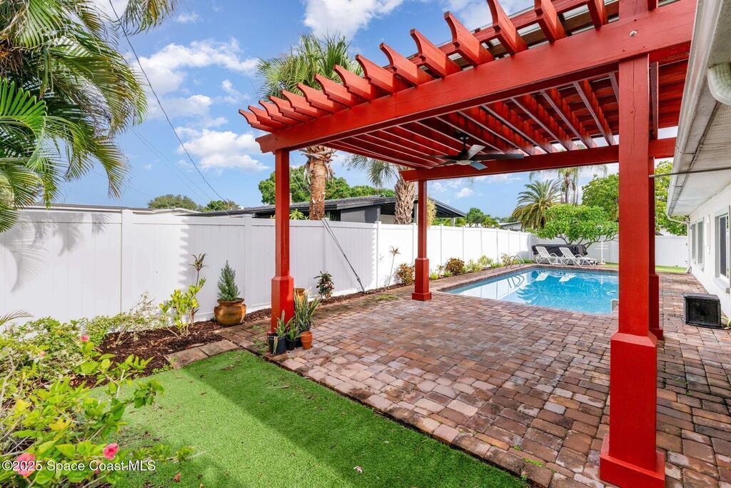 Back Up Offers Being Accepted. Minutes to the BEACH! NO HOA + pool + boat/RV parking! This 4BR/2BA, 2,376 SF corner-lot home blends indoor comfort with resort-style outdoor living. Inside, travertine and Brazilian cherry floors set a warm, upscale tone. A dedicated entertaining lounge with wet bar and wine fridge adjoins the main living area. The split plan separates three secondary bedrooms from a private primary wing with a 14-ft walk-in closet and a spa bath featuring an oversized rain-style shower. Out back, the tropical fenced yard offers a heated pool & hot tub, brick-paver deck, and a pergola patio--ideal for BBQs and evening lounging. Two driveways fit 6+ vehicles (bring the boat/RV). Inside laundry and generous storage. HVAC (heating & A/C) new in May 2025. Electric Pool Heater 2021 and New Pool Pump and Filter 2020. Minutes to Kennedy Space Center, beaches, Port Canaveral & SR-528.