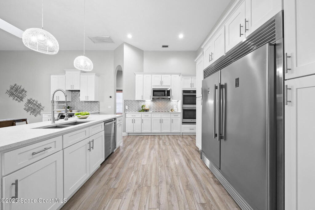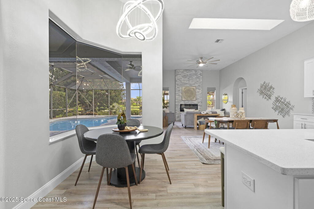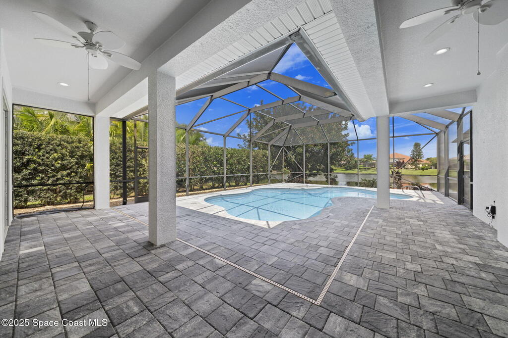 Nestled in a desirable, family-friendly neighborhood within Salerno Village's exclusive Ravencliff enclave, this custom 4-bedroom, 3-bath plus office home blends elegance and comfort with seamless indoor-outdoor living and peaceful lake views. The gourmet kitchen features quartz countertops, stainless appliances, double ovens, and a commercial-grade refrigerator, complemented by a wine bar with fridge. Expansive sliding glass doors open to a screened patio with a sparkling freeform pool and full summer kitchen overlooking the water. The luxurious owner's suite includes dual walk-in closets and a spa-inspired bath with soaking tub and oversized shower. Residents enjoy resort-style amenities including a swim club with Olympic-size pool, tennis and basketball courts, playground, pavilions, and scenic trails. Move-in ready, this home offers the perfect balance of relaxation and entertainment.