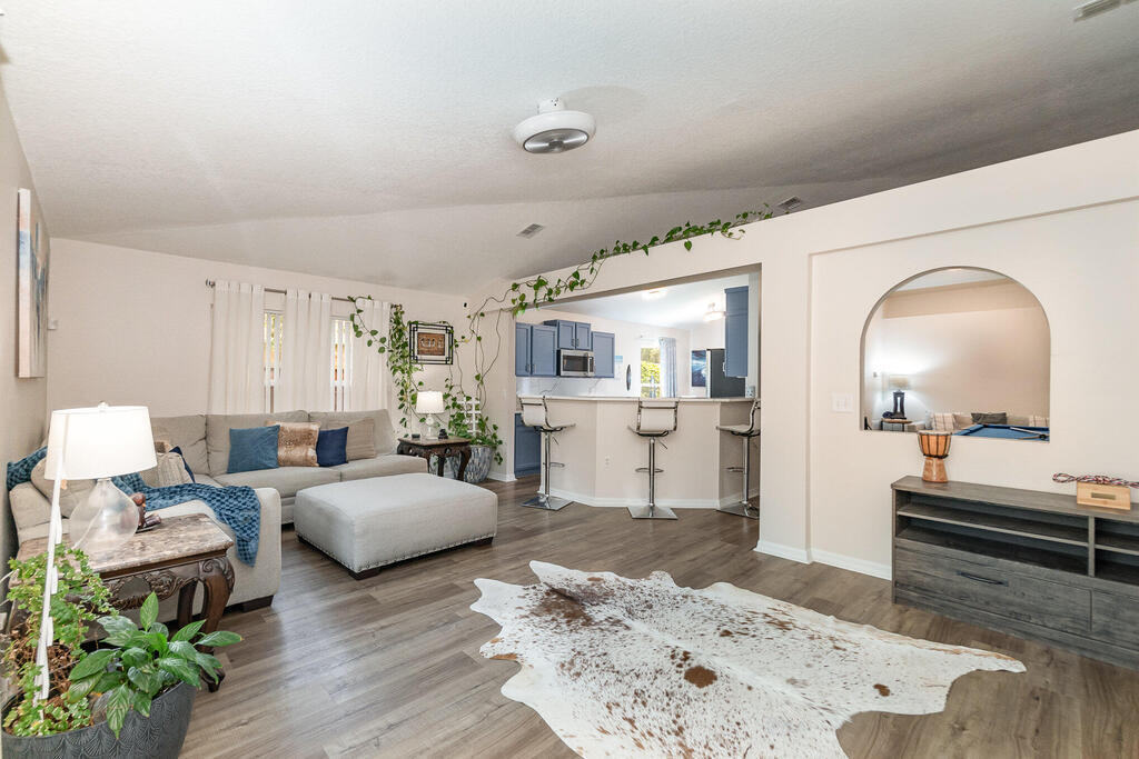 Lots of updates within the past years. New luxury vinyl throughout kitchen, bathrooms, laundry room, formal areas & family room. Updated the kitchen with quartz counter tops, stainless steel appliances & added gas for range. Breakfast bar off the family room and wraps around into formal area plus there is a breakfast nook in kitchen. Upgraded bathrooms with quartz counter tops & new toilets. New light fixtures & new laundry room door. Continue out to your new fenced in backyard with paver patio & gazebo canopy. Solar panels for energy efficiency. Screened in front entry & screen sliders on the garage. Community is gated with community pool. Roof 2022, A/C added in 2020, Water Heater 2020. Popcorn ceilings removed.