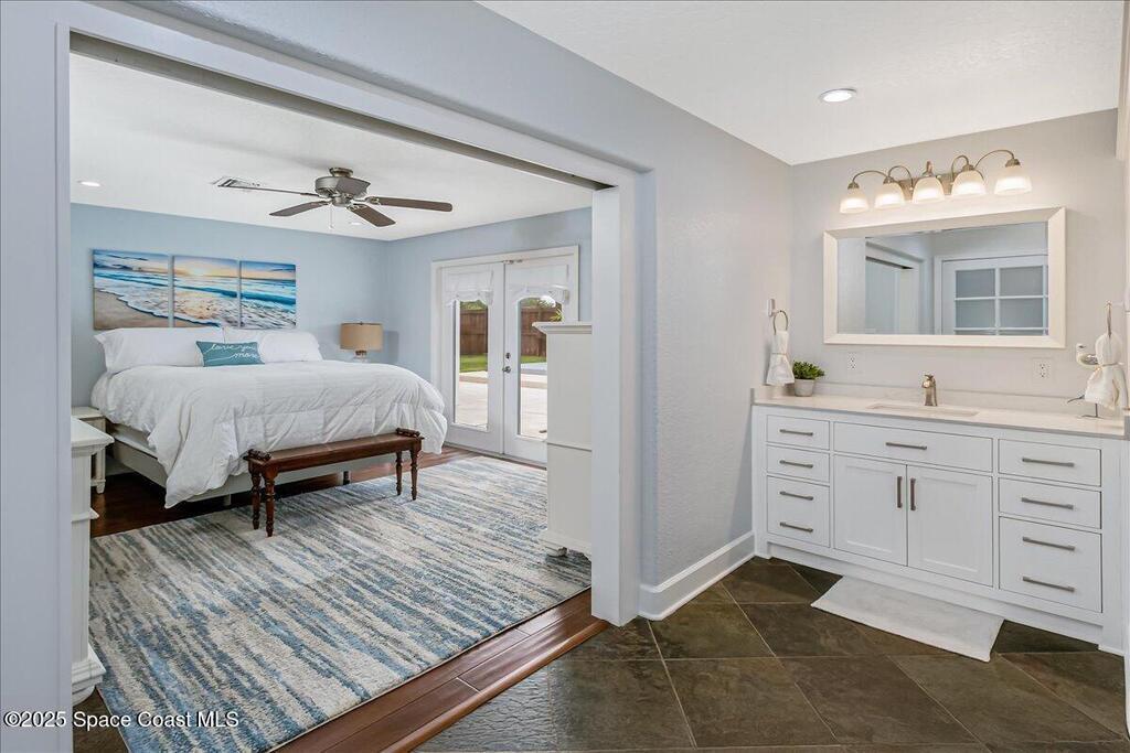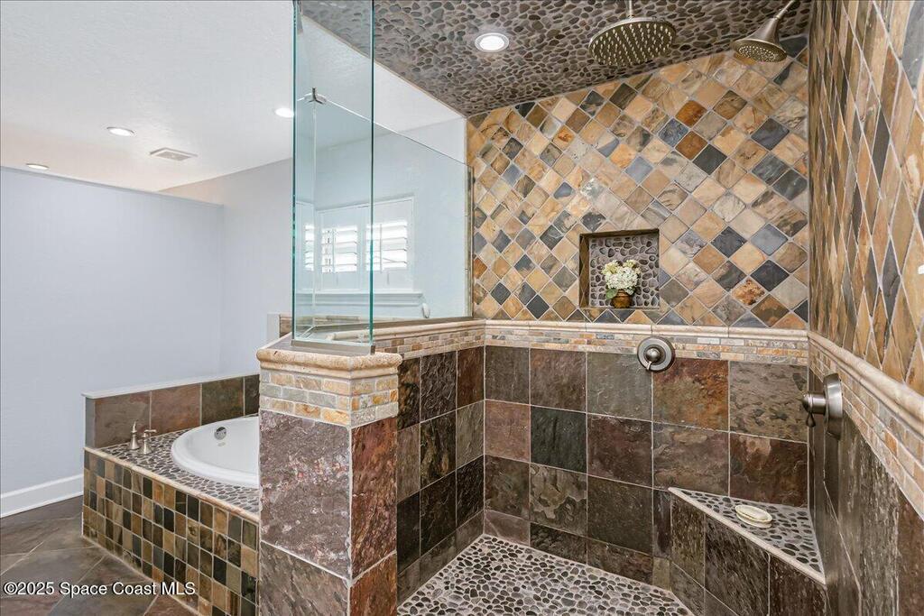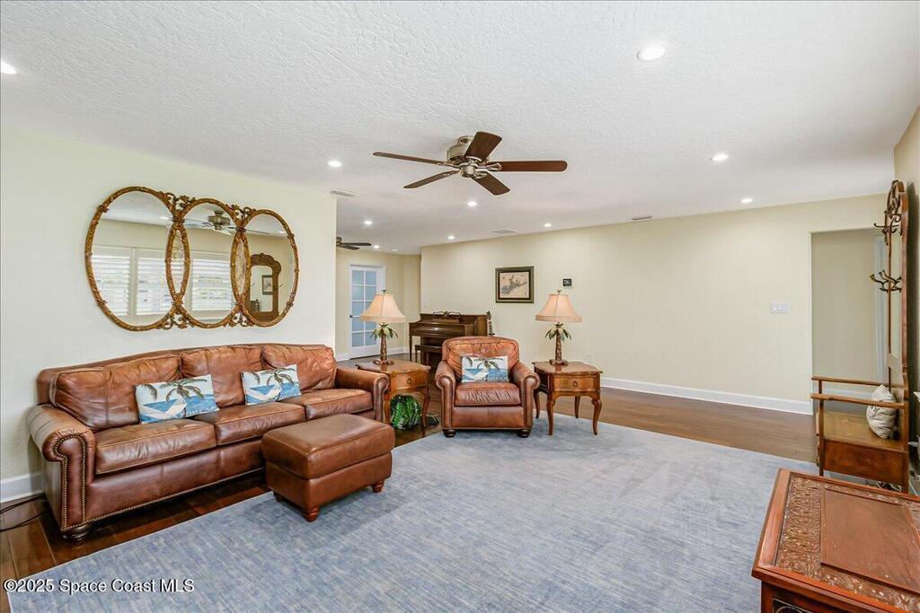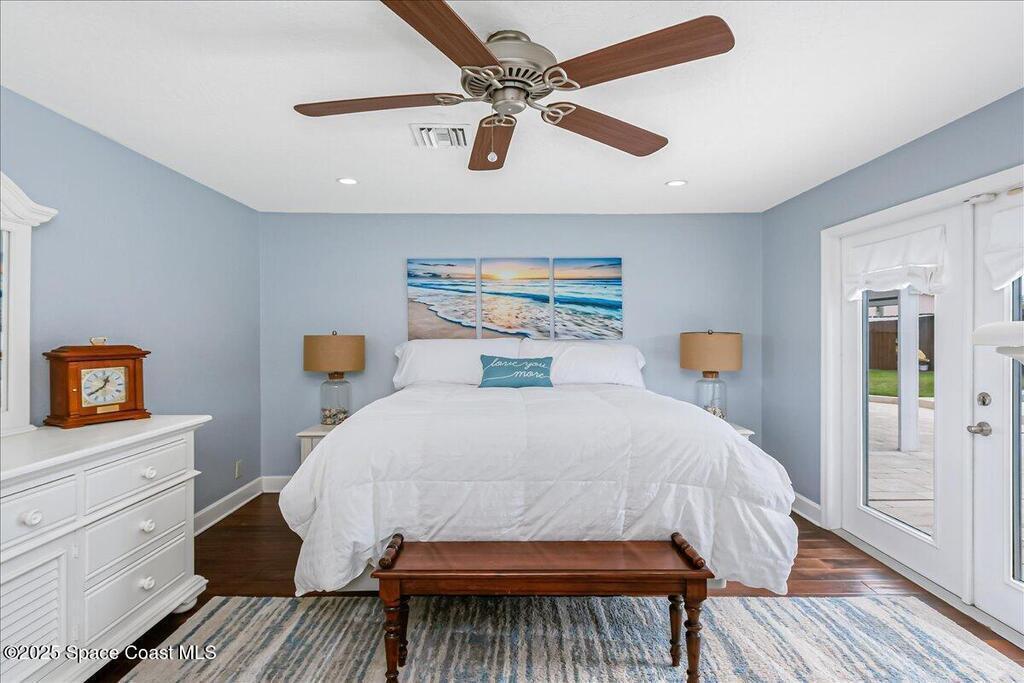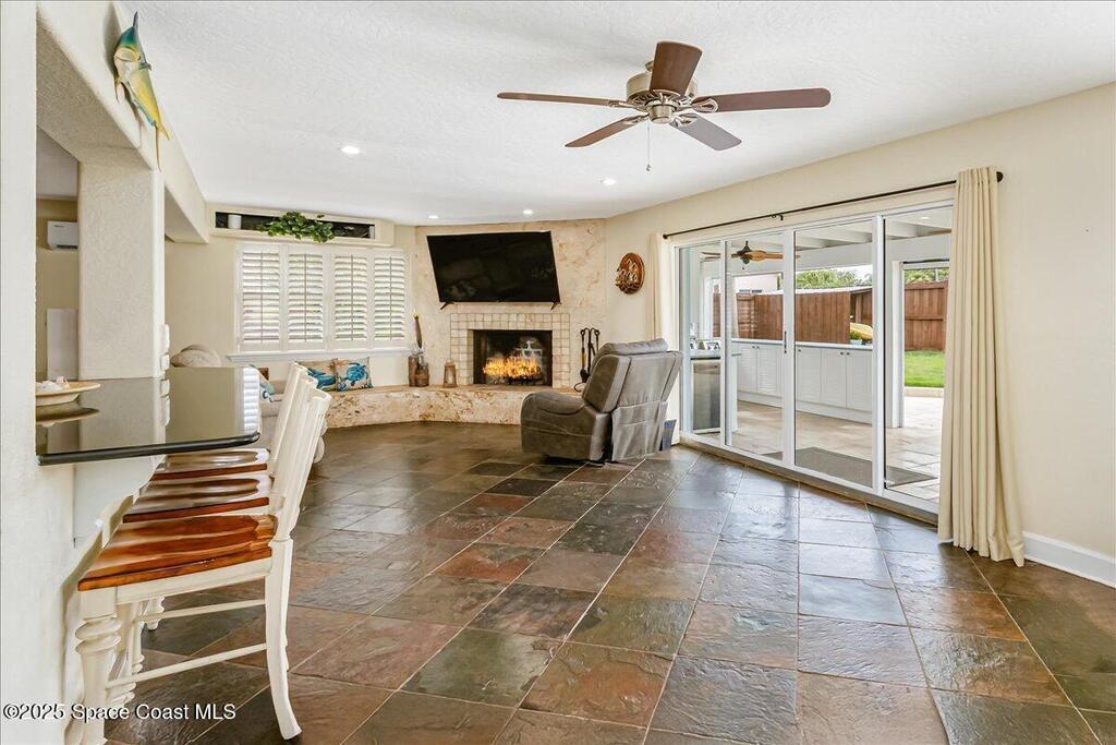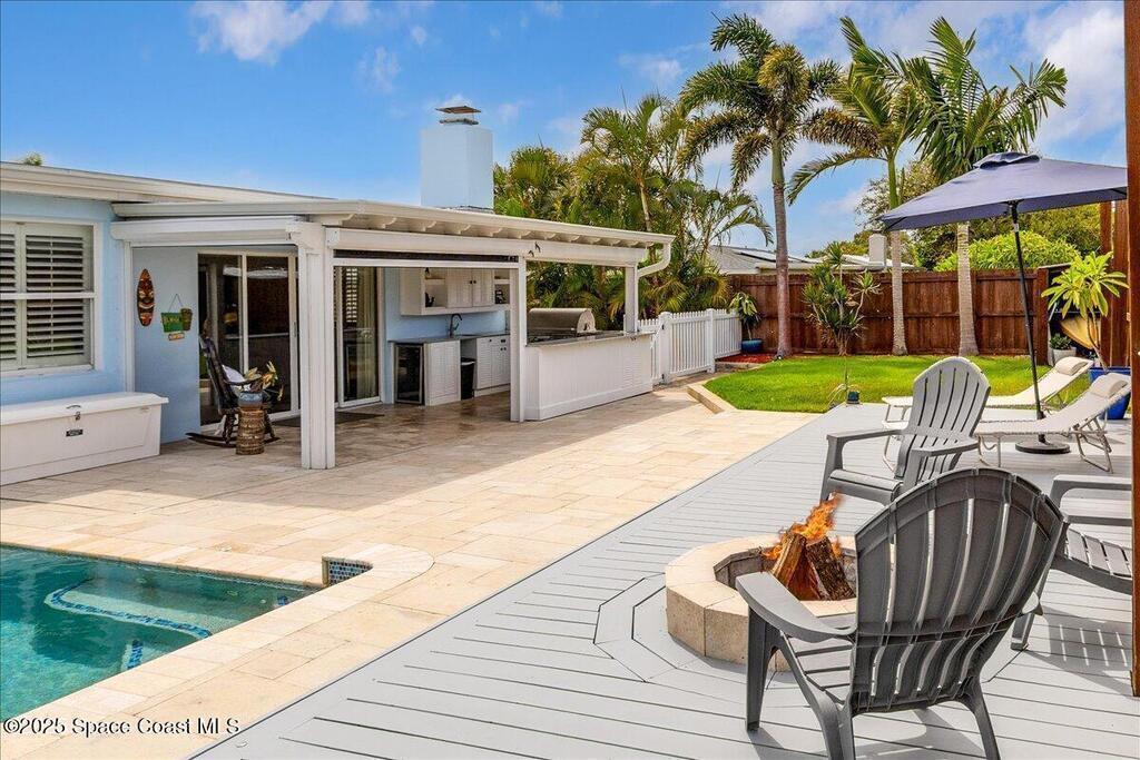 Beautifully updated Satellite Beach 4-bedroom pool home in move-in condition! The backyard is a tropical retreat featuring a large pool and spa, privacy fence, boat/RV parking, and a summer kitchen with TV, sink, fridge, grill, and electric hurricane screen. Enjoy the composite deck, firepit, and ideal entertaining space. Inside features wood and tile floors, plantation shutters, and a dream kitchen with granite, double ovens, gas range, stainless appliances, and bar with pull-out cabinets. Water filtration system under sink. The enclosed family room has a wood-burning fireplace and its own mini-split. Master suite includes French doors to the pool, walk-in closet, jetted tub, and walk-in shower. Major updates: new roof (2024), whole-house replumb, Cat 5 wiring, new pool/sprinkler pumps, tankless water heater. Close to beaches, A-rated schools, shopping, and dining. Simply a stunning beachside retreat you'll love to call home! Must see to appreciate.