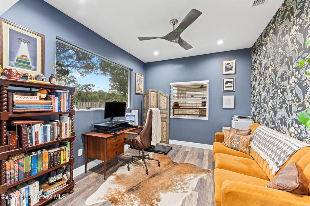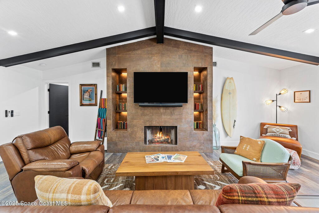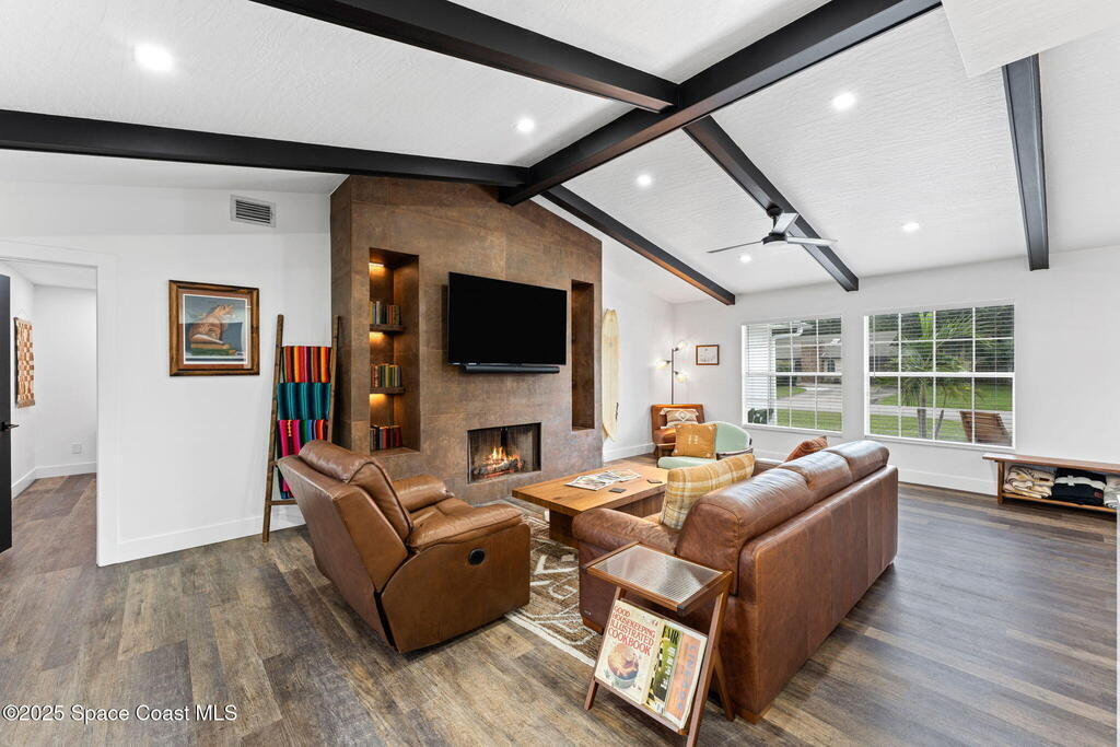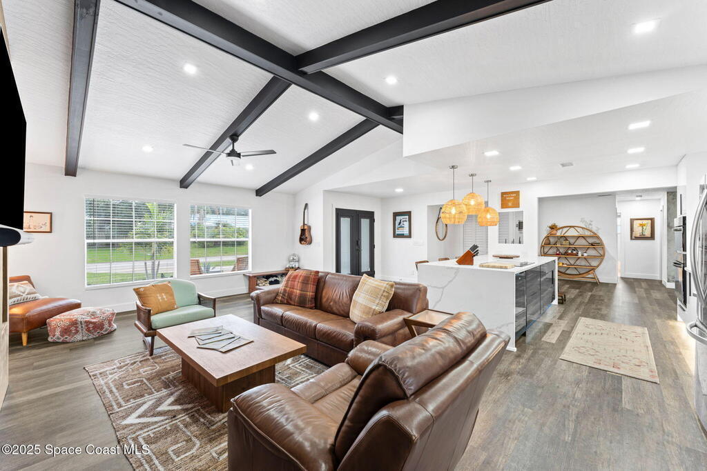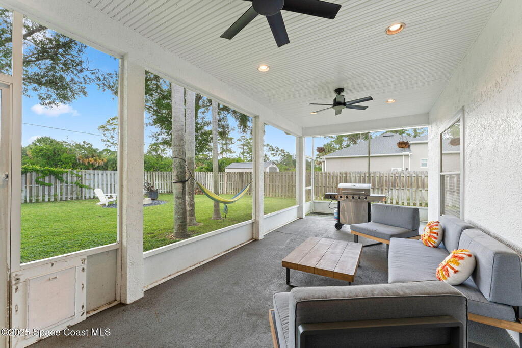 This Palm Bay gem brings all the vibes! With 3 bedrooms, 2 baths, and a 2-car garage, the open floorplan and vaulted ceilings make it feel light, bright, and wide open. The kitchen steals the show with a big island and wine cooler-perfect for cooking, sipping, or entertaining. Cozy up by the wood-burning fireplace, spread out with split bedrooms, and enjoy the convenience of LVT & tile floors throughout. Thoughtful updates include a tankless water heater, smart thermostat, and manual storm shutters for peace of mind. Outside, you'll love the screened patio, fenced yard, storage shed, and fire pit-perfect for gathering with friends under the stars. Stylish, functional, and move-in ready-this one checks all the boxes!