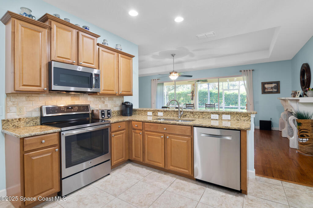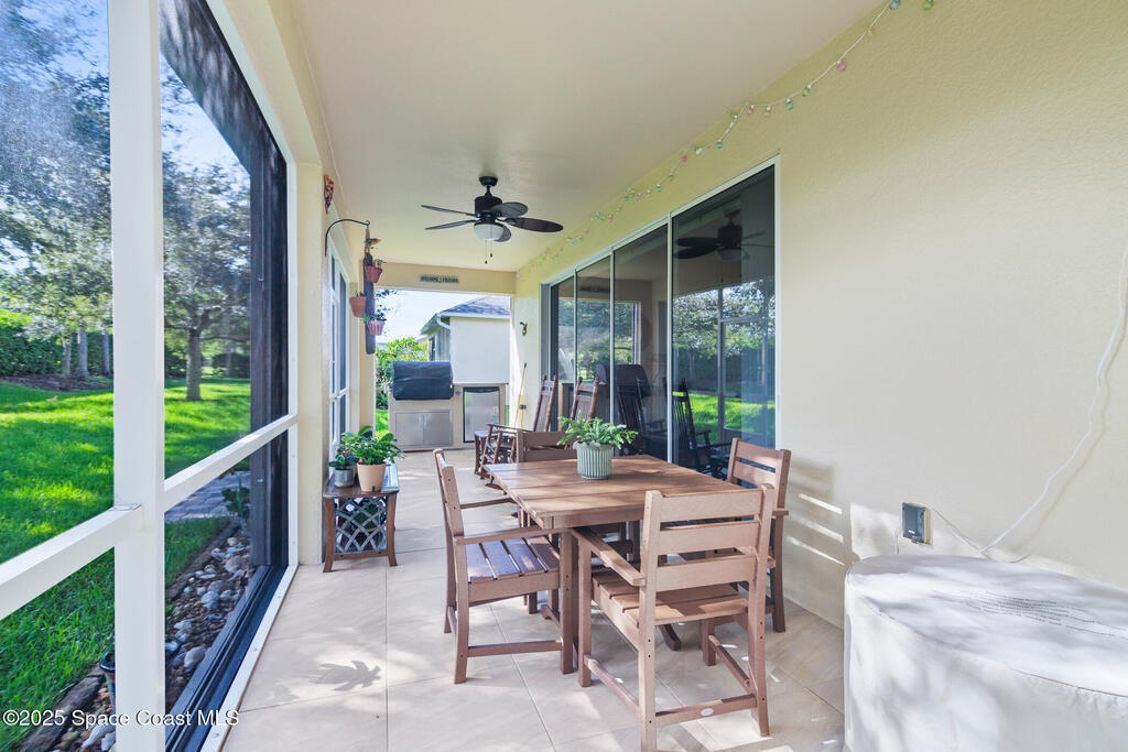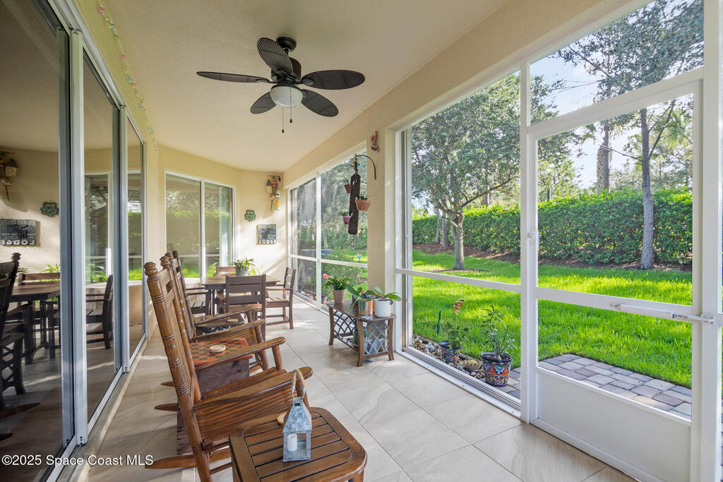 Experience refined, low-maintenance living in this beautifully maintained, move-in ready home located in Brevard's premier 55+ guard-gated community with 24-hour security. This 3-bedroom, 2-bath residence showcases a spacious, truly open floor plan with rich hardwood flooring & tile in the kitchen, baths, & laundry. The chef's kitchen features abundant solid wood cabinetry, granite countertops, & an expansive breakfast bar - perfectly positioned to stay connected with guests in the adjoining great room. A coffered ceiling crowns the great room, while pocketing quad sliders open to a large, tiled, under-truss screened lanai with a summer kitchen & a private, serene backyard. The spacious owner's suite offers custom closets & a spa-like ensuite bath with split vanities, a soaking tub, & walk-in shower. Recent upgrades include a NEW 2025 roof & gutters, fresh interior/exterior paint, accordion storm shutters, & impact rated front door. Elegant & move-in ready, this home truly has it all.