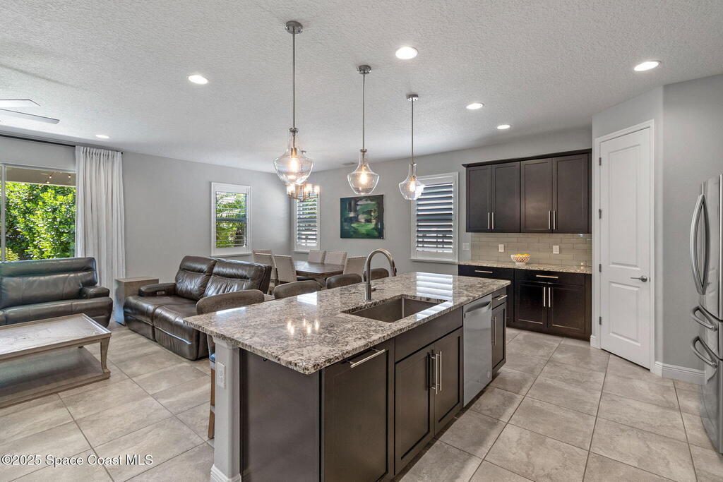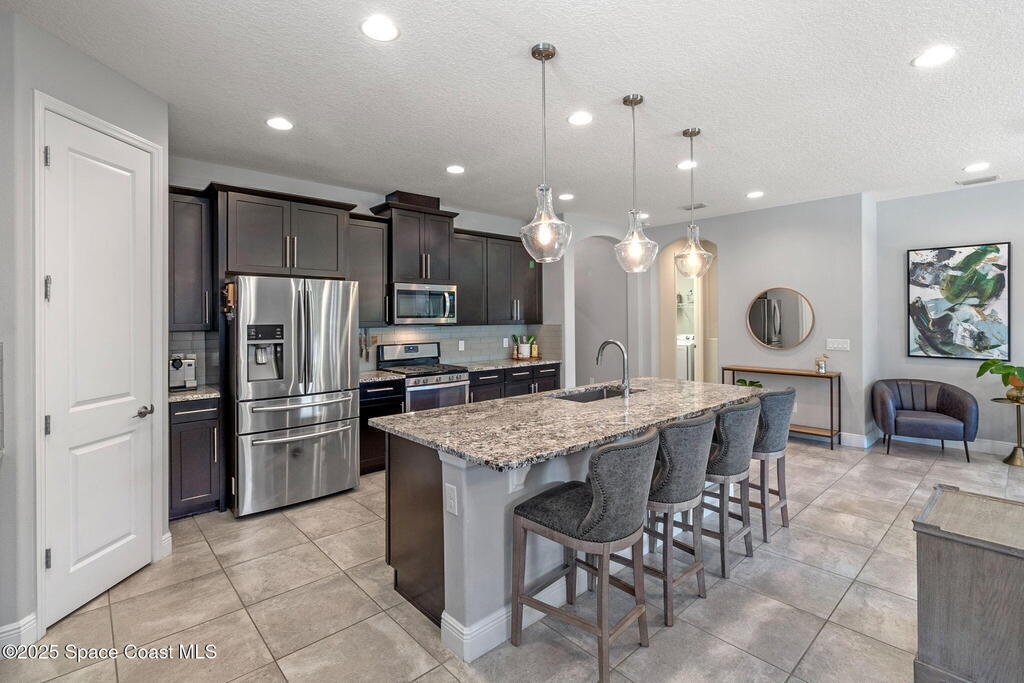 Welcome to luxury living in this immaculate 4-bed, 3.5-bath home in Trasona, offering a premium floor plan, luxury finishes, and practical upgrades throughout. The functional 2-level layout offers 3 bedrooms on the first floor and a large playroom, separate bedroom and en suite upstairs. A few key features of this home include tall ceilings and 8' doors, plantation shutters in the living room and master bath, newer vinyl flooring in downstairs bedrooms, upgraded half-bath, recessed lighting, laundry room wash sink, storage shed in the back yard, and a spotless, epoxy coated 3-car garage floor. Beyond the charming front porch and landscaping, the heart of this home lies in the wide open kitchen and living area. The spacious kitchen showcases upgraded stone countertops, oversized single basin sink, gas stove, abundant cabinet storage, walk-in pantry and a coffee bar. Next, step into the luxurious, oversized primary suite where you'll find tray ceilings, a spa-like