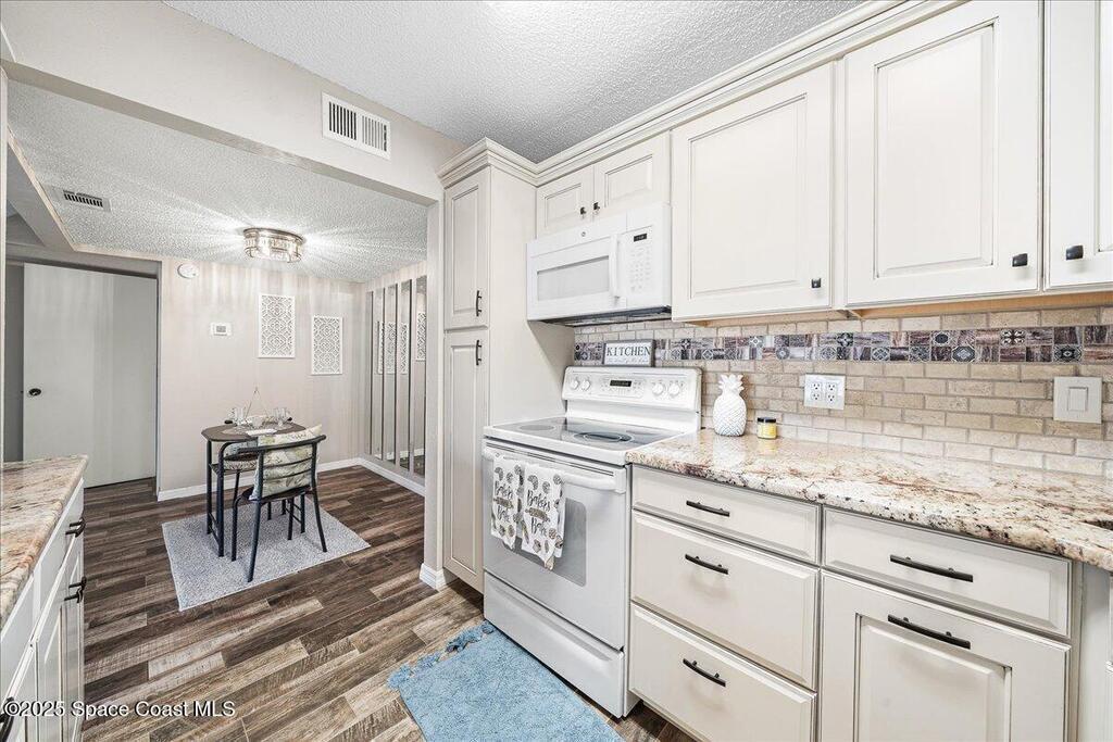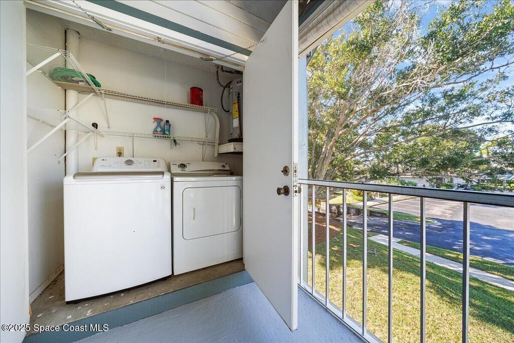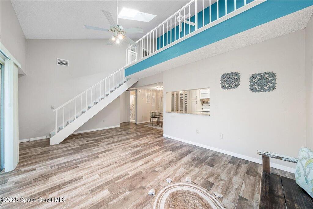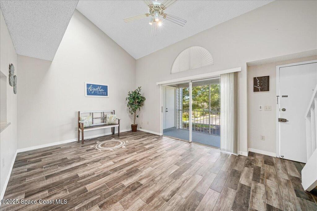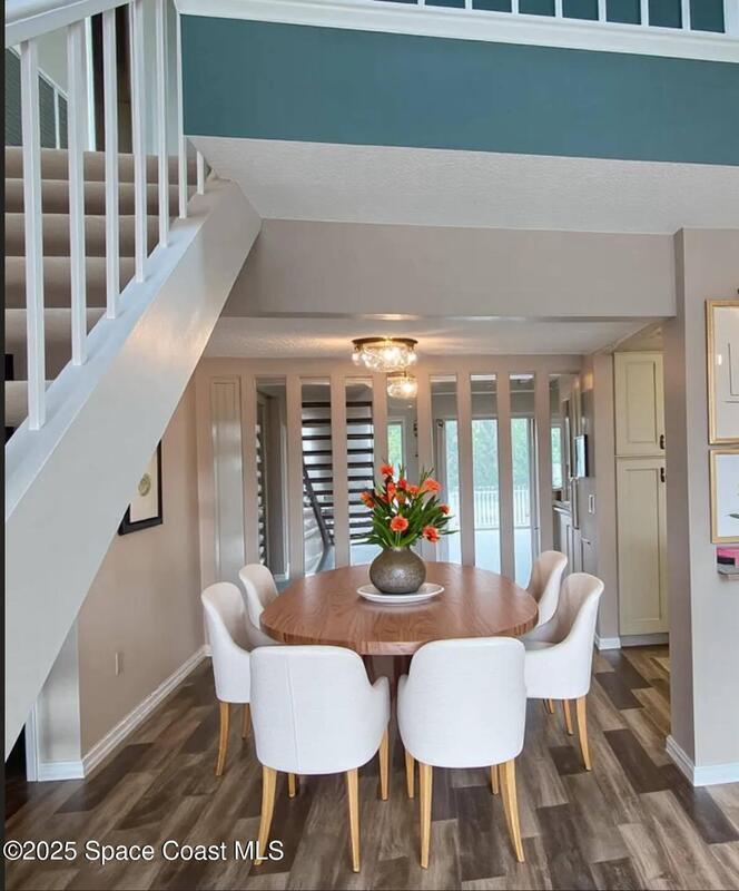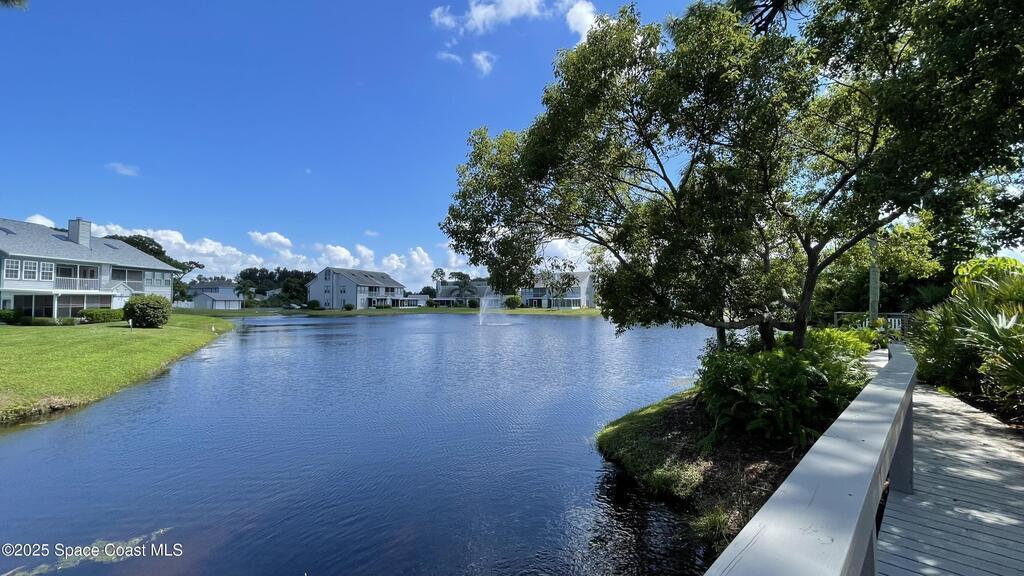 Perfect Location for easy access to I-95 , shopping, parks, downtown Melbourne & a short drive to area beautiful beaches. Welcome home to this ''move in ready condo'' (end unit) on 2nd level. Featuring an open plan design with family room, dining area, and newly updated kitchen with designer coastal color cabinets, granite countertops, tile backsplash, and a pass through / bar area. Main bedroom just off dining room with private bathroom and walk in closet. Wood look Tile plank flooring throughout. A quaint screened in front balcony has views of lake and faces community clubhouse / pool / tennis courts area. Access to laundry space is just off the balcony. Spacious Loft area can be used as 2nd bedroom, office or Flex space. Full bathroom just off the loft. Other features include: ceiling fans, window coverings, sky-lights, decorative mirror in dining area & storm door at entry. HOA includes: water, cable, i-net, roof, exterior paint. New A/C 2024 & breaker box with surge protector .