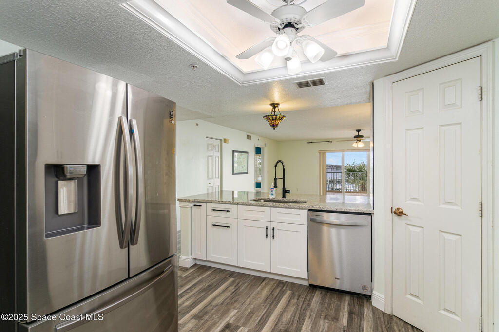 Experience breathtaking views, sunrises, launches, fireworks & boat parades like never before from your balcony over-looking the Indian River. This 2 bedroom/2 bath waterfront condo is move-in ready. Unit has been smartly updated including a complete kitchen remodel within the last 2 years with all new stainless steel appliances, granite countertops, soft-close wood cabinets, & tile backsplash. Other updates include a shiplap accent wall in the living area, new vinyl plank flooring & fresh paint throughout. HVAC replaced in 2018.Excellent condo management has resulted in a completed SIRS and full financial reserves! Specials assessment has already been paid in full by the Seller. Resort-style amenities include: heated pool, spa, riverside boardwalk fitness center, sauna, tennis/basketball/pickleball court, club room with pool table, library and kitchen. This active community is ready to welcome you to this riverside paradise!