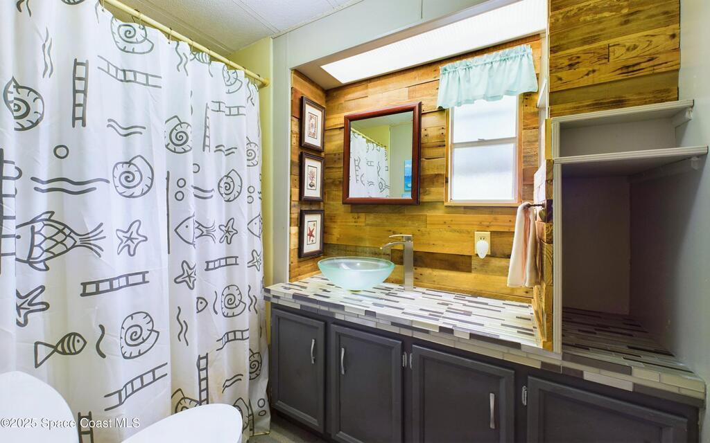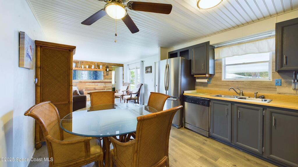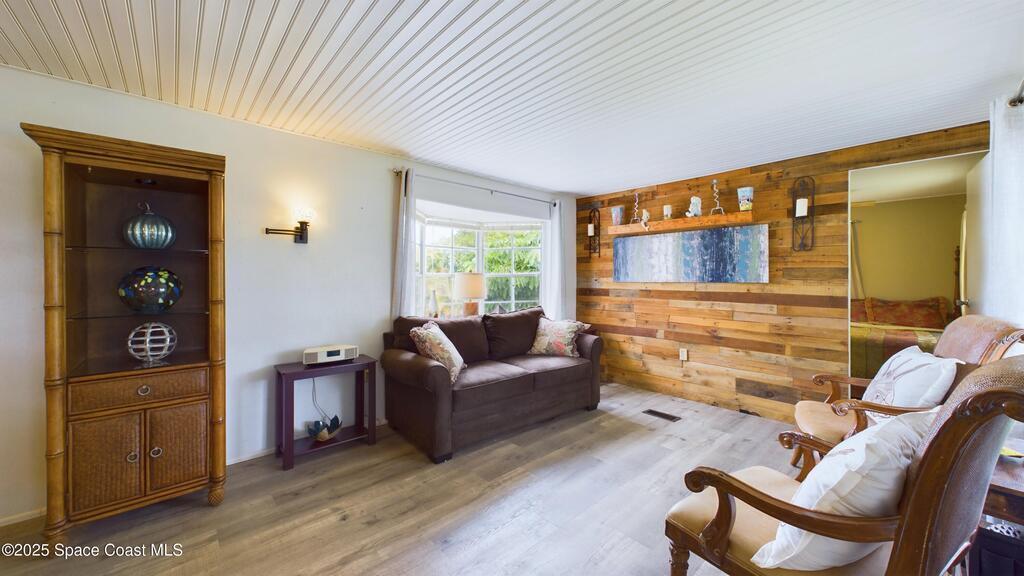 Turnkey and fully furnished, this updated Barefoot Bay home sits on a rare oversized corner lot and features 2 bedrooms plus a private bonus room, perfect as a 3rd bedroom or flex space and a second living room. Combining rustic charm with a coastal vibe, this beauty features an eat-in kitchen with stainless steel appliances, hard-surface flooring, a big bay window, and wood accent walls. Enjoy Florida coastal living with access to pools, clubhouse, tennis, pickleball, fishing pier, and more. Recent upgrades include a 2020 roof, repiping, new ductwork, vapor barrier, new ceilings, modern lighting, and the 2023 room addition (with central AC). Property also boasts hurricane shutters, indoor laundry, pantry, and workshop/storage. This pet- and golf-cart-friendly community has no age restrictions, with HOA fees conveniently included in your ad valorem taxes. Close to beaches, shopping, and dining, it's perfect for year-round living or a charming vacation retreat!