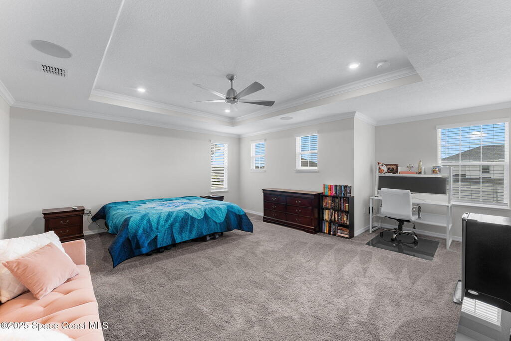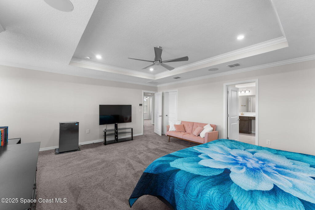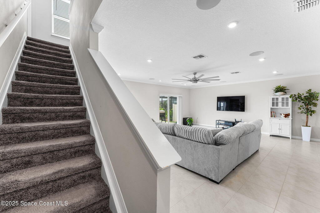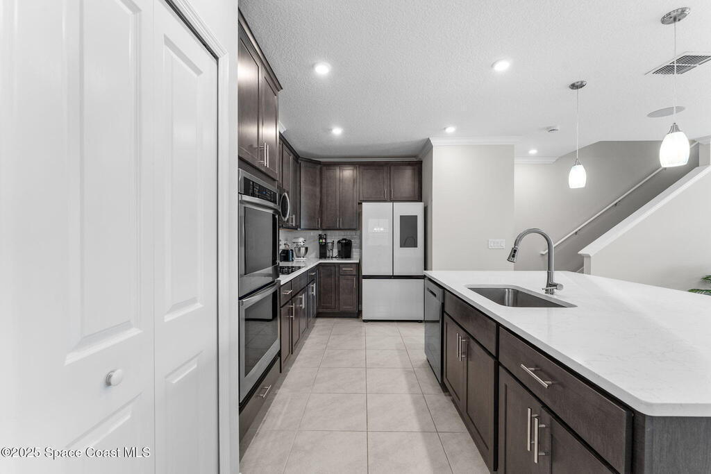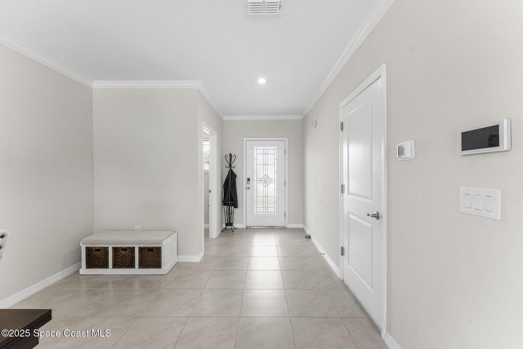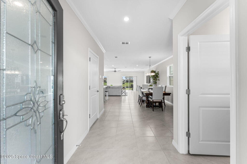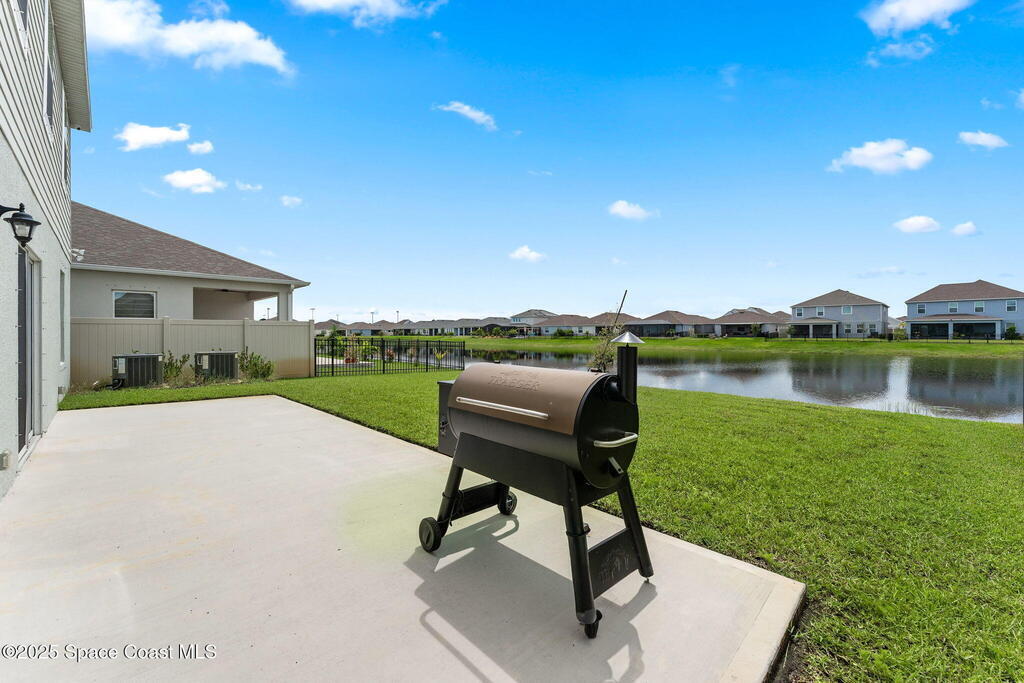 Step into the WOW FACTOR - a 2023-built lakefront stunner in Palm Bay's gated enclave. This 6-bedroom, 4.5-bath, 2-story home has space for everyone plus a 3-car garage to match. From the covered front porch to the open-concept island kitchen with quartz counters and surround sound system, every detail is dialed for modern living. Upstairs, retreat to your primary suite with a spa-worthy walk-in shower, walk-in closet, and laundry just steps away (yes, laundry upstairs-game changer!). Bonus: a full guest suite downstairs for visitors or multi-gen living. Tile and carpet flooring, a full security system, manual storm shutters, and a backyard lake view worth lingering over round out the perks. Big family? Big dreams? Big vibes? This one's got you!