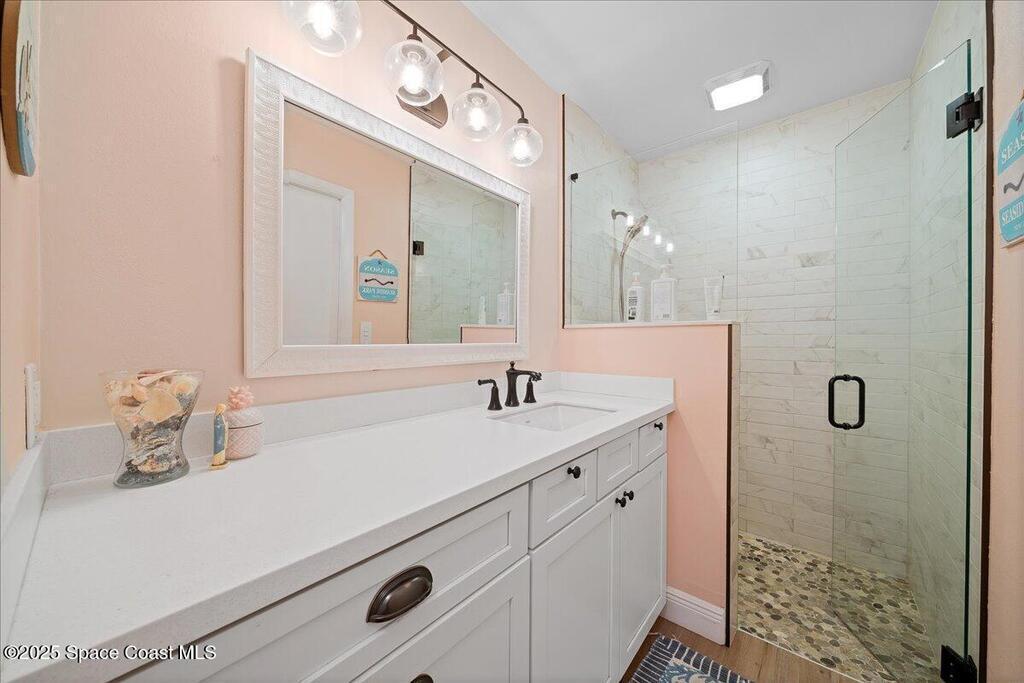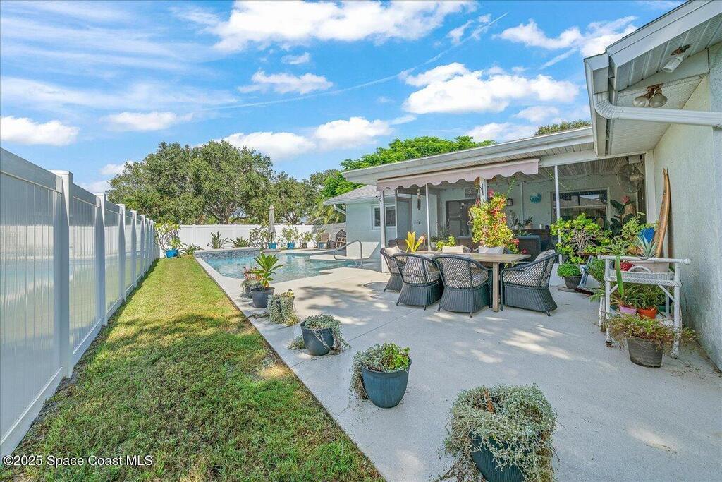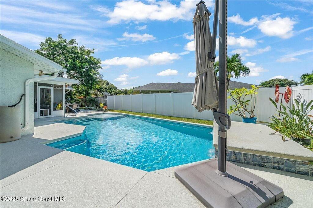 Beautiful beachside remodel in one of the most desirable 'newer' areas of Satellite Beach. The 1983 construction means PVC sewer lines, no cast iron. Wood-looking title flowing through all living areas of the home. Updated Kitchen features stainless appliances. Primary Bedroom features double walk-in closets and gorgeous shower with frameless glass door. Guest Bathroom features subway titled shower and double sink vanity. Exterior painted in 2020, vinyl soffit/facia and gutters in 2020. Easily maintain the excellent curb appeal with (2020) irrigation and deep well pump. Roof is three years old. 2025 new impact windows. 2022 natural gas tankless hot water heater. 2022 natural gas cook top/stove. 2024 pavers which allows for three car parking. New salt water pool (2022), with two water falls and island. Excellent insurance rates with Cat5 windows, truss straps and Concrete block construction. Whole house re-insulated in 2017. Awesome corner lot, don't hesitate!