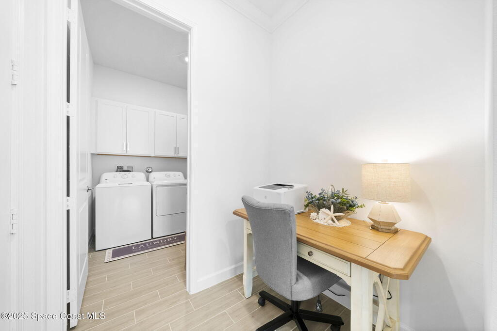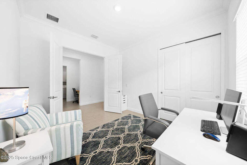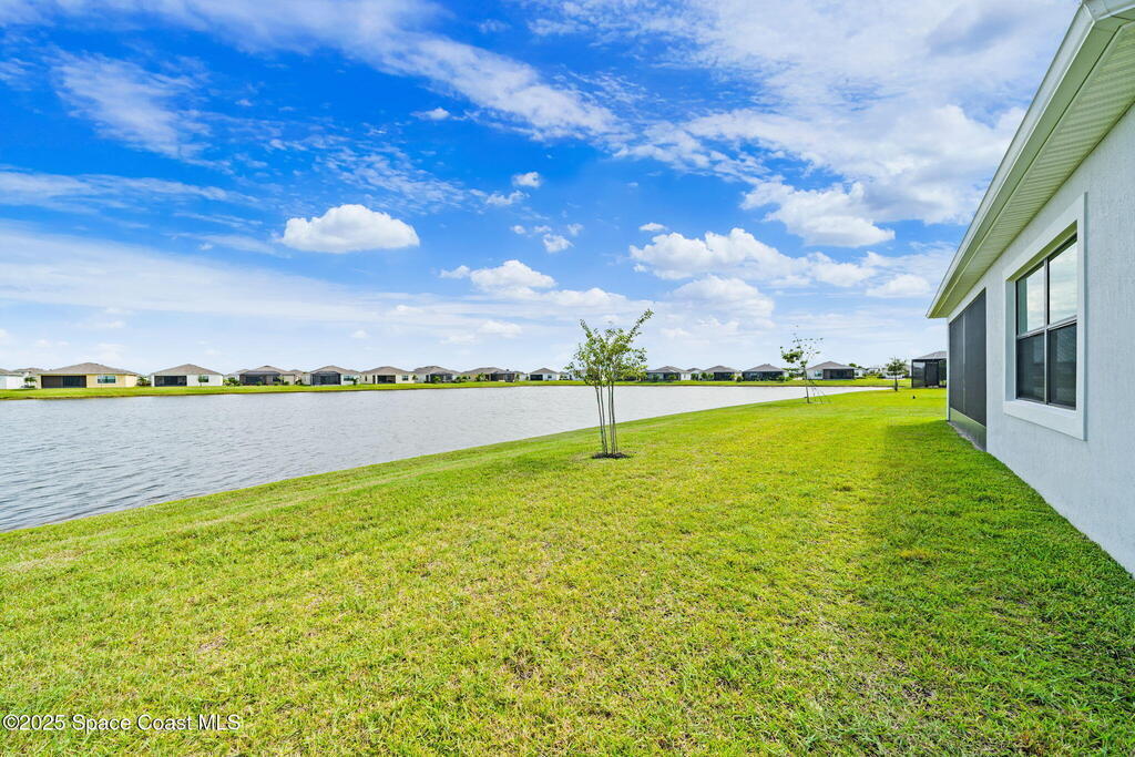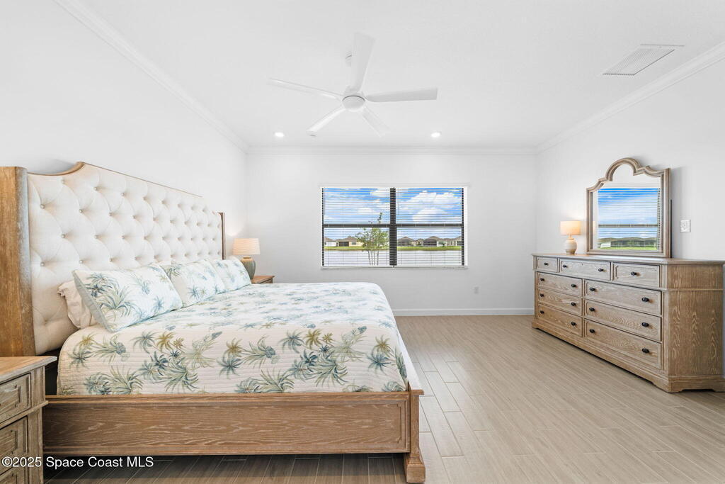 Welcome to Bridgewater at Viera, one of Brevard's most sought-after 55+ communities. Great value here! This 3 bedroom + FLEX room with closet, 3.5 bath home was built in 2023 and offers the popular Key Largo floor plan with 2,375 SF of thoughtfully designed living space. Inside, you'll find an open layout with upgraded PLANK TILE floors throughout (no carpet!), CROWN MOLDING, and all IMPACT WINDOWS and SLIDERS. The kitchen is a showstopper with crisp white cabinetry, QUARTZ countertops, tile backsplash, and plenty of space for entertaining. The primary suite feels like a private retreat, featuring a spa-style bath with double vanities, an oversized walk-in shower, and a huge closet. Two of the guest bedrooms have their own PRIVATE en-suites, perfect for visiting family or friends. Step outside to a screened-in patio overlooking PANARAMIC LAKE VIEWS with southeast exposure, perfect for sipping coffee during sun-filled mornings and unwind at the end of the day with shaded evenings. MORE