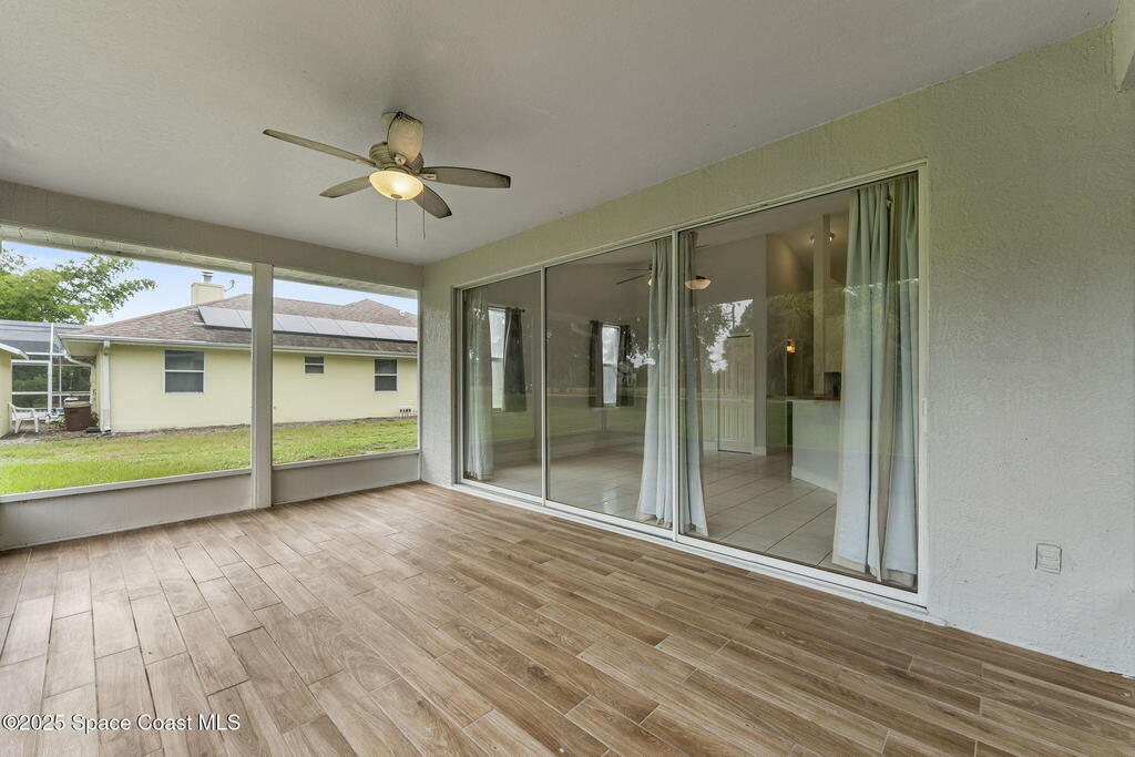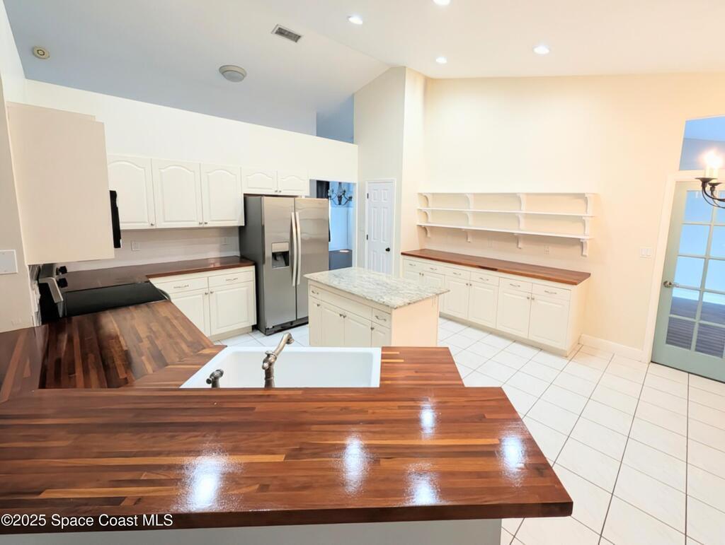 Welcome to this beautiful Merritt Island home featuring cherry butcher block countertops, stainless steel appliances, and a granite-topped island. Double doors open to the spacious master suite with a luxurious bath offering a stand-alone tub and dual cherry vanities. Enjoy formal living, dining, and family rooms plus an enclosed sunroom--perfect as a workout space or playroom. Freshly painted inside and out with impact windows, this home sits on a .34-acre lot with a large backyard, patio for outdoor dining, and plenty of room to add a pool. Come see this move-in ready gem today! Roof 2021, water heater 2023, Vinyl plank in master and living room. New Carpet in bedrooms 2 & 3. Tile located in kitchen, hallways, family and bathrooms.