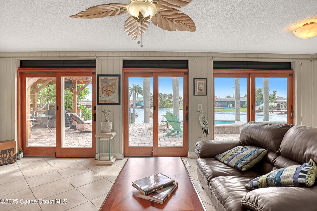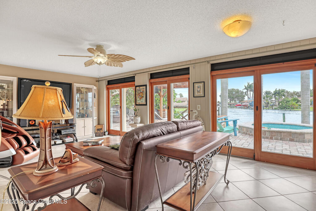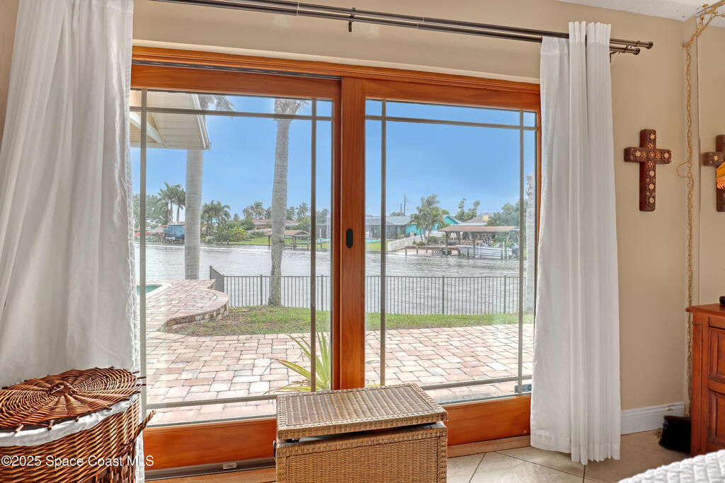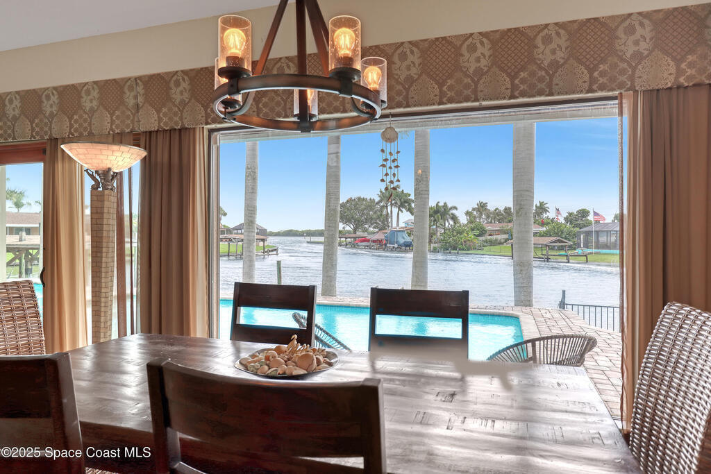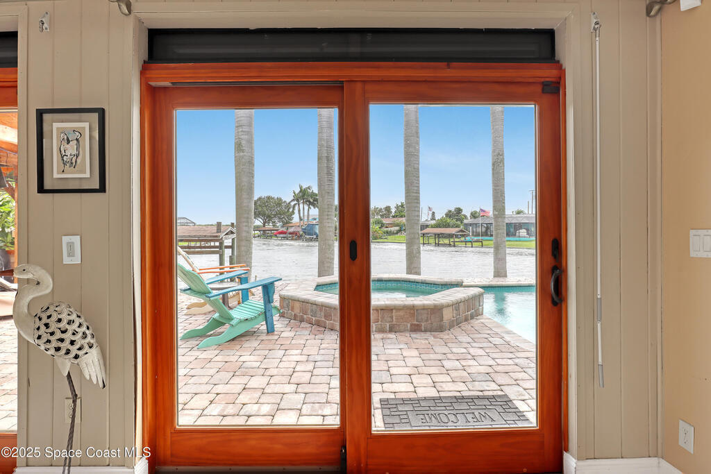 Experience unparalleled water views from this stunning pool home, ideally situated at the intersection of two canals. It features a covered boat dock with a lift, as well as a jet-ski lift, making it an ideal spot for water enthusiasts. The outdoor area is a true oasis, complete with a tiki covered patio, a sparkling pool, and a relaxing hot tub, all surrounded by majestic queen palm trees. Inside, the kitchen is a chefs dream equipped with a natural gas commercial range and oven, a beautifully vented ornate hood, custom cabinetry and gorgeous granite countertops. The kitchen is seamlessly open into the dining and living room areas, offering panoramic views of the water and pool. There are 2 master suits, each equipped with sliding doors that take you outside to a brick paver patio area. This home features Anderson Hurricane Windows and also full hurricane protection with electric powered hurricane shutters. Newer roof as well.
