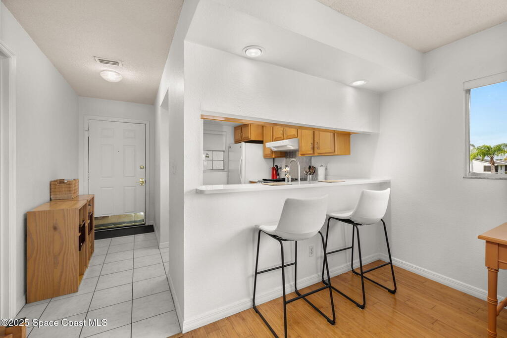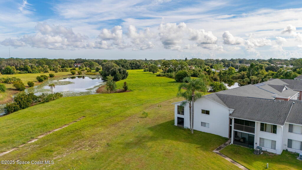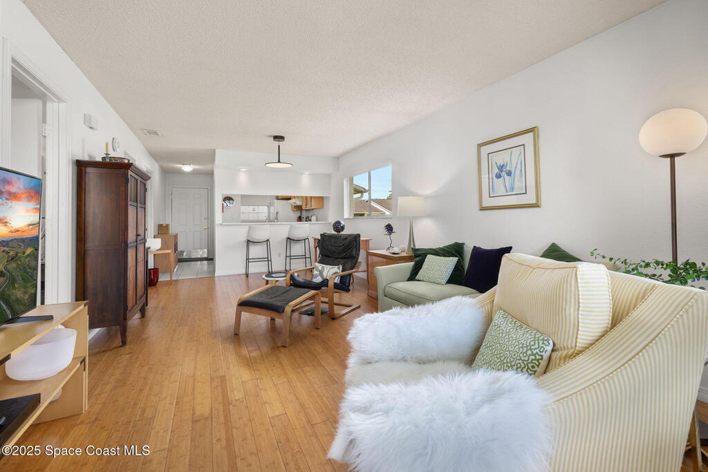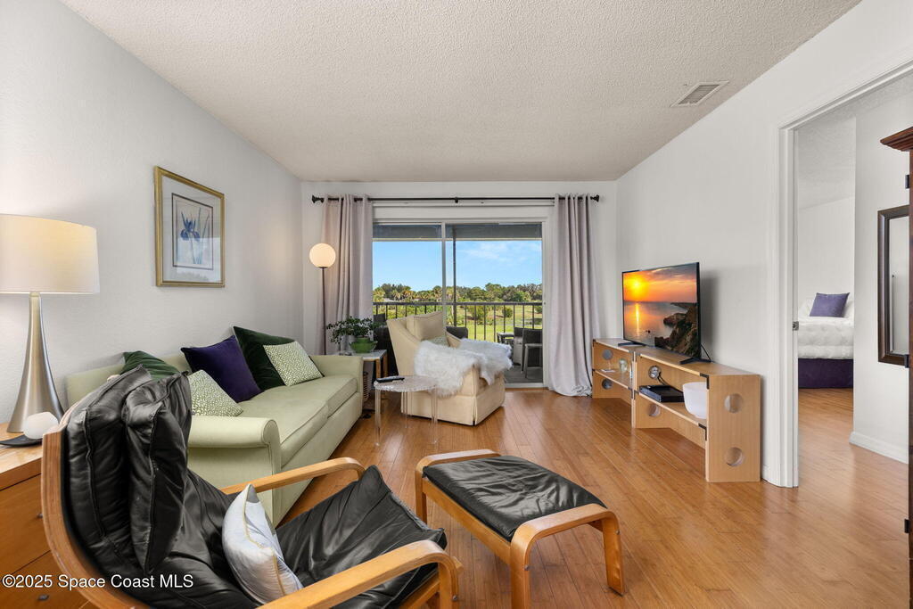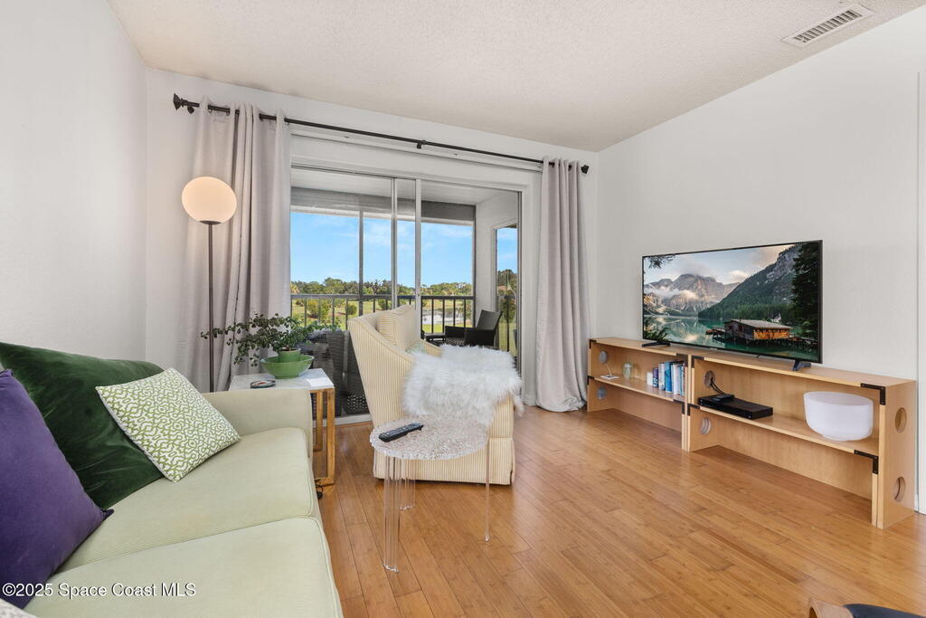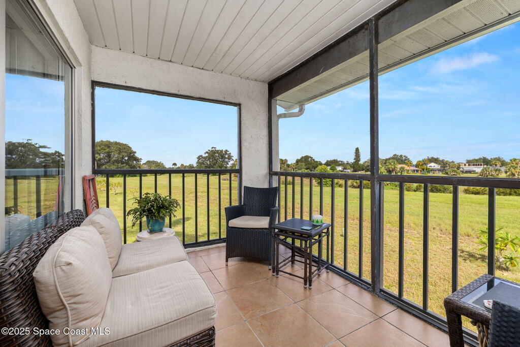 Experience Florida living at its best in this beautifully updated partially furnished corner-unit condo with western exposure, where you can enjoy gorgeous sunsets from your private screened balcony overlooking the former Royal Oak Golf Course. This 2-bed, 2-bath home features an updated kitchen with Wellborn cabinets, white quartz countertops, upgraded appliances, modern lighting, and bamboo wood flooring throughout. The primary suite offers a walk-in shower while the guest bath includes a tub/shower combo. Convenience is key with an in-unit LG washer & dryer (2024), plus peace of mind from recent updates: tankless water heater (2024), updated electric panel (2024), and A/C with heat pump (2016). Enjoy year-round sunshine at the heated community pool or watch rocket launches right from your balcony. This pet-friendly community allows two pets up to 24 lbs, making it the perfect blend of comfort and lifestyle. Don't miss your chance at purchasing this charming coastal retreat!
