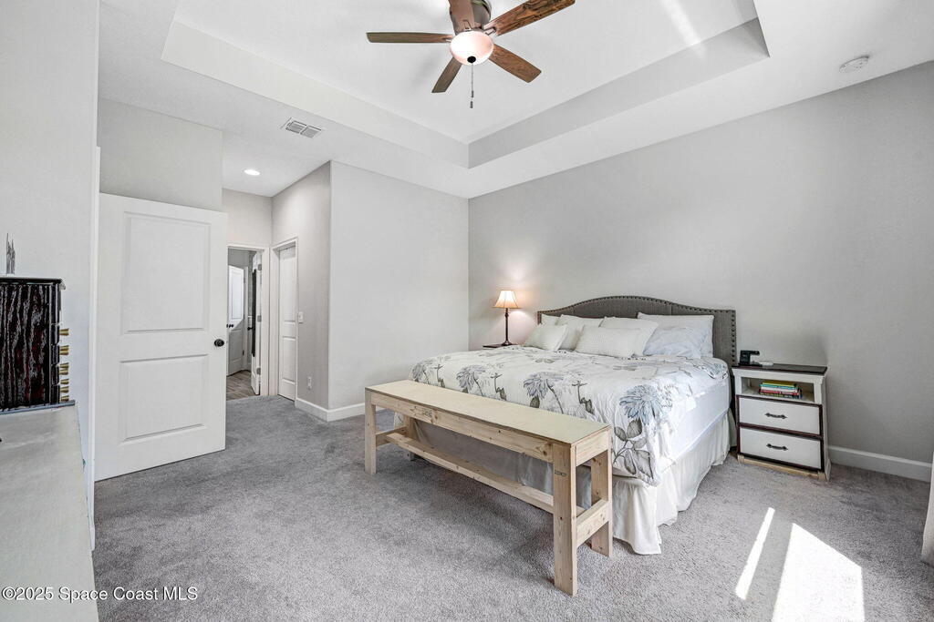 This beautiful 2022 split plan home offers 3-bed + a study/flex room 2.5 baths, perfectly designed for today's lifestyle. The open-concept layout features 9'4'' ceilings, tray ceilings in the master suite and great room, tile flooring throughout except in bedrooms, 5 1/4'' baseboards, updated ceiling fans and modern fixtures. The kitchen is the ultimate gathering spot boasting 42'' crown-molded soft-close cabinets and drawers, granite countertops, pendant lights over the large island, recess lighting and plenty of storage space for all your must-haves! The primary bath comes complete with a spacious tiled-to-ceiling walk-in shower for a spa-like experience, double vanity with quartz countertops, and a private water closet. Additional features include a study/flex room with double door entry, dining nook, laundry room, 8' tall garage door, covered screened in back patio with no rear neighbors, 2023 solar panels for extra savings and gutters framing the home. City water, no HOA, close to