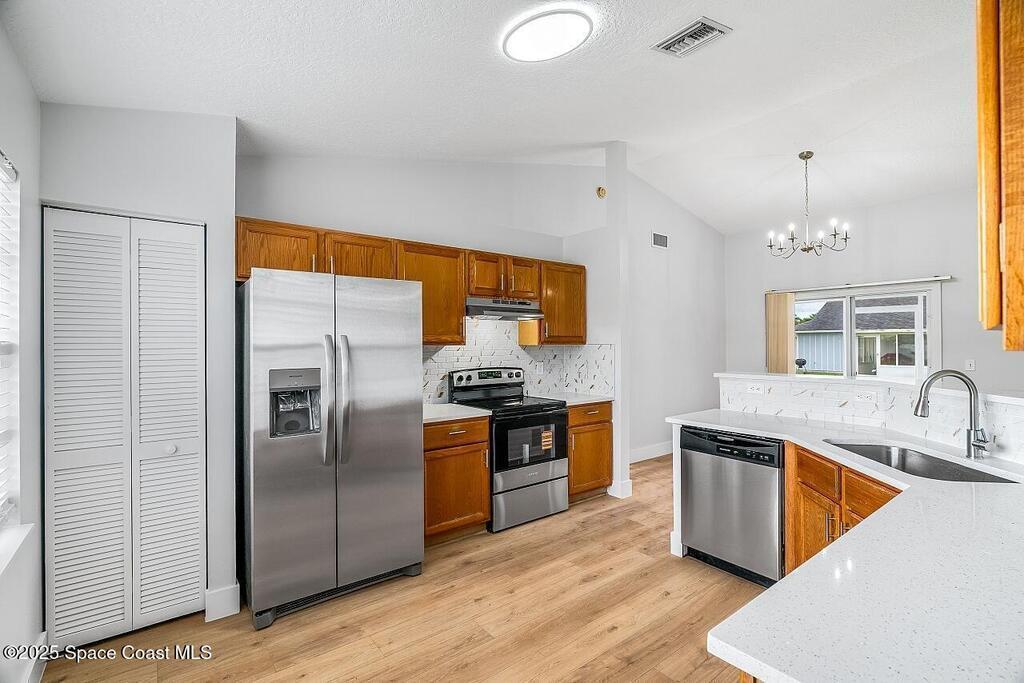 Prime Vero Beach location close to shopping, dining & the beach. NO HOA! This beautifully remodeled 3 bedroom, 2 bathroom home features a modern kitchen with bar top seating, quartz counters, upgraded cabinets, custom backsplash & stainless steel appliances. Freshly painted inside & out with new flooring throughout, new baseboards, LED lighting, stylish fixtures & fans in every room. Enjoy updated bathrooms with stylish finishes + stay cool in the spacious screened patio with fan. This home is complete with a New roof (2025), New AC (2025) & water heater (2023). 9 minutes or less to the beach!