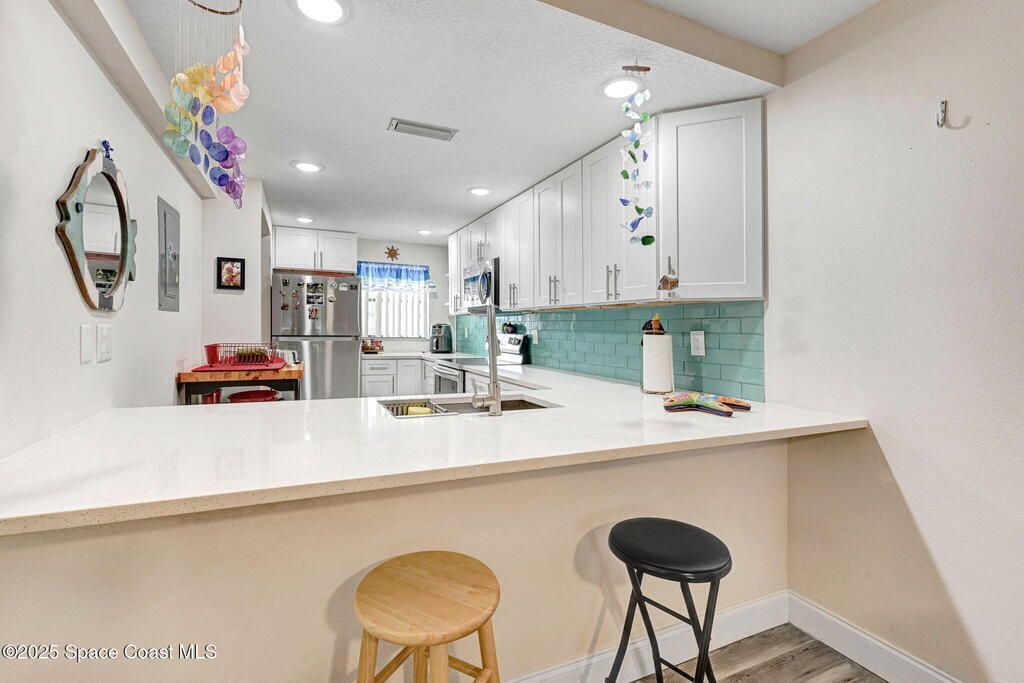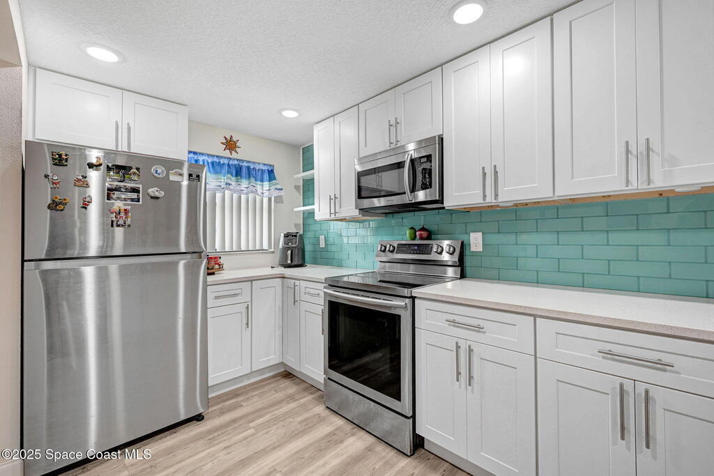 Enjoy the ultimate beachside retreat in this stunningly remodeled condominium, where every detail has been meticulously upgraded to elevate your lifestyle. Discover a gourmet kitchen perfect for culinary creativity, boasting sleek white shaker cabinets, quartz countertops, and stainless steel appliances. The luxurious bathrooms and expansive closet spaces are designed to impress, while waterproof plank flooring and a detached garage provide added convenience. With its prime location near top-rated schools, shopping, and medical facilities, and just across from Paradise Beach Park and the Atlantic Ocean, this incredible residence offers the perfect blend of relaxation, recreation, and opportunity. HOA includes all the utilities plus amenities except electricity.