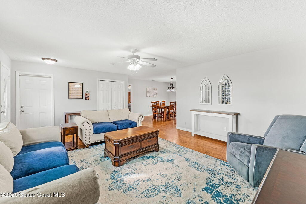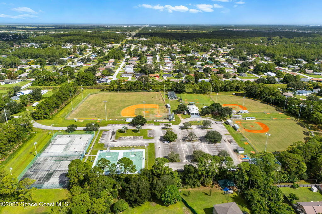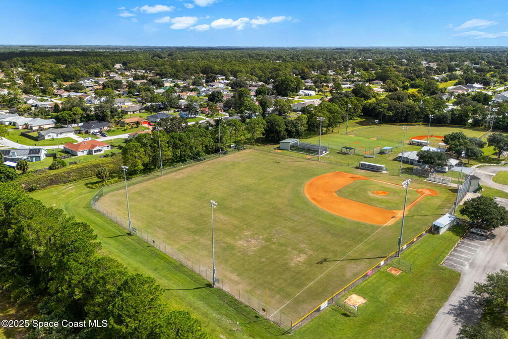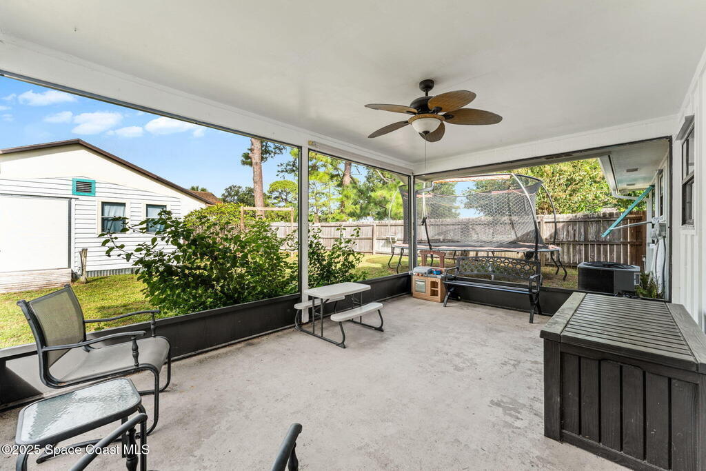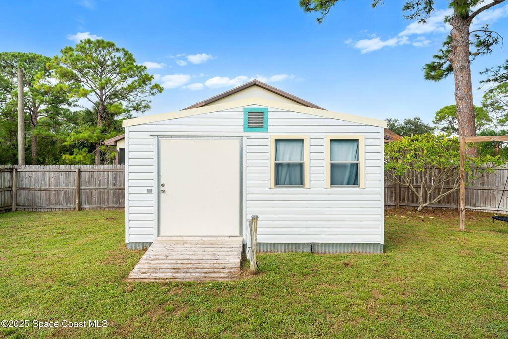 Set on a corner lot in NW Palm Bay, this 1,513 sq ft residence combines open, airy living with thoughtful updates and inviting outdoor spaces. A split floor plan and vaulted ceilings enhance the sense of comfort, while the primary suite stands apart with a walk-in closet and a renovated en-suite featuring a sleek walk-in shower. Durable vinyl plank flooring and granite countertops add modern appeal, complemented by the security of a 2019 roof. Bahama shutters remain in place year-round, offering shade that helps keep interiors cooler in summer while closing easily for hurricane preparation. The fenced backyard offers both privacy and character with mature avocado and banana trees creating a touch of tropical charm. With no HOA restrictions, the property allows freedom and flexibility. Everyday convenience is close at hand with shopping and dining just minutes away, I-95 access nearby, and the Atlantic shoreline in Melbourne Beach and Indialantic less than a 20-minute drive.