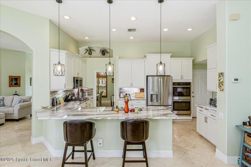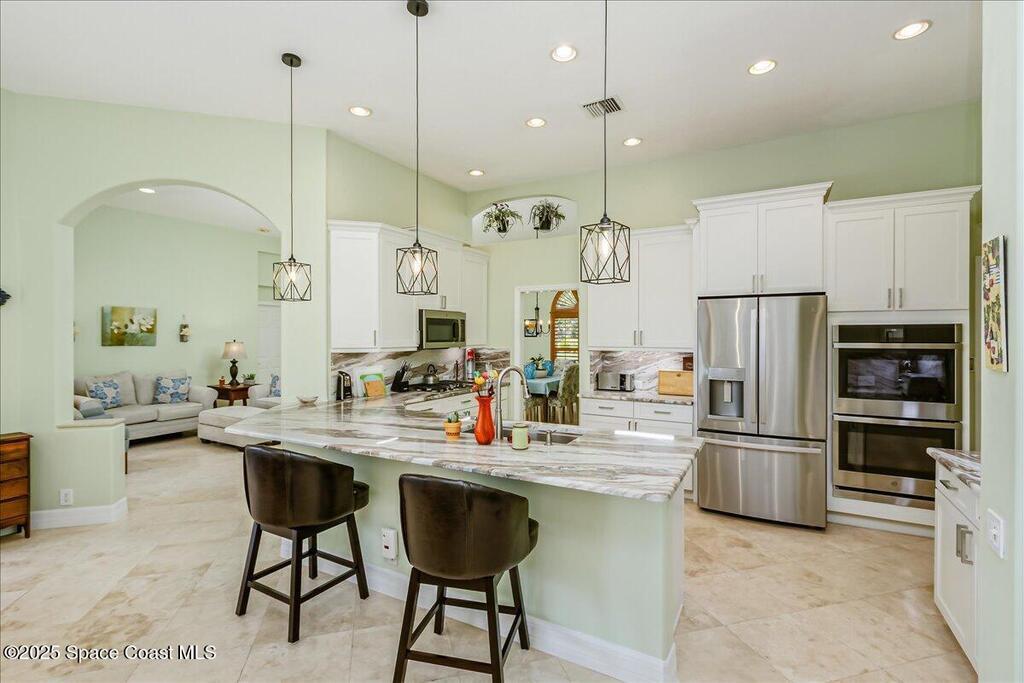 PRICE REDUCED AGAIN! MOTIVATED SELLER!! Wow take a look! All the work is done in this 4 bdrm/3 bath renovated home on the 8th TEE at the Baytree National Golf Course! Awesome view overlooking the heated pool & spa across the pond to the 8th tee! Spacious home with higher ceilings, open floor plan, split bedrms. All tile floors thruout! There is a long list of upgrades including recent (extra wide) paver driveway/patio and front entry! All newer windows (2 impact) the rest have accordion shutters. Window coverings are plantation shutters and wood blinds. The recently updated kitchen includes solid wood Shaker style cabinets and granite countertops w/granite backsplash with undermount lighting! Newer pendant lighting too. All newer gas 5 burner Cooktop, French door refrigerator with in-door ice & water, Wifi Self cleaning Double wall oven with convection & Air fryer built in! Newer OTR microwave, Garbage disposal & sink.