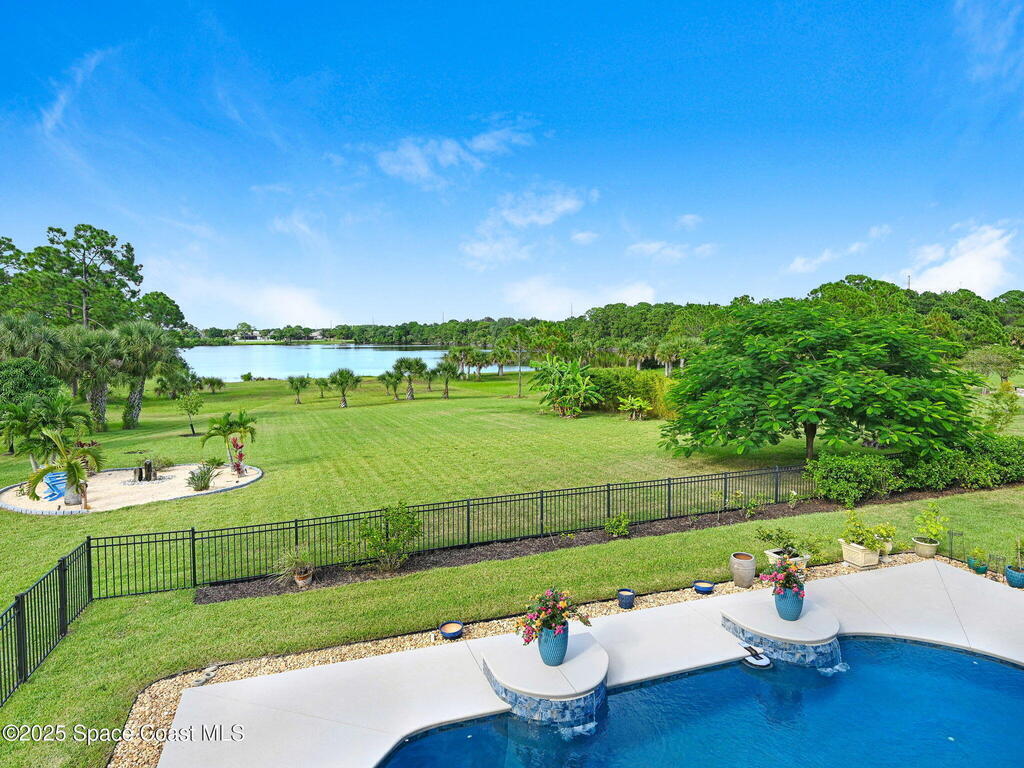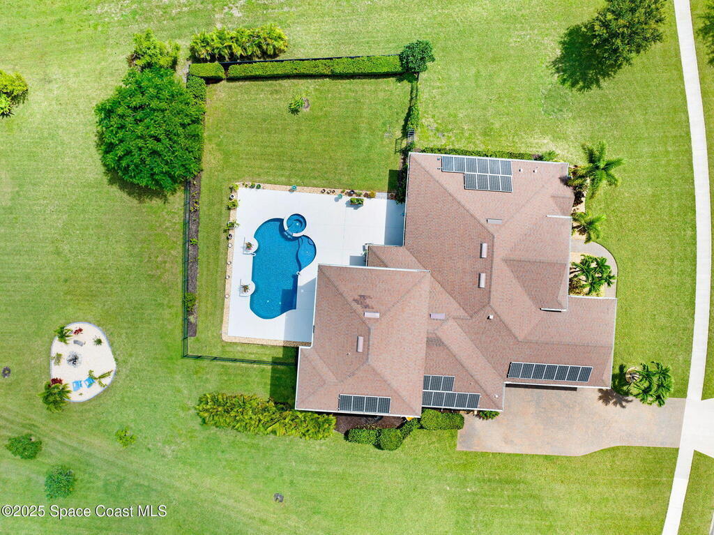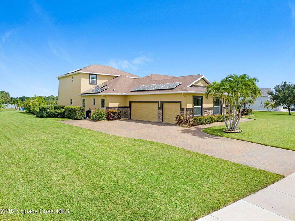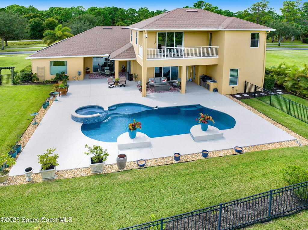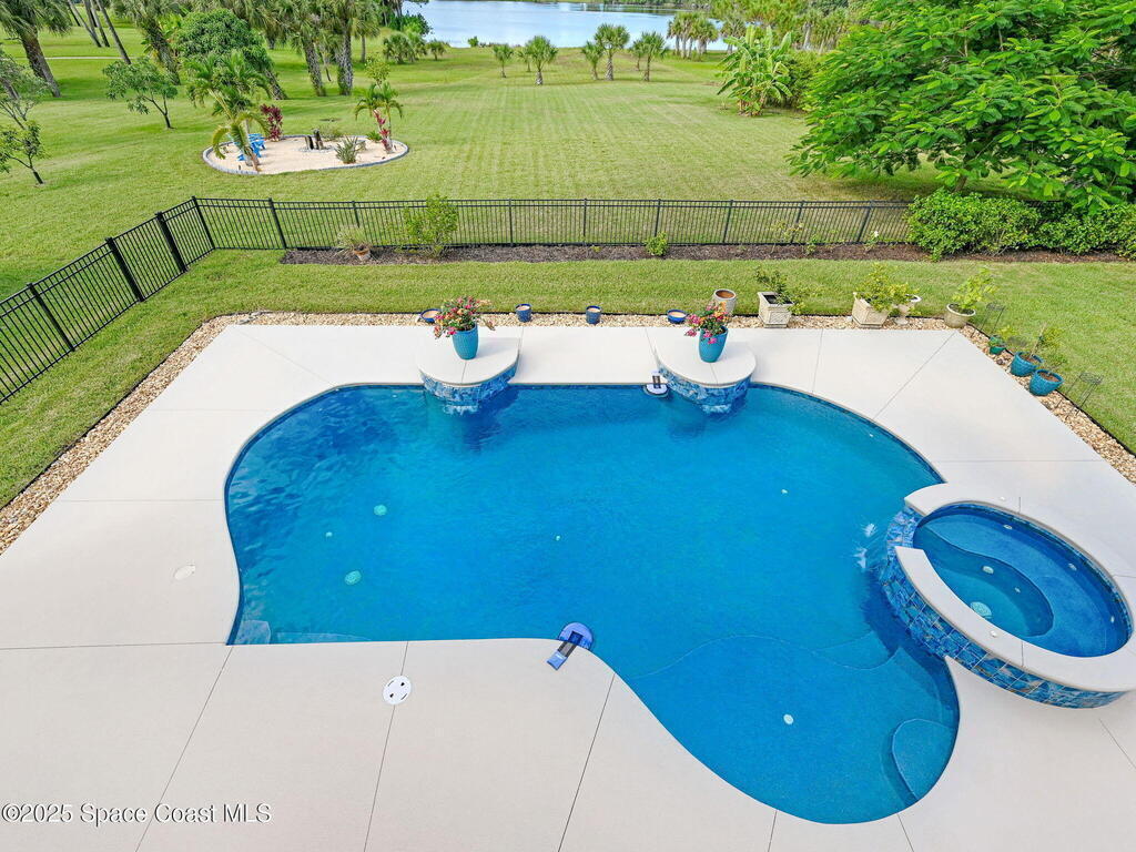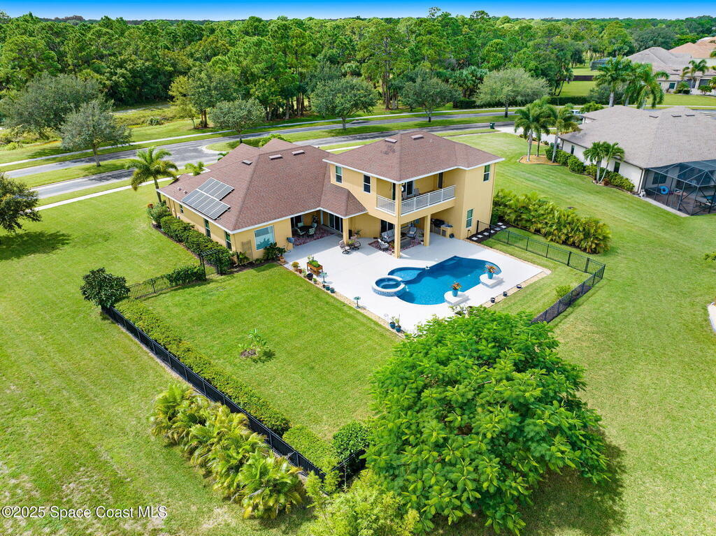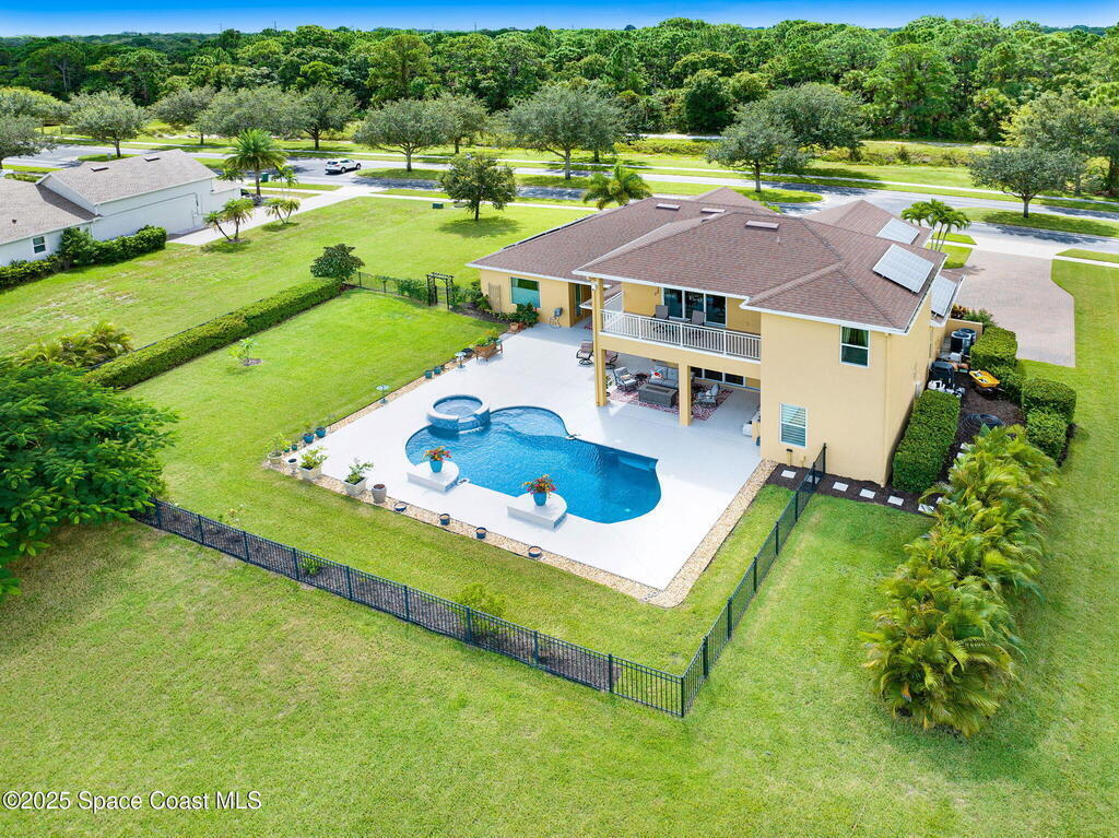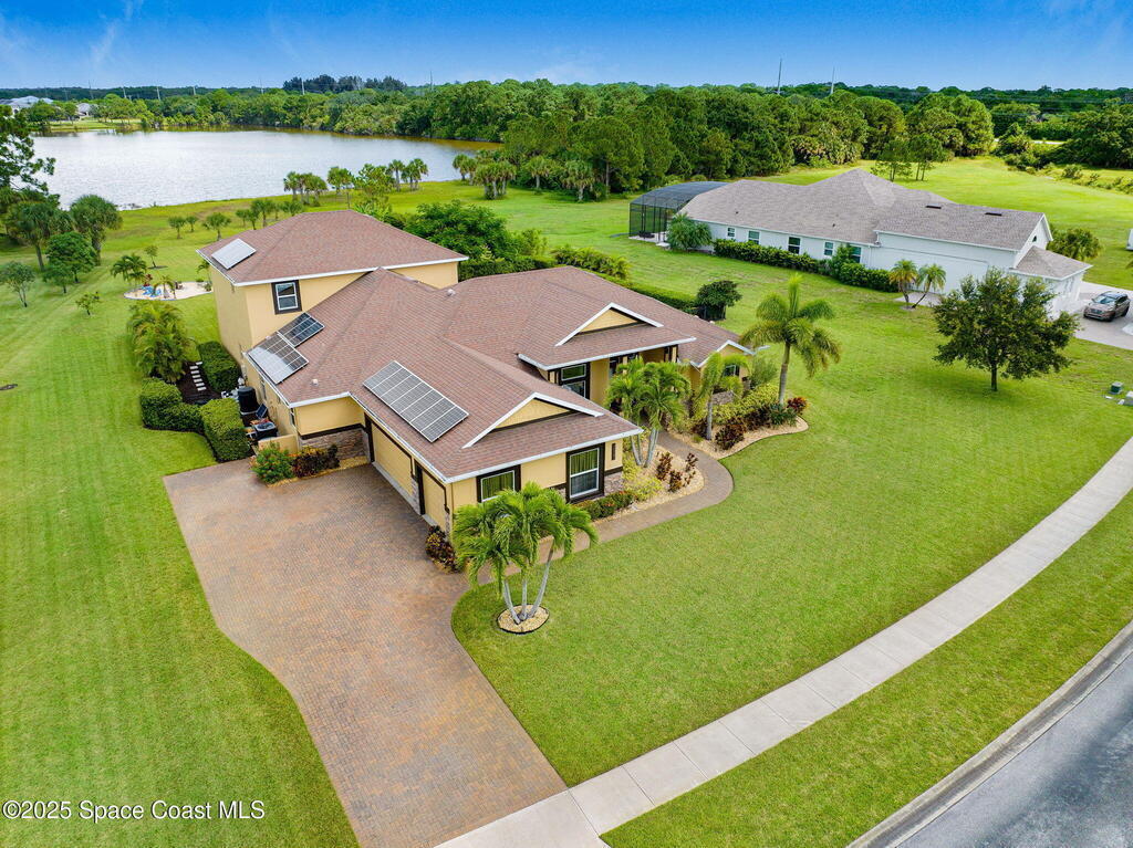 Want to own THE MODEL HOME in the neighborhood? Situated on ONE FULL ACRE and a NATURAL LAKE, this 4 BEDROOM, 4 BATH 3,700 sqft home is FENCED-IN and features a NEW SALT WATER, HEATED POOL (2023) and many UPGRADES. Updates and upgrades in this ENERGY-EFFICIENT CONCRETE BLOCK home include: NEW HVAC (2025), Cambria QUARTZ countertops, HURRICANE IMPACT sliders, $10,000 WALNUT ISLAND, interior and EXTERIOR REPAINT (2025), EV CHARGER for electric cars, REMOTE-CONTROLLED BLINDS, electric HEATED TOWEL BARS on SMART switch (2023), KASA SMART switches, EUFY doorbell and SMART thermostat, AMCREST security cameras, SOLAR PANELS (fully paid for!), double pane LOW-E WINDOWS with HURRICANE SHUTTERS, and NEW IRRIGATION pump (2024). Your own BANANA and MANGO TREES are in the backyard! PRIMARY bedroom is DOWNSTAIRS. Laundry room has ADDITIONAL CABINETRY. Second floor can be utilized as an ''apartment suite'' for multi-generational living or as a GAME ROOM. This gorgeous home is NOT IN A FLOOD ZONE.