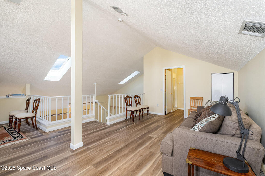 LARGE, lovely, bright and beautifully updated top floor lakefront condo unit with STORAGE GALORE, nestled in an immaculately maintained, tranquil wooded area in Melbourne yet close to all stores and major roadways. 3 large bedrooms with 2 full baths downstairs and a HUGE loft area upstairs with a full bath and closets has endless possibilities. Soaring cathedral ceilings with skylights! Master bedroom and guestroom with walk in closets with the 3rd having a double sized closet. Wall to wall windows and sliders provides endless lakefront views throughout unit. Updated kitchen and baths. Spacious dining area. New flooring. New accordion blinds. all window treatments, light fixtures and washer and dryer stay. Unit also provides a 1 car garage and assigned parking space with plenty of room for guests. Community pool. All for under 240,000!!!!!!!! Come see for yourself. What an incredible buy.