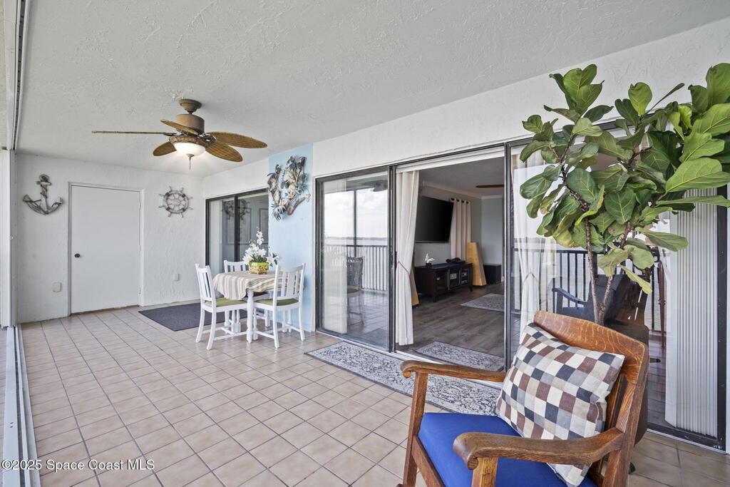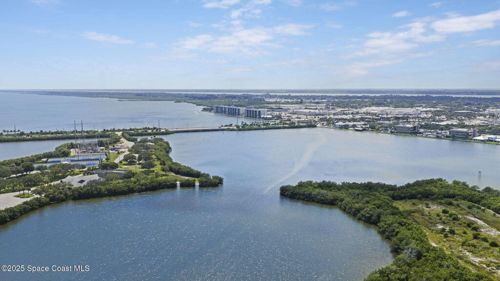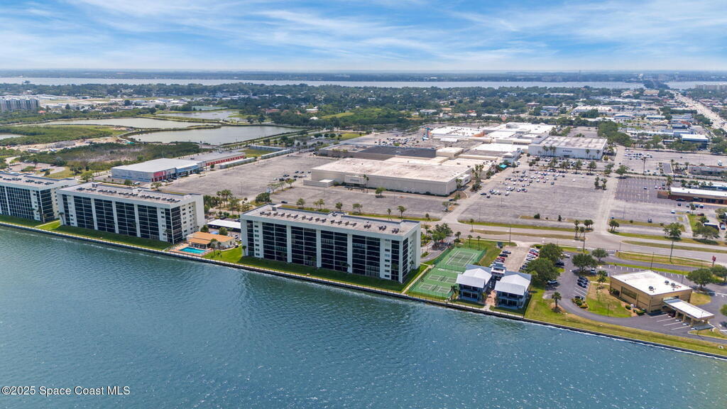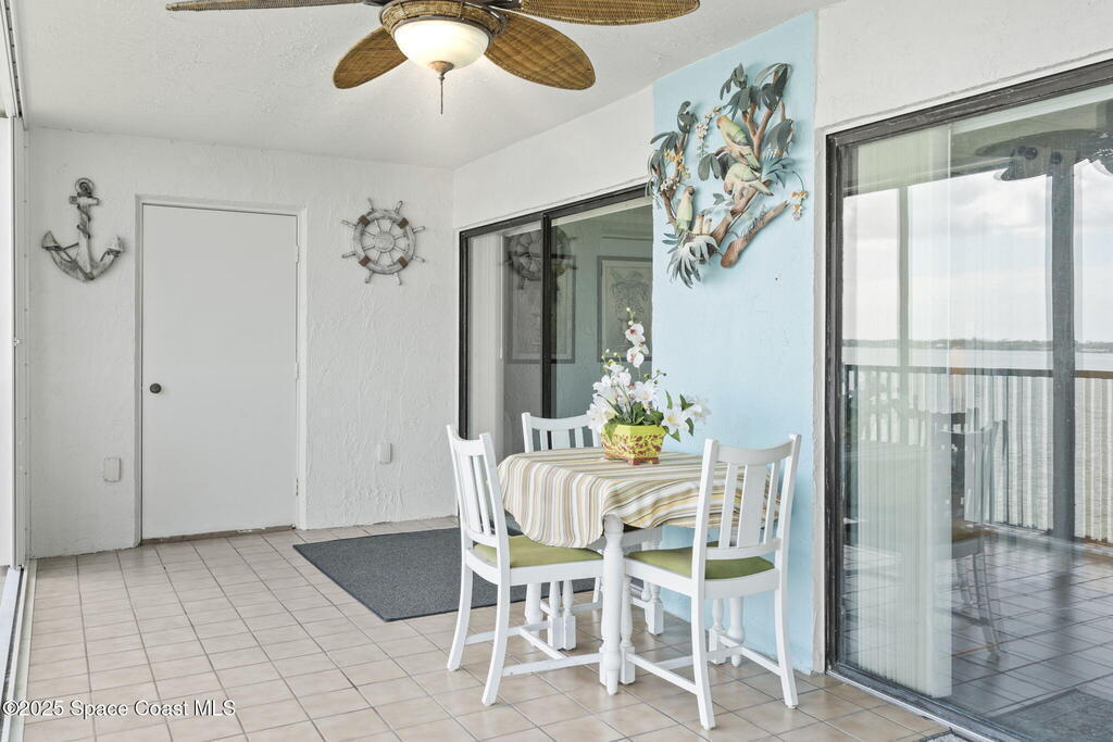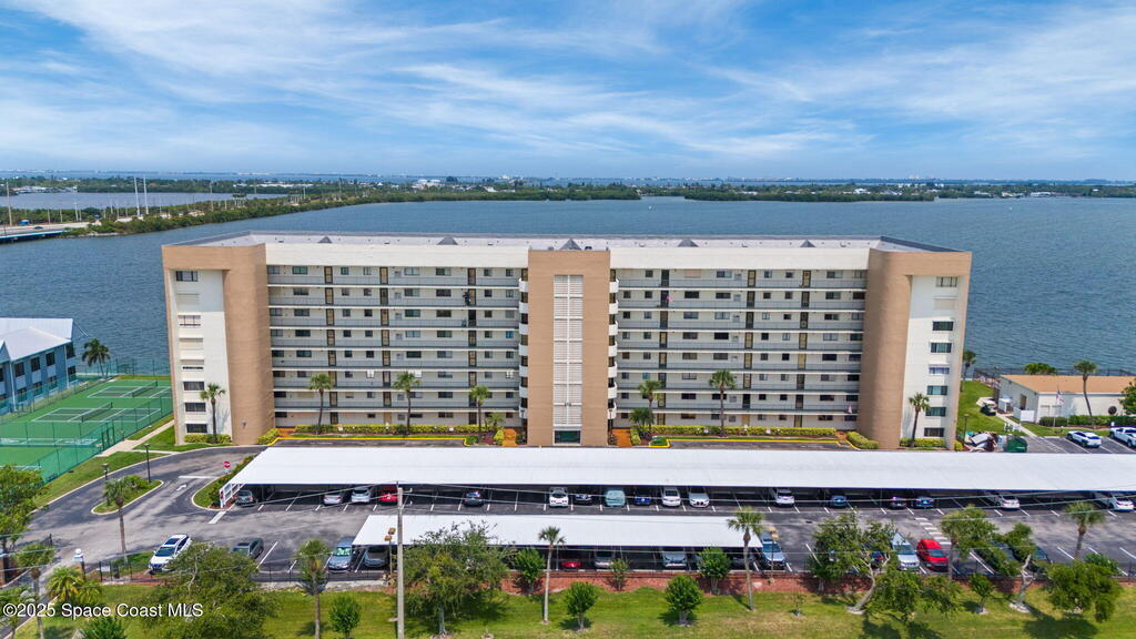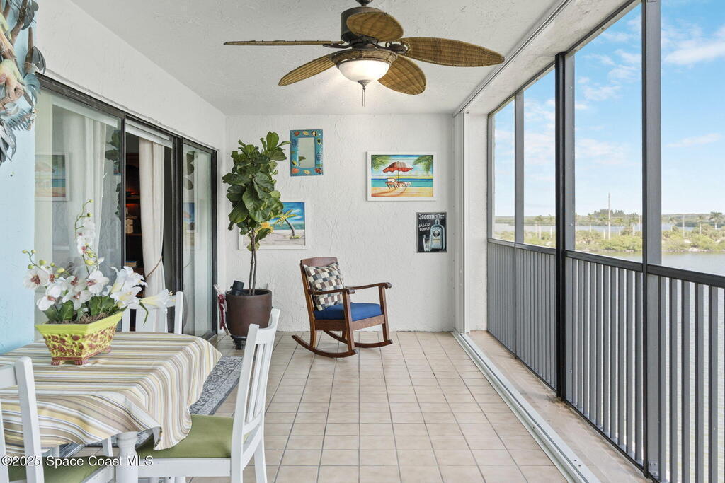 Updated 5th floor condo at Merritt Towers with direct panoramic views of Sykes Creek. Enjoy coastal breezes and watch rocket launches from your own balcony! Inside you'll find a thoughtfully updated kitchen with modern finishes, an open layout, designer pocket door at the laundry room and custom lighting. Additional design features include crown molding, elegant tiled showers, luxury vinyl plank flooring and built-in bar area. For your convenience and safety the front windows have hurricane panels and the balcony has accordion style hurricane shutters. This well-managed community offers great amenities including two waterside pools, tennis and pickleball courts, shuffleboard, riverfront boardwalk, sauna, clubhouse and more! Condo fees cover all utilities except electric. Recent building updates include new elevators, concrete and balcony restoration. All assessments have been paid in full.