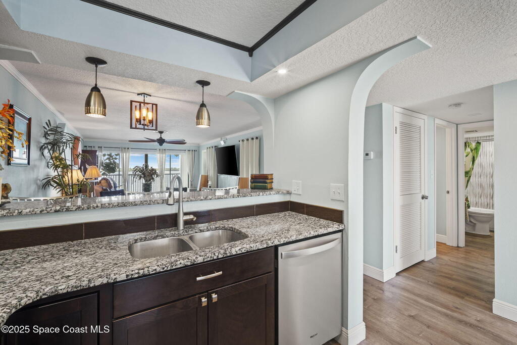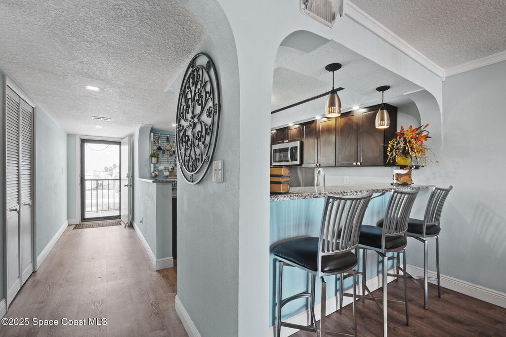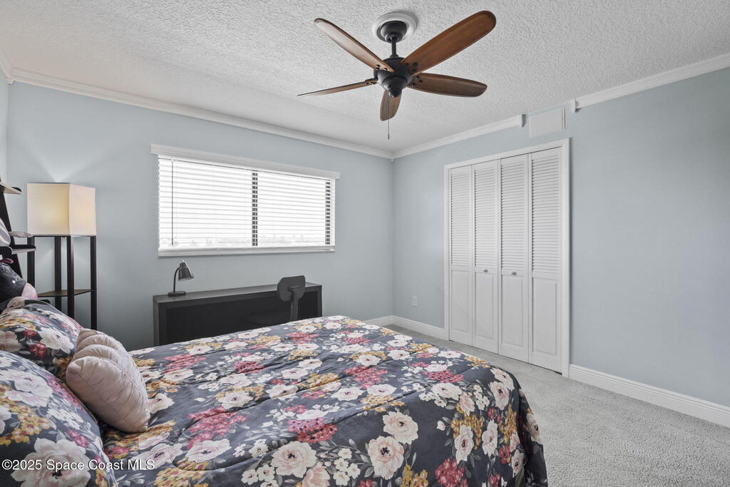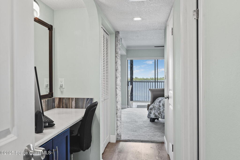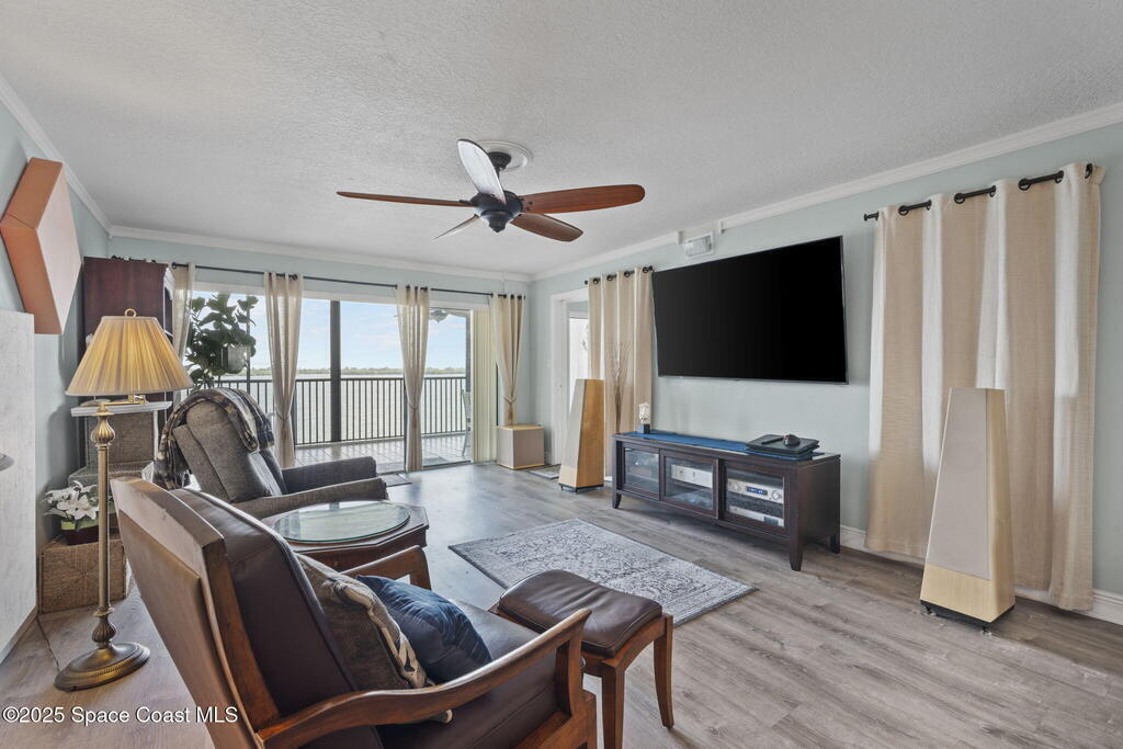 Updated 5th floor condo at Merritt Towers with direct panoramic views of Sykes Creek. Enjoy coastal breezes and watch rocket launches from your own balcony! Inside you'll find a thoughtfully updated kitchen with modern finishes, an open layout, designer pocket door at the laundry room and custom lighting. Additional design features include crown molding, elegant tiled showers, luxury vinyl plank flooring and built-in bar area. For your convenience and safety the front windows have hurricane panels and the balcony has accordion style hurricane shutters. This well-managed community offers great amenities including two waterside pools, tennis and pickleball courts, shuffleboard, riverfront boardwalk, sauna, clubhouse and more! Condo fees cover all utilities except electric. Recent building updates include new elevators, concrete and balcony restoration. All assessments have been paid in full.