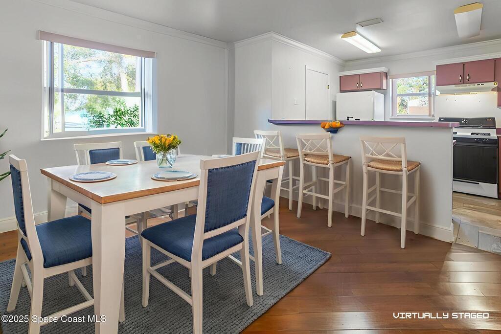 Welcome to this charming 4-bedroom, 2 bathroom home in the heart of Titusville! With an open-concept kitchen and living space, this home offers a seamless flow, ideal for entertaining and gatherings. The kitchen boasts a gas stove, providing efficient cooking, while the adjoining living area is perfect for relaxing after a long day. The metal roof, just 3 years old, ensures durability and hurricane shutters add to peace of mind for years to come. A metal 1-car carport offers convenient parking, and the home has been freshly painted inside and ready for you to move in. The wood floors add a warm touch throughout, complementing the home's inviting feel. The HVAC system, only 5.5 years old, keeps you comfortable year-round, while the gas dryer and water heater are both efficient and reliable. This home is a perfect blend of comfort and convenience. Don't miss the opportunity to make this your new home!