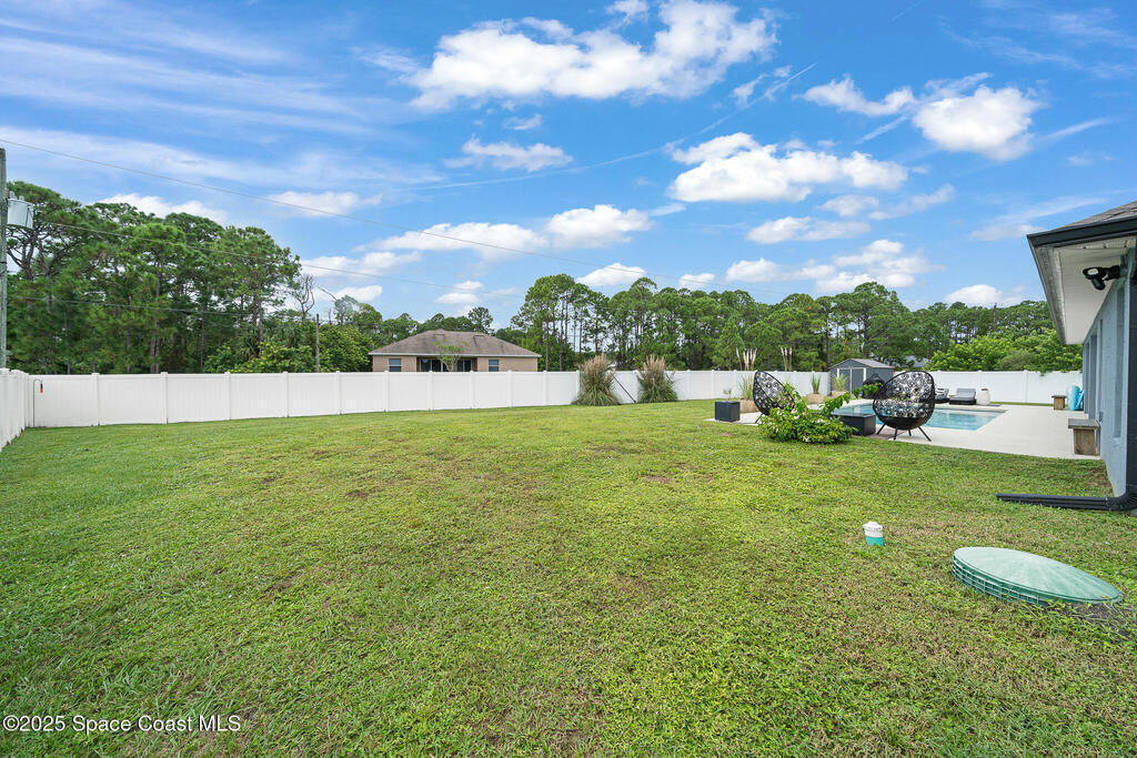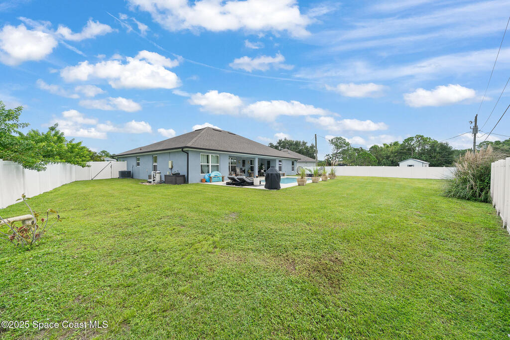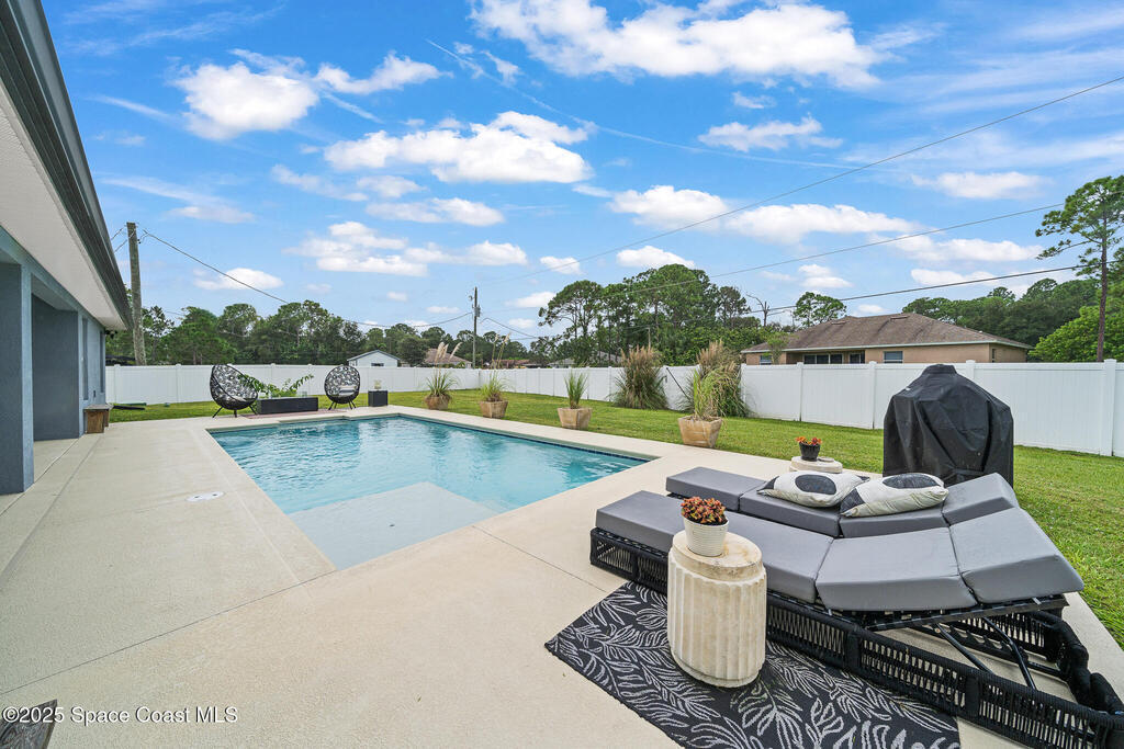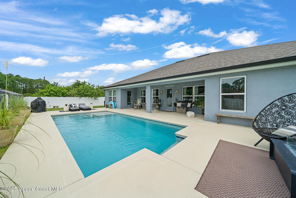 Better than new home with designer features, a POOL and NO HOA! Split floor plan with the primary and guest bedroom overlooking the pool, two more guest bedrooms on a separate hall. Primary bathroom with 2 sinks, separate soaking tub and shower, and 2 walk in closets. Versatile floor plan with a formal living room and dining room with high ceilings. The kitchen is open to the family room and both have views of the pool and fully fenced backyard. Breakfast bar and eat in kitchen nook for entertaining. Dreamy lanai for relaxing next to the salt water pool and expansive backyard. The spacious laundry room leads to an ample 2 car garage. Tucked away in Port Malabar conveniently located near schools, shops and restaurants.