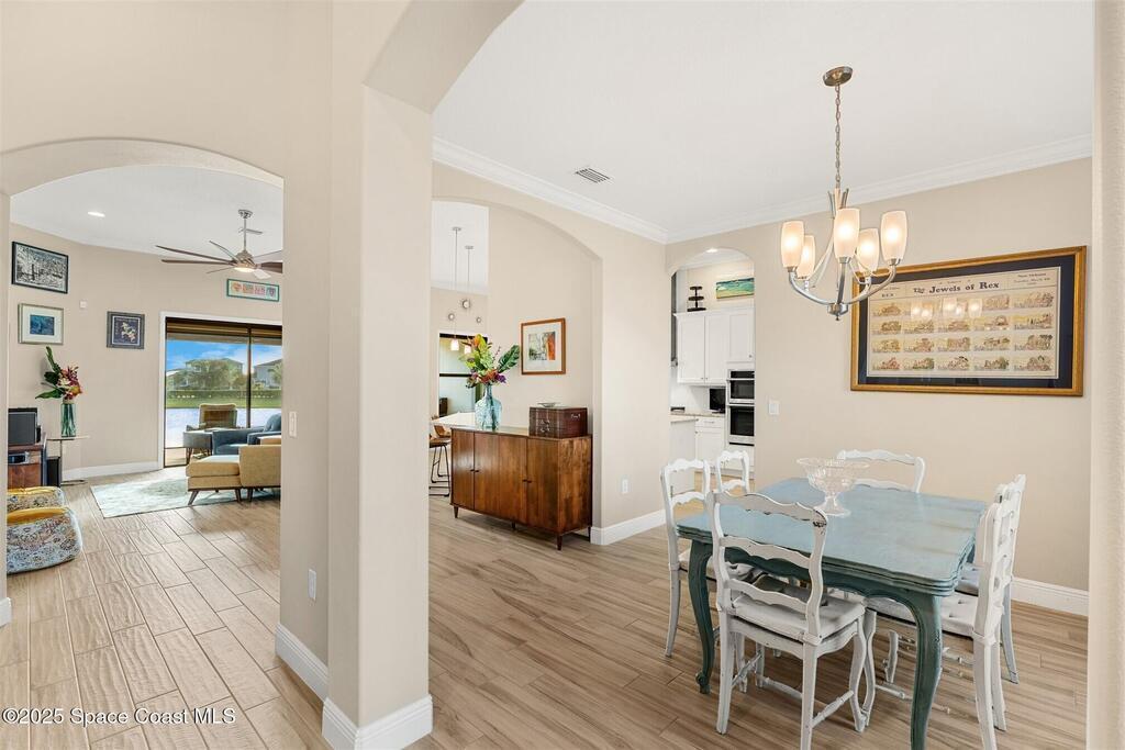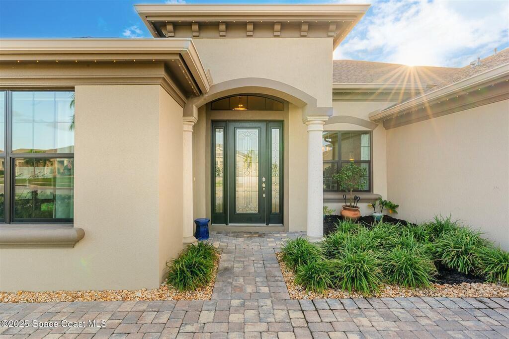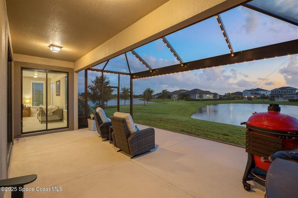 Enjoy gorgeous lakefront views in this meticulously maintained contemporary CBS home in the sought-after gated community of Stonecrest at Viera. Located on one of the larger lots in the neighborhood, this house boasts double water views. Decorating for the seasons is as easy as pushing a button with the exterior custom lighting system. A glass-door entryway welcomes you into the open floorplan, with a formal dining room and flex/bonus room to either side of the foyer. Natural light from large double pane windows guide you through to the kitchen, great room, and breakfast nook. At the heart of the home, the light and bright kitchen offers stainless steel appliances, a vented hood, gas range, convention oven, a breakfast bar and pantry. Move through the 8 ft. sliders to the extended screened patio and take in the sparkling lake views while cooking on the grill. The expansive primary bedroom with its own sitting area includes a spacious ensuite SEE ''MORE