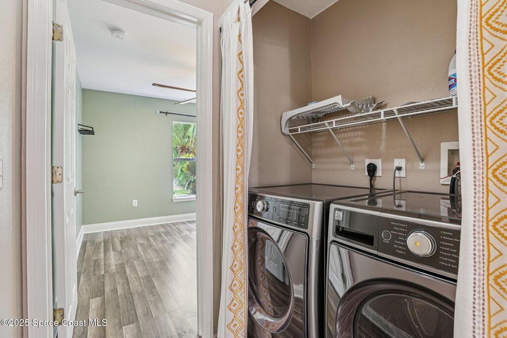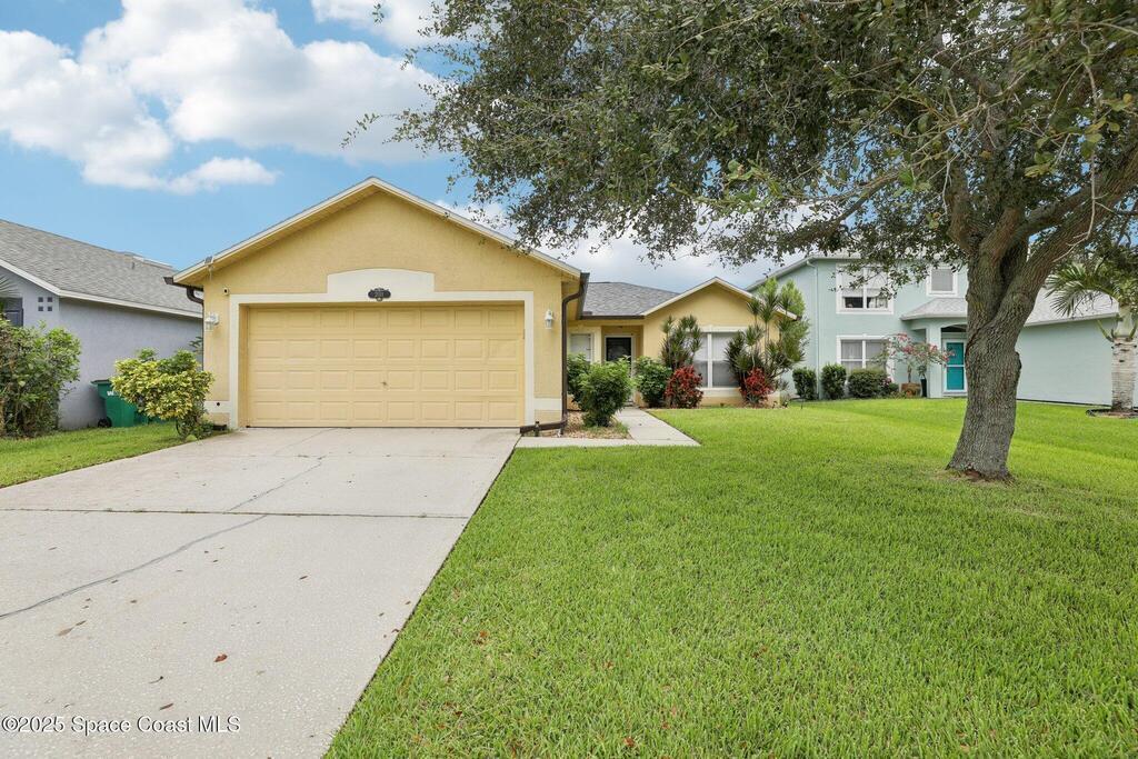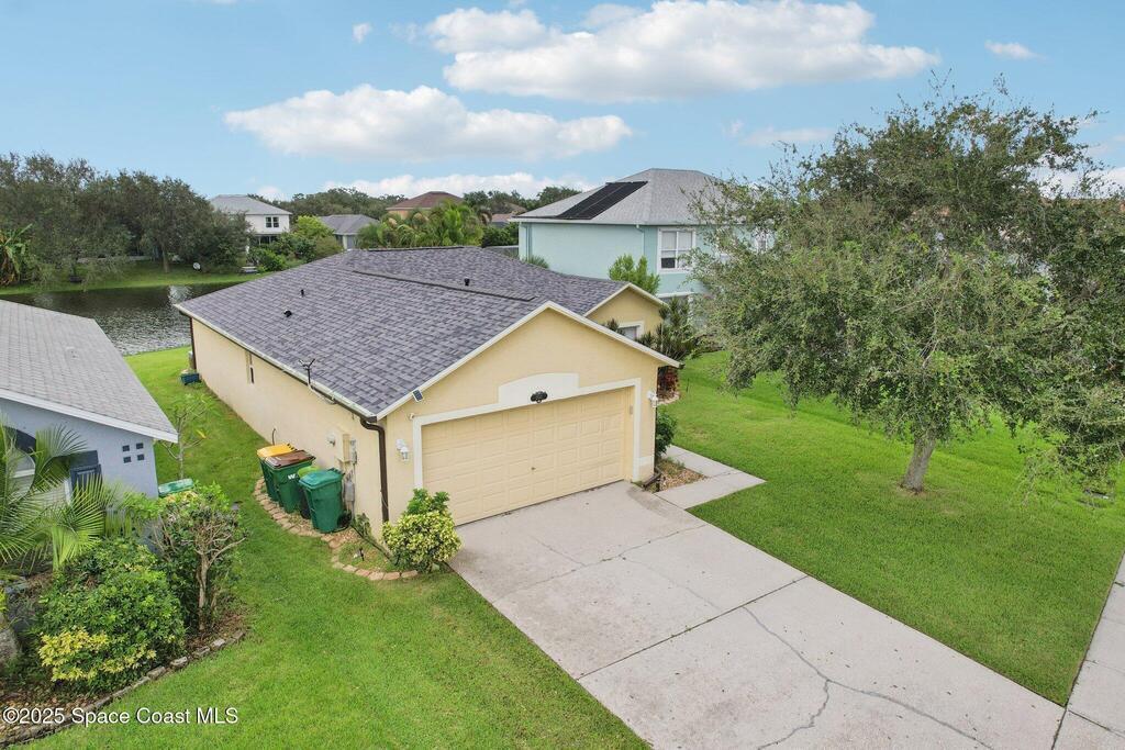 Must-see waterfront home! Beautifully maintained 3-bedroom, 2-bath concrete block home with a 2-car garage located in the highly desired community of Brookshire. This move-in ready home features granite countertops, stylish fixtures, and fresh paint in both bathrooms and two bedrooms. All appliances convey, including the washer and dryer. Additional upgrades include a 2023 reroof, Ring security system with cameras and door/window sensors, storm shutters, new commodes in both bathrooms, and LED permanent outdoor lighting around the entire perimeter. The garage comes equipped with cabinets and shelving for easy organization and extra storage. The community offers a great pool and playground, and the location is unbeatable- just 20 minutes to the beach, 40 minutes to Kennedy Space Center, and a little over an hour to Disney.